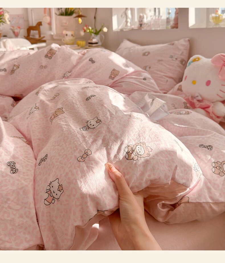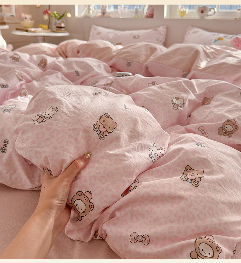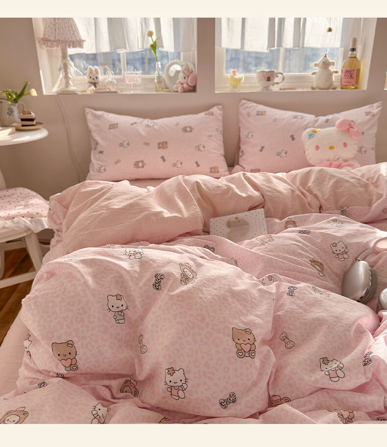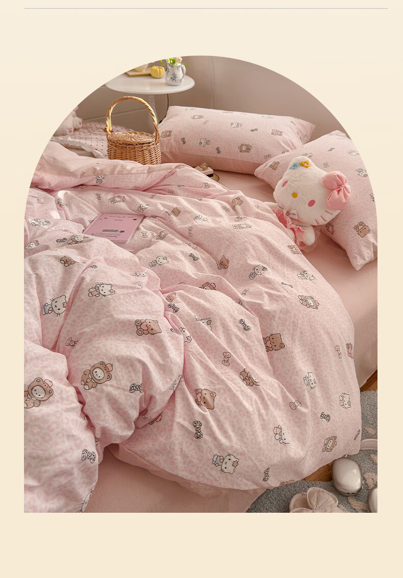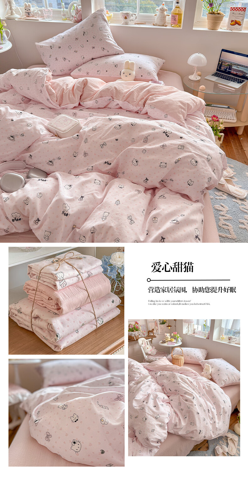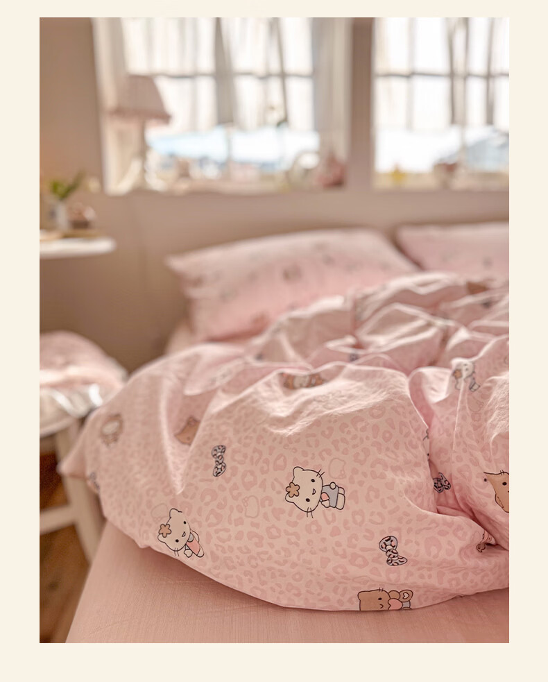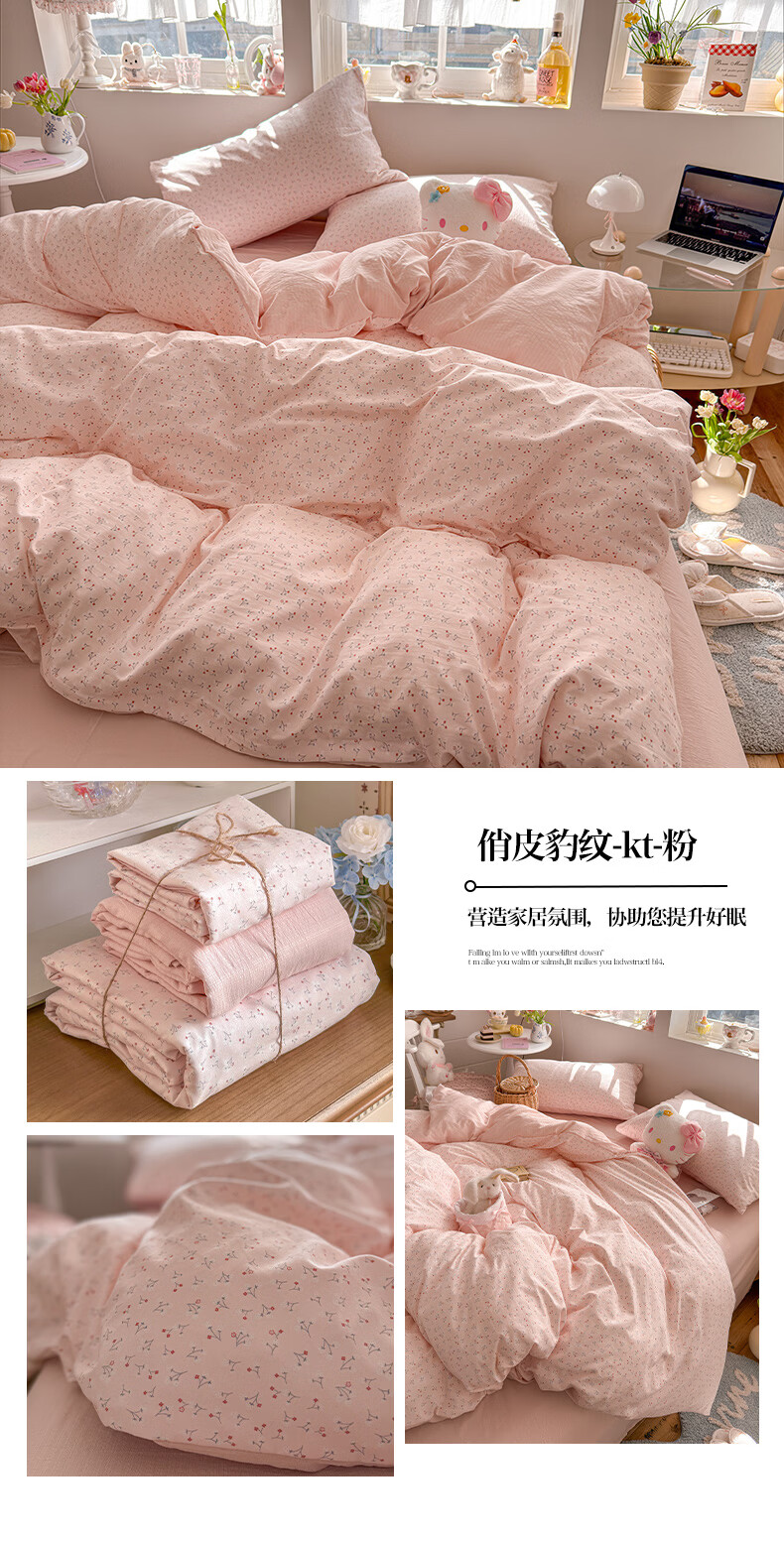 一默四件套2026年A类古法水洗仿棉云感纱被套床单床笠宿舍床上四件套 俏皮豹纹-kt-粉 2.0m床 床单款 (被套200*230cm) 四件套