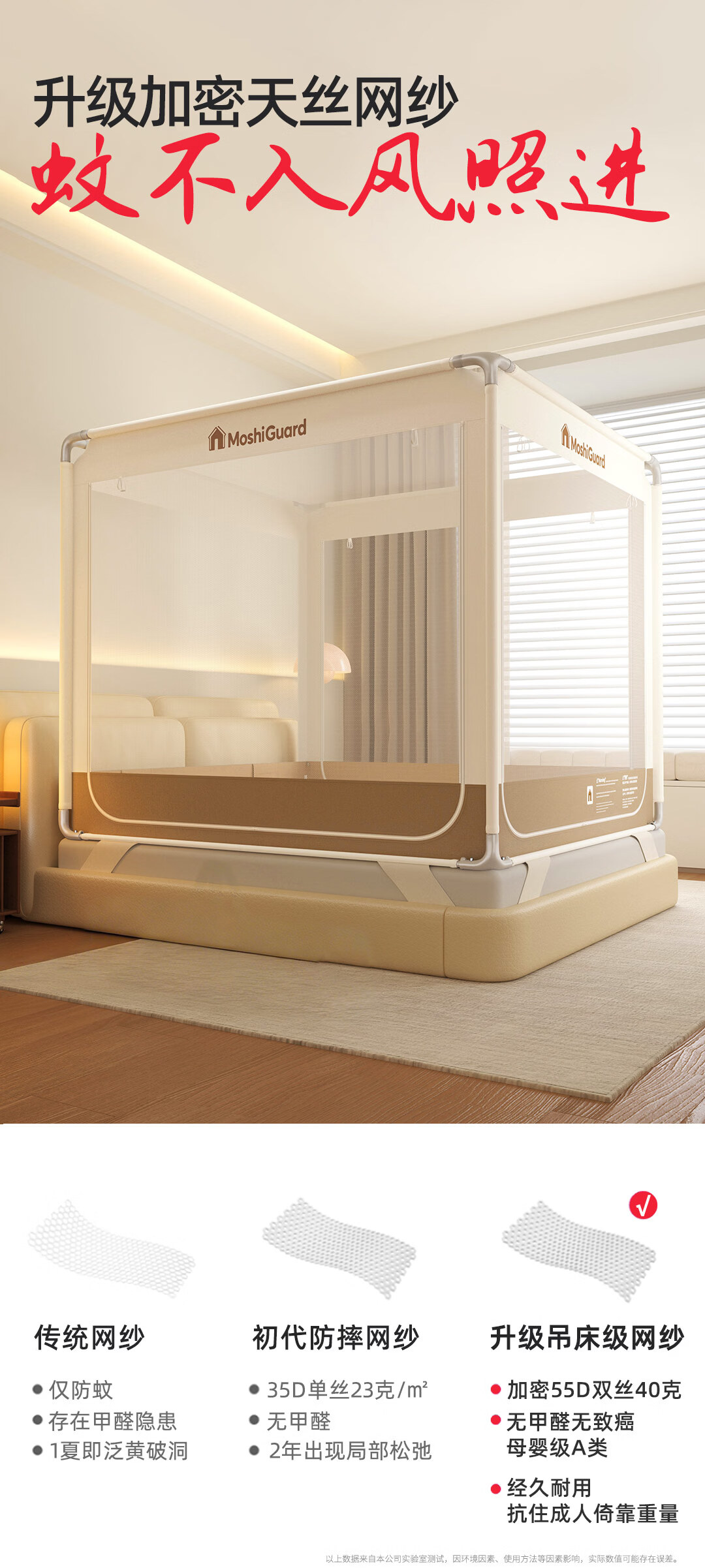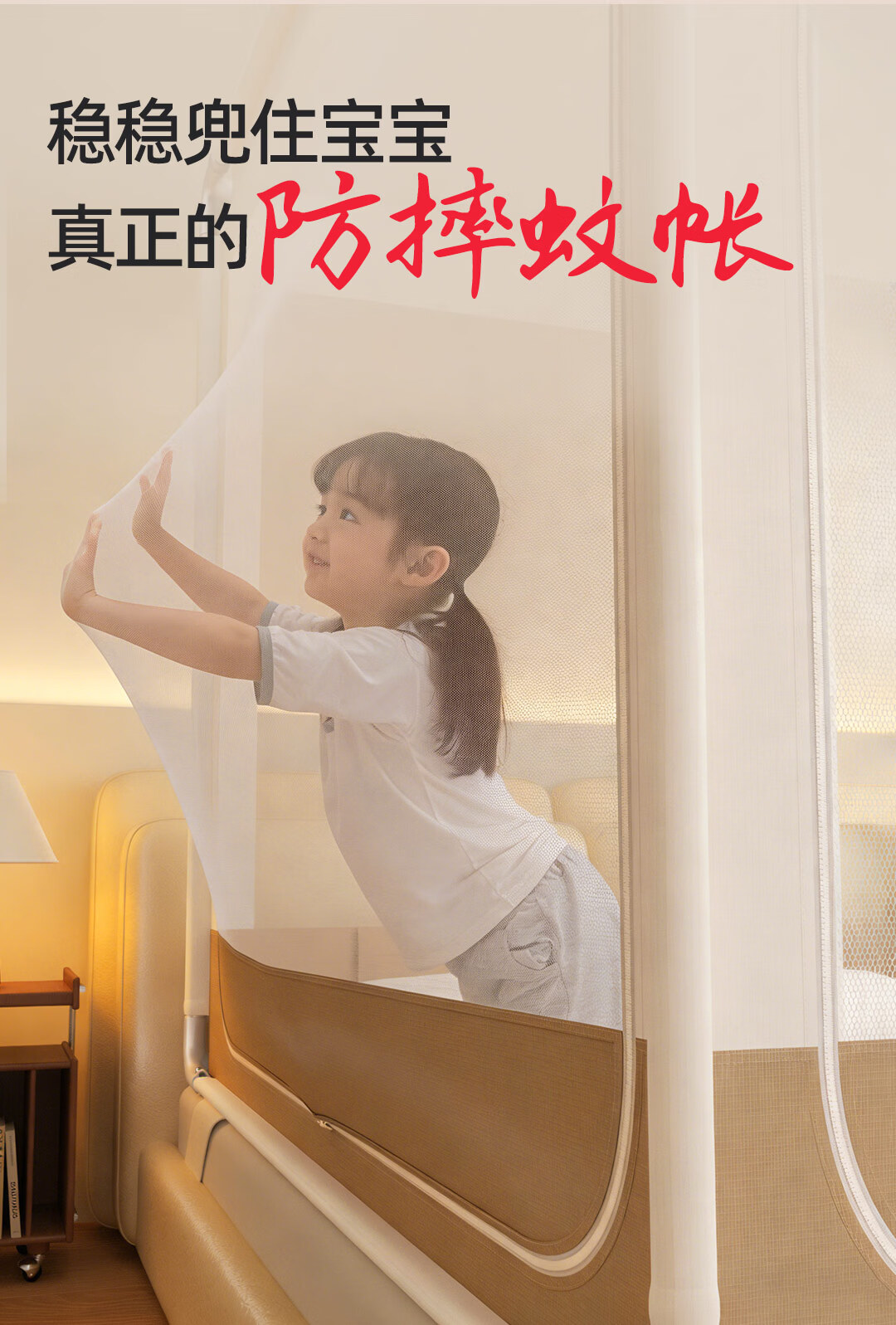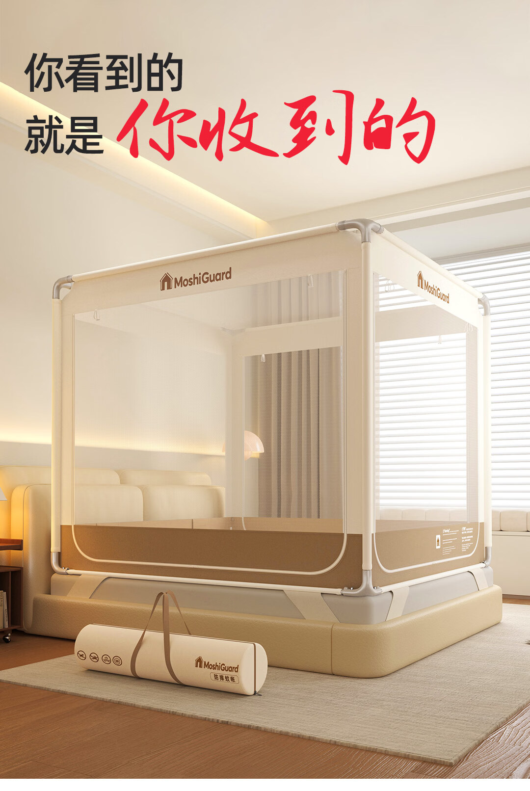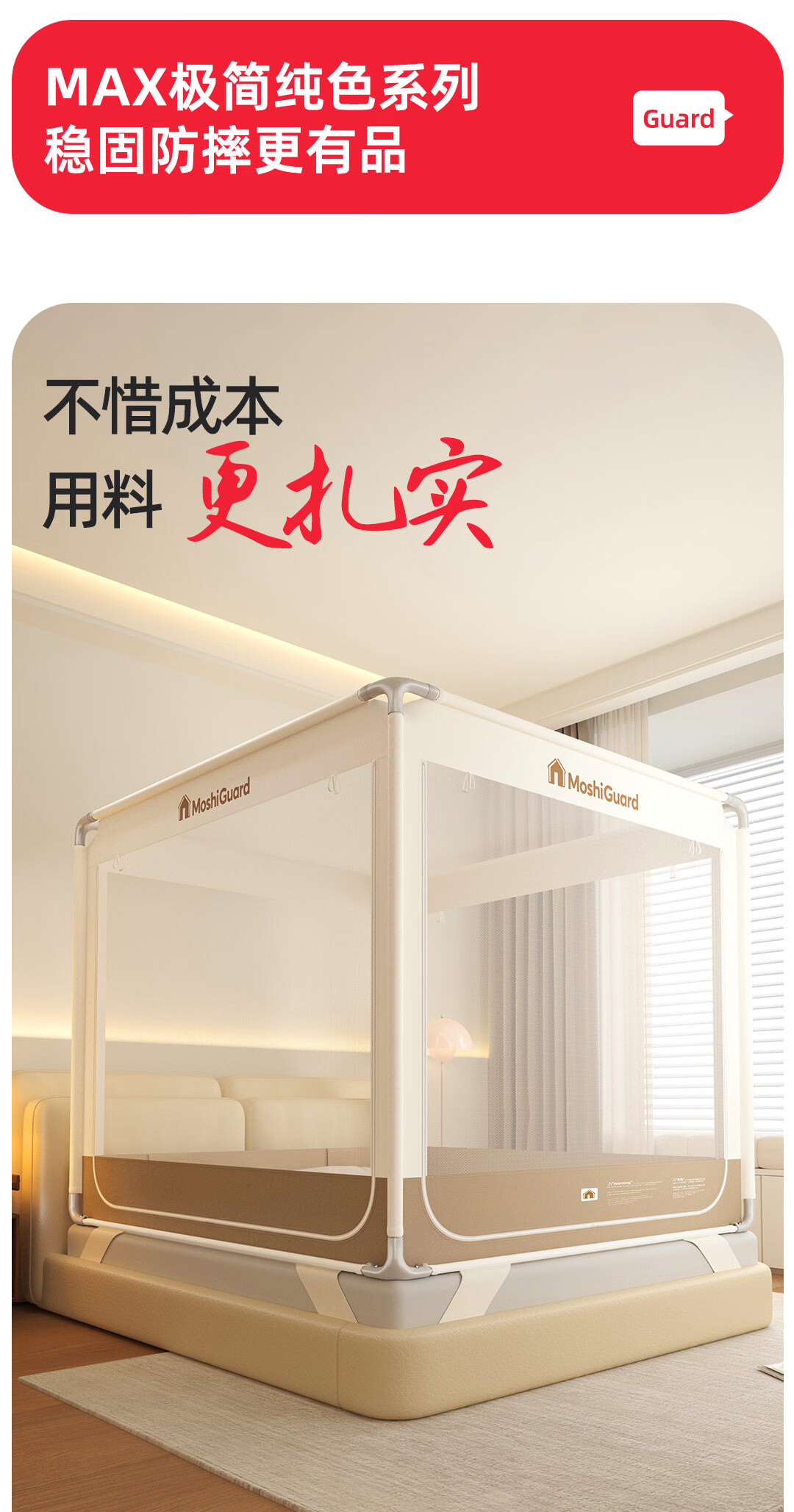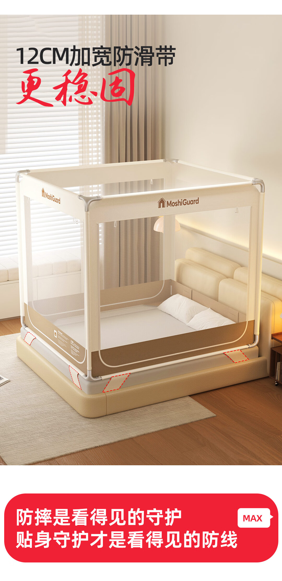 高睿2026新款防摔蚊帐婴儿防止掉床新型稳固支架家用卧室母婴回底坐床 米咖色+绑带【7A级抗菌帐纱】升级防摔蚊帐+防尘顶 适用1.8*2.0m床【大力士三通-免拼接支架】