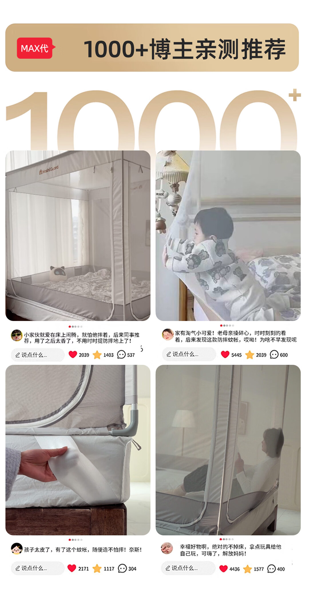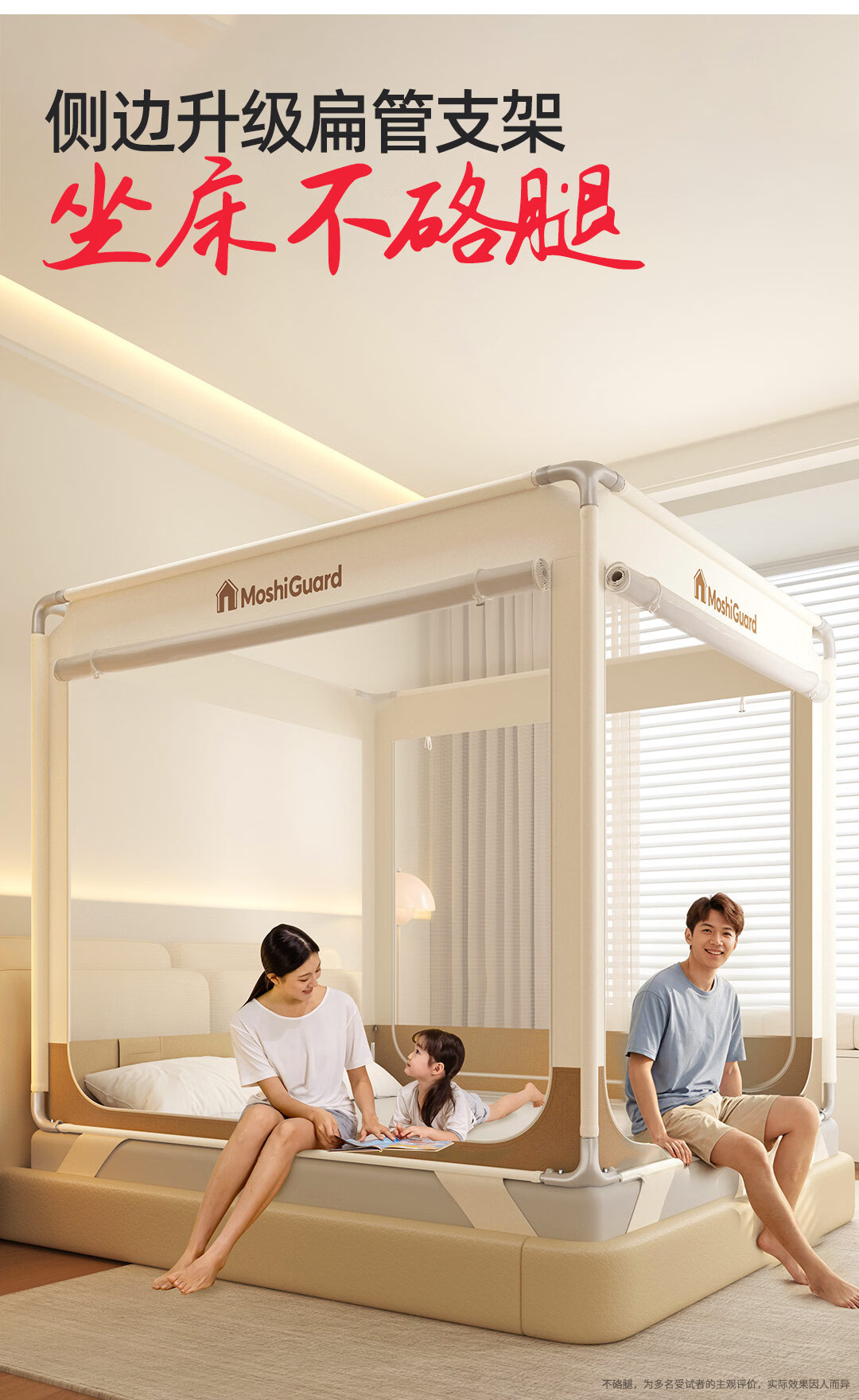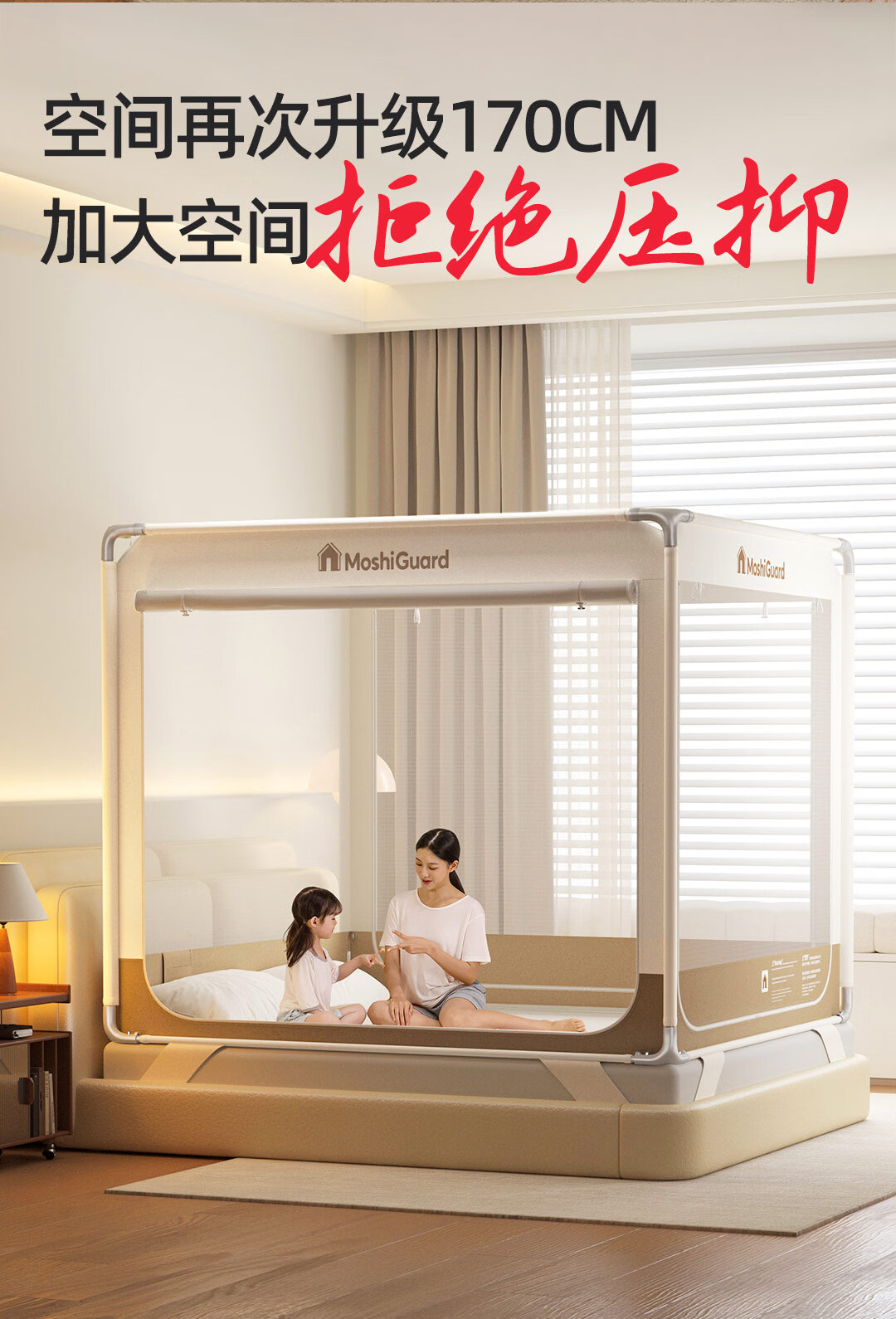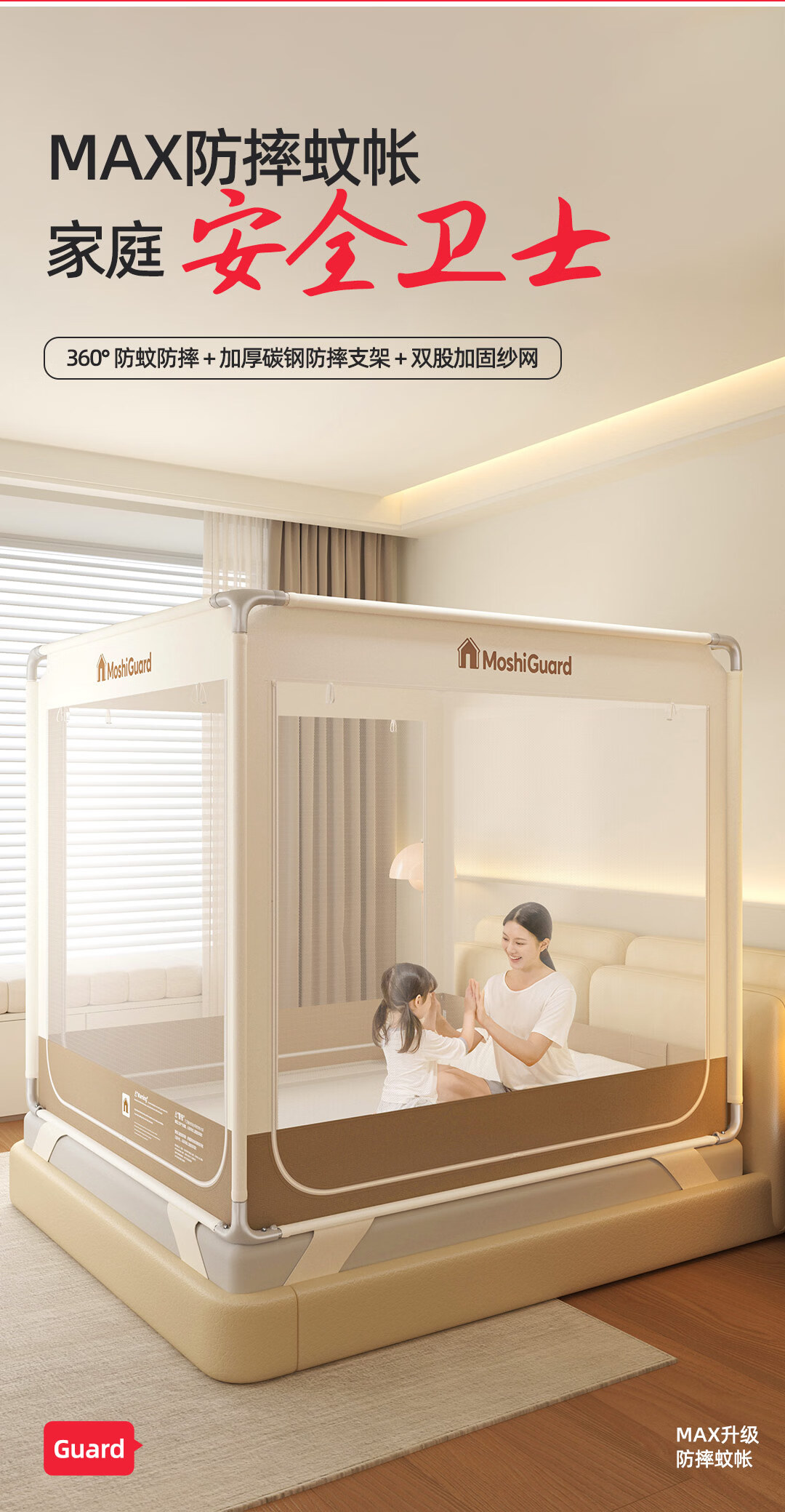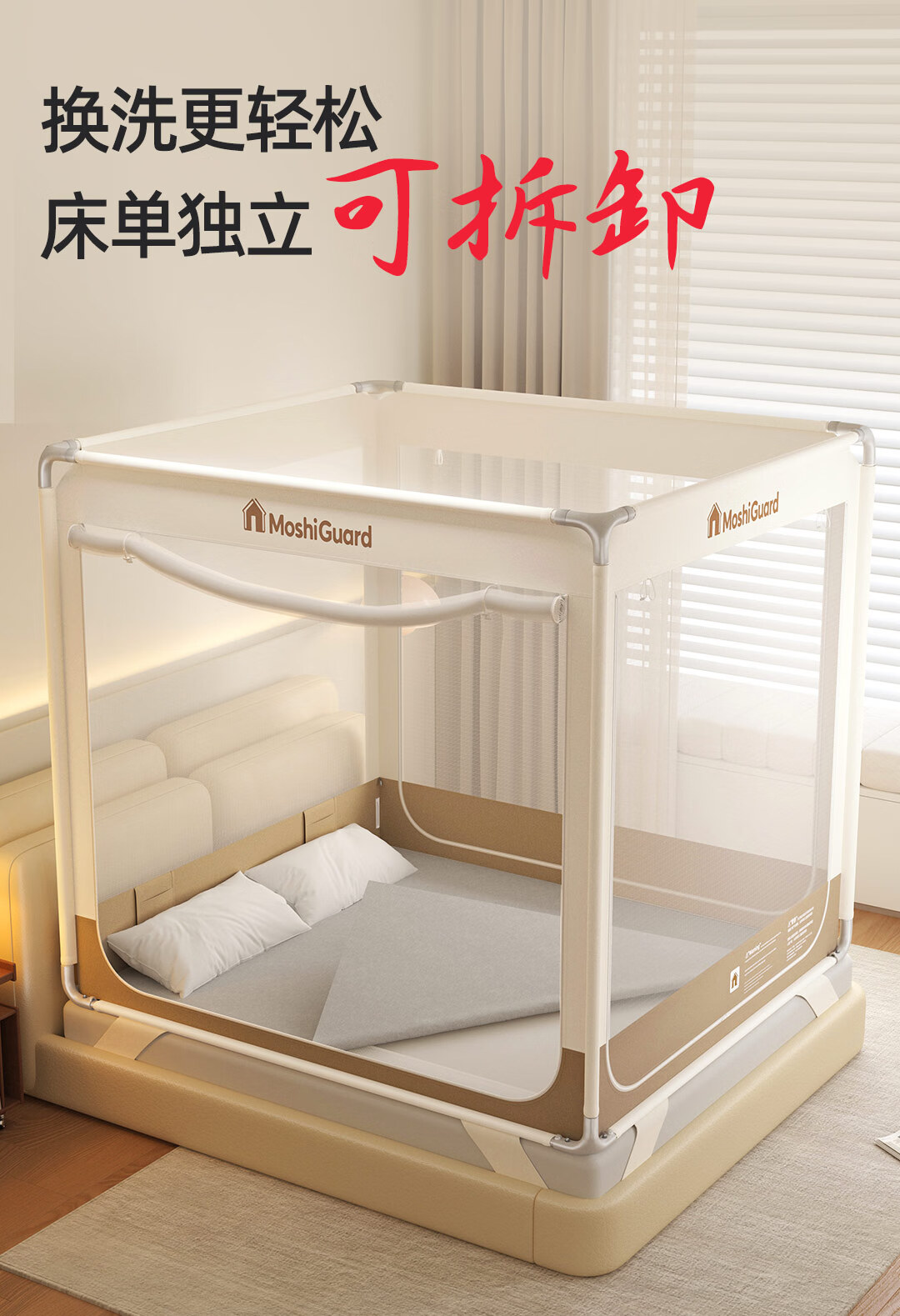 高睿2026新款防摔蚊帐婴儿防止掉床新型稳固支架家用卧室母婴回底坐床 米咖色+绑带【7A级抗菌帐纱】升级防摔蚊帐+防尘顶 适用1.8*2.0m床【大力士三通-免拼接支架】