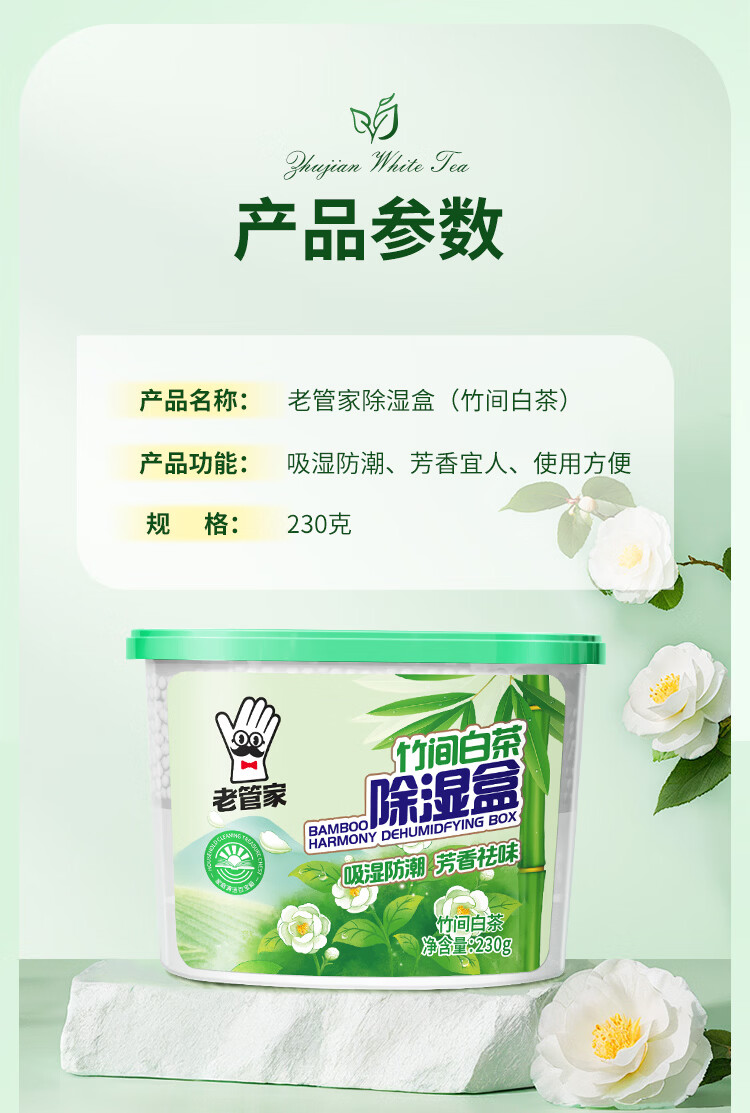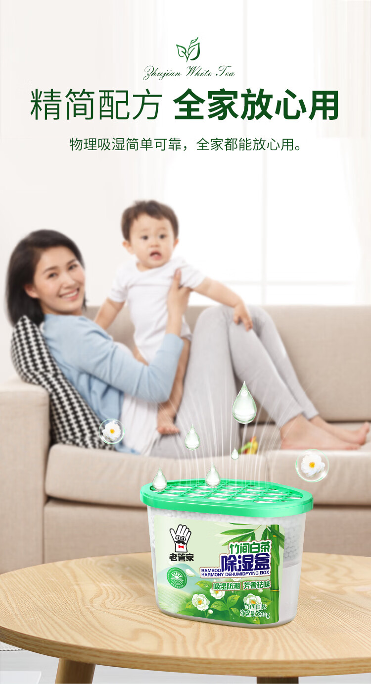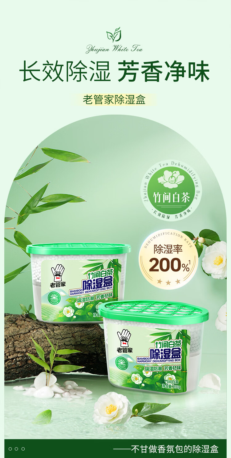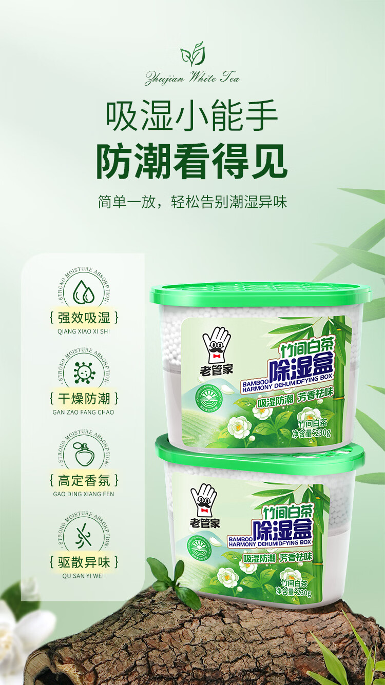 老管家竹间白茶除湿盒230g家用干燥剂室内衣柜房间汽车吸湿袋防霉防潮剂 230g*3盒【日常使用】