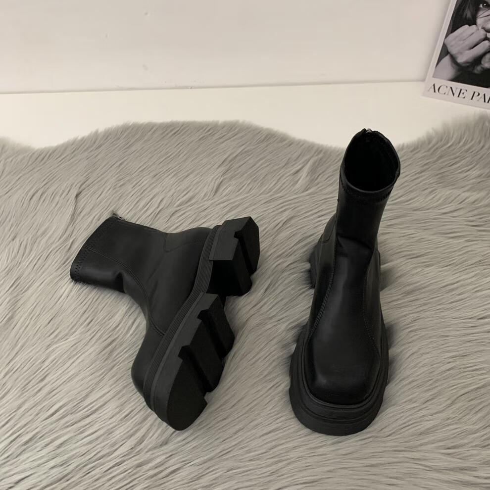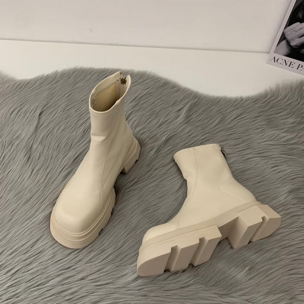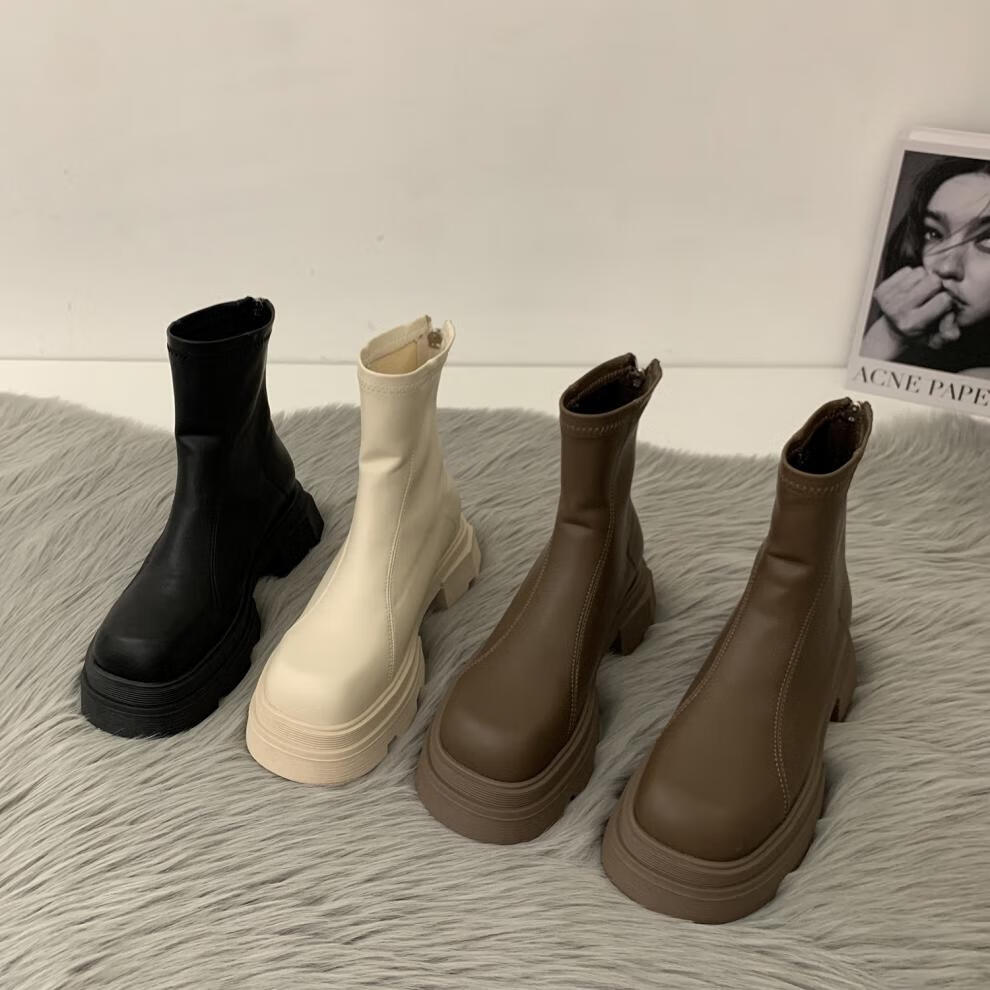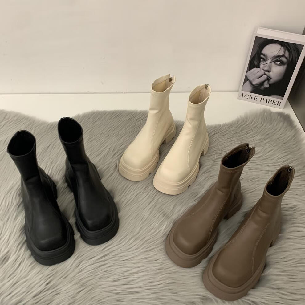 稻草人(MEXICAN)小香风厚底白色方头马丁靴女2026春秋新款韩系高跟瘦瘦真皮小短靴 黑色 35