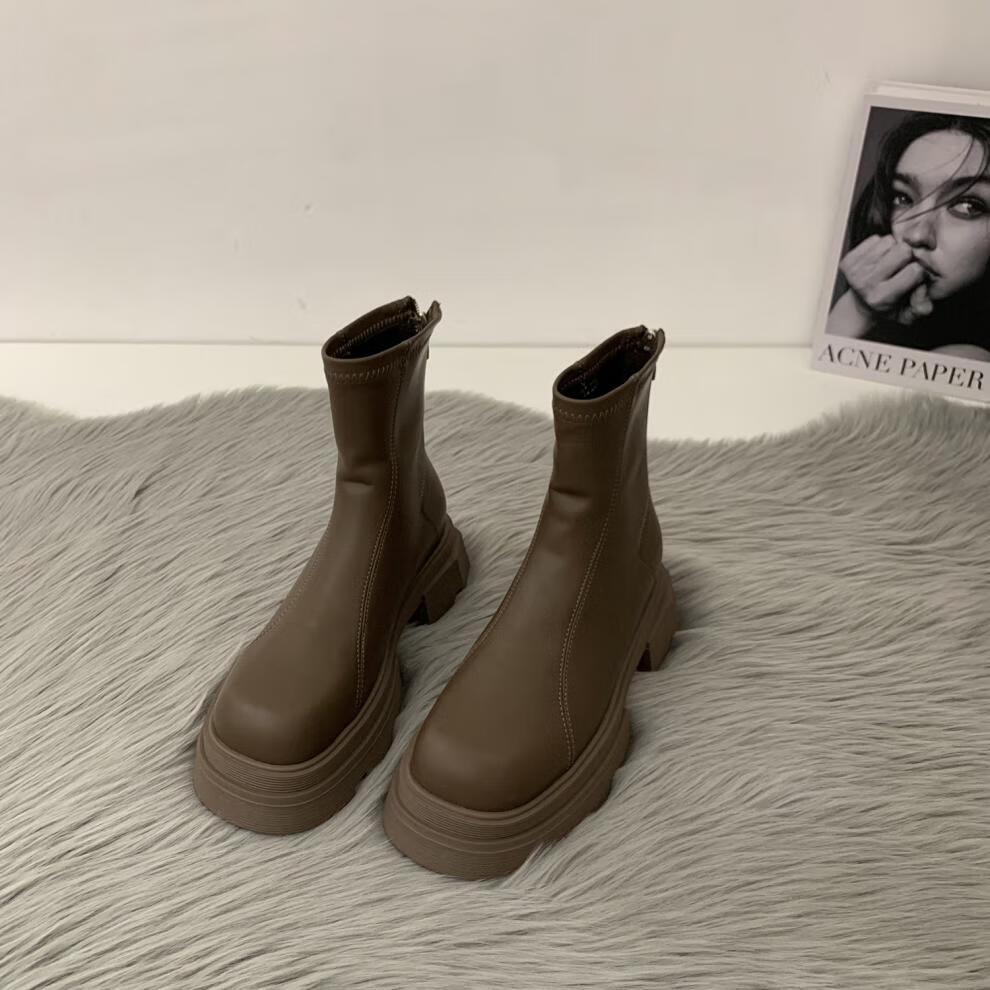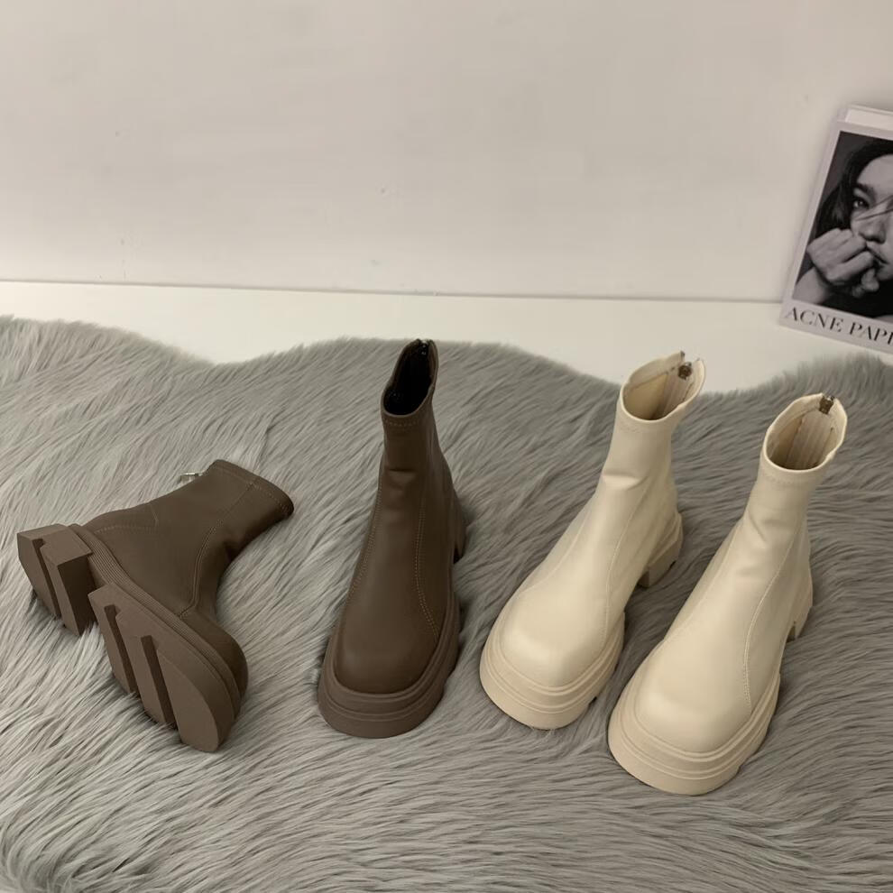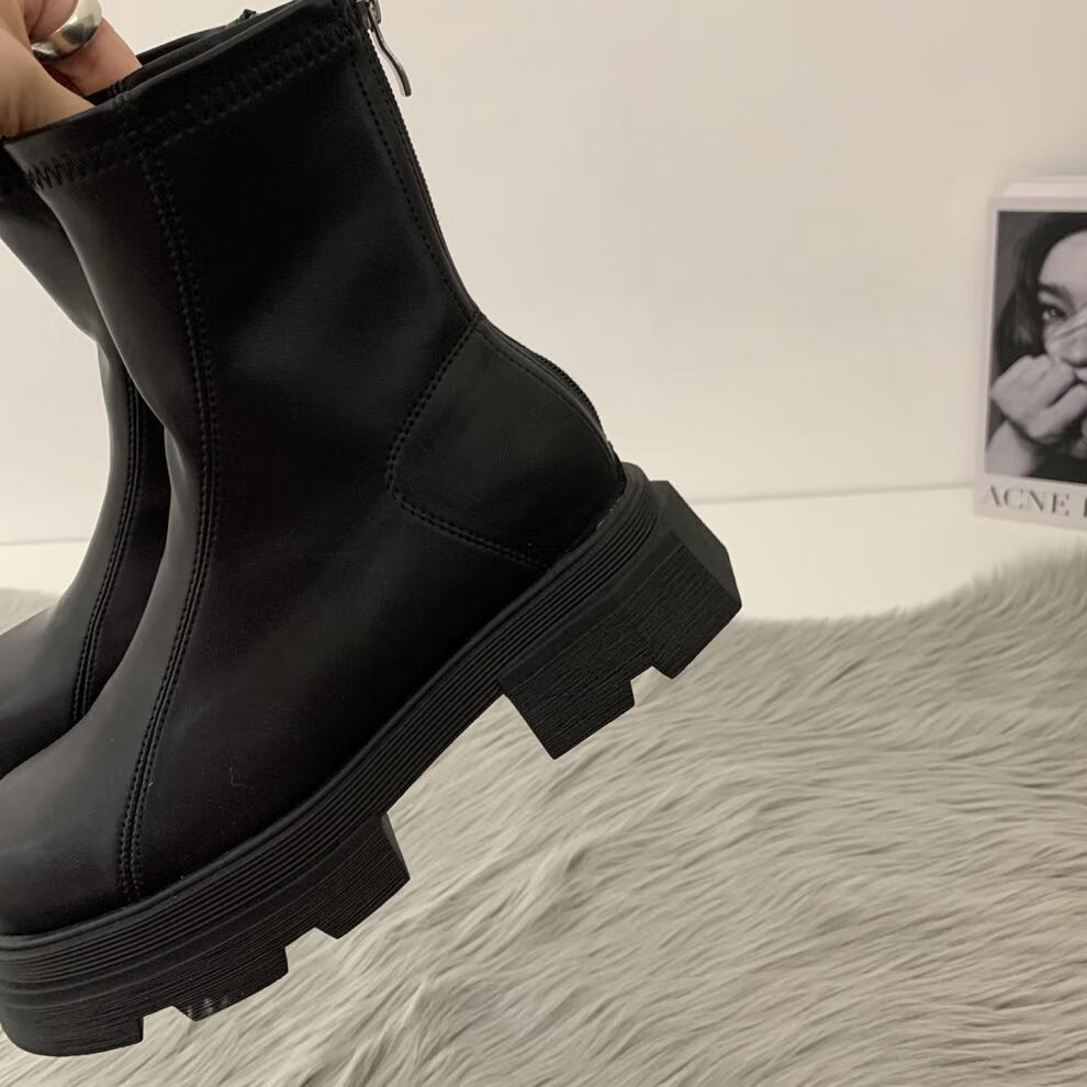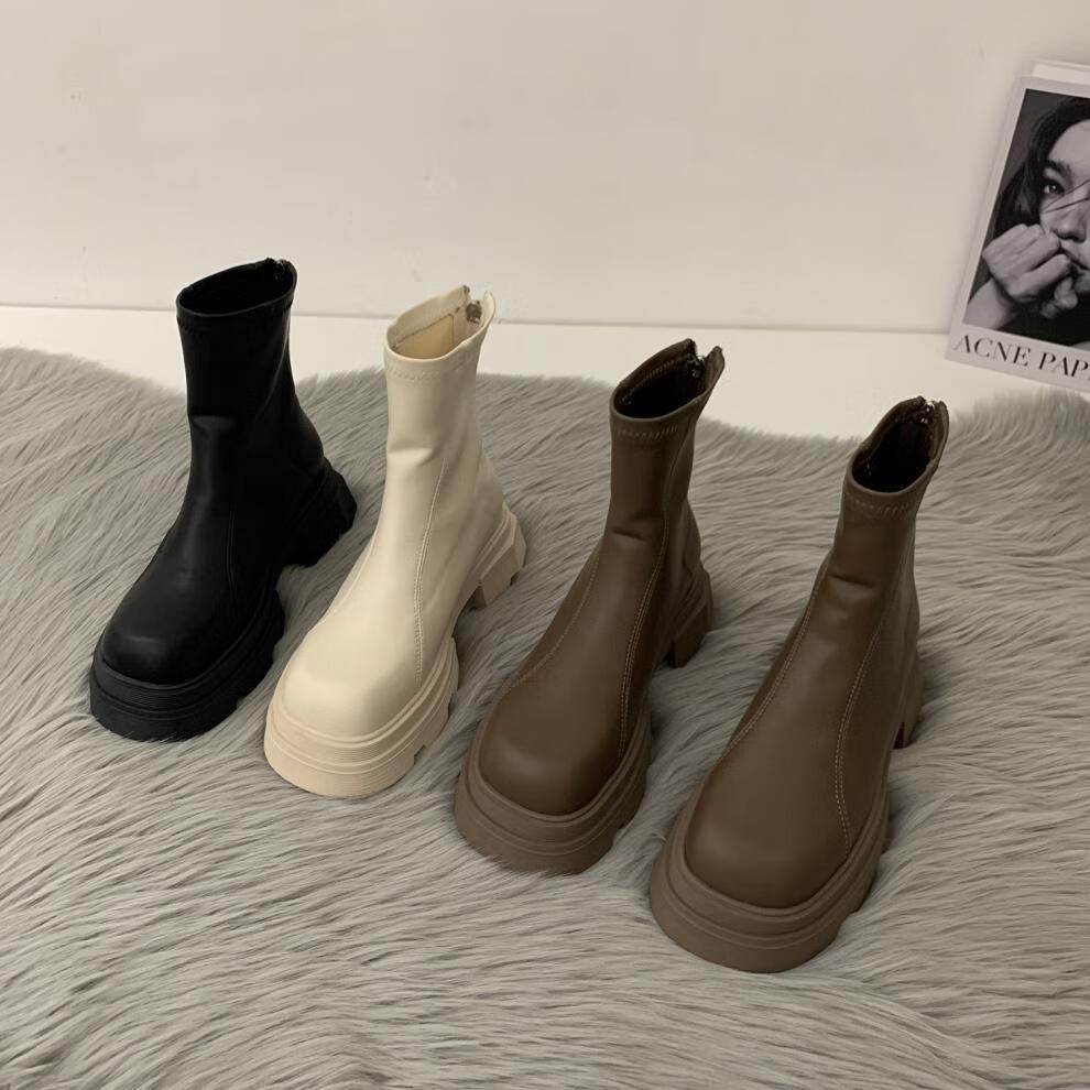 稻草人(MEXICAN)小香风厚底白色方头马丁靴女2026春秋新款韩系高跟瘦瘦真皮小短靴 黑色 35