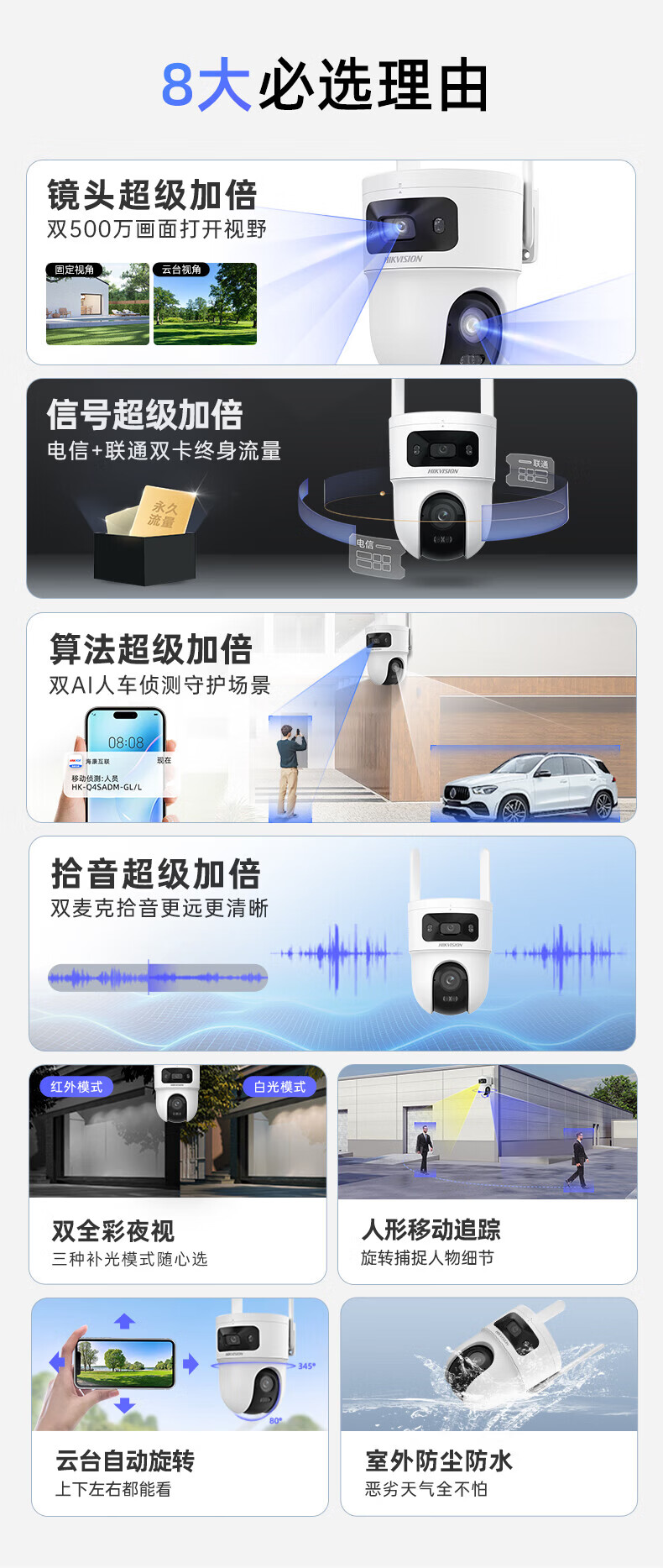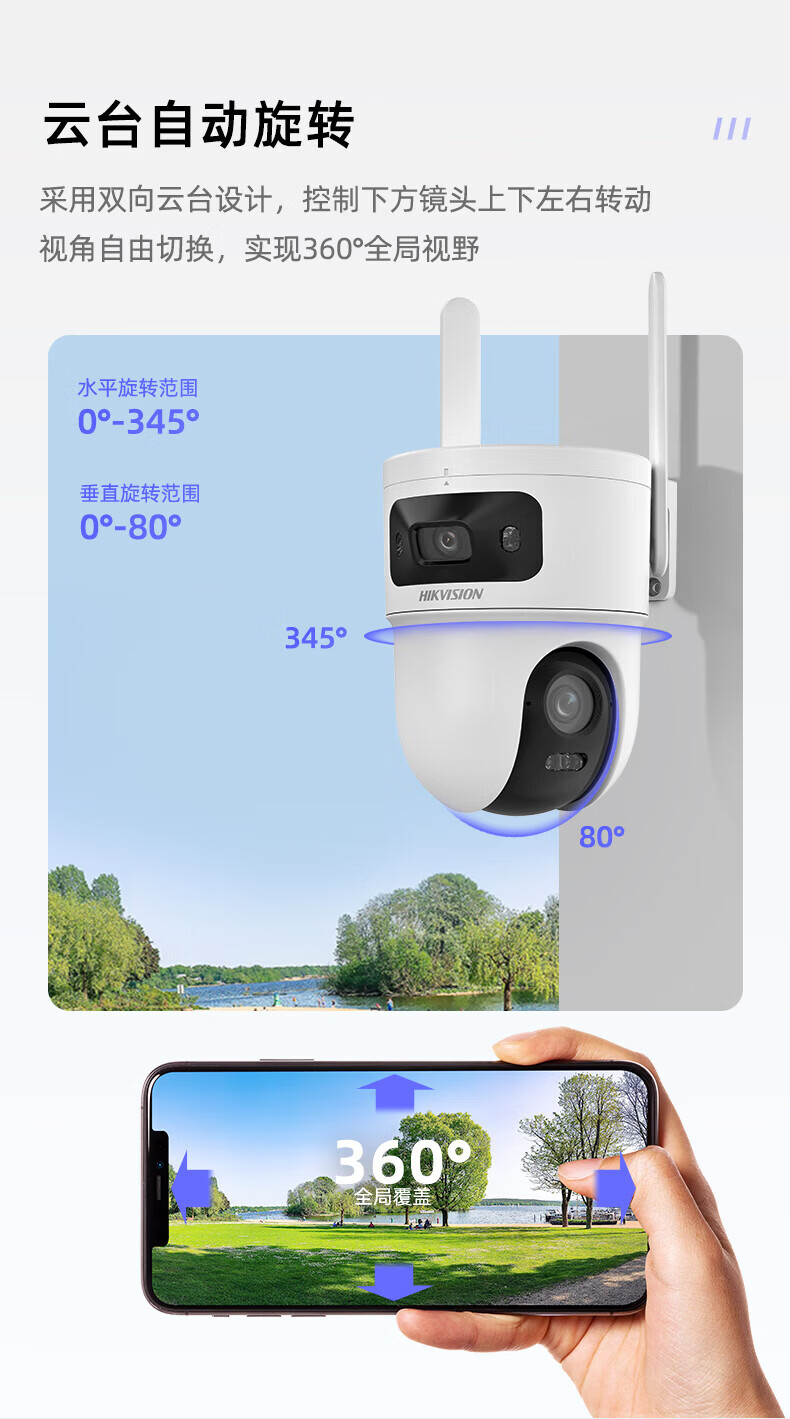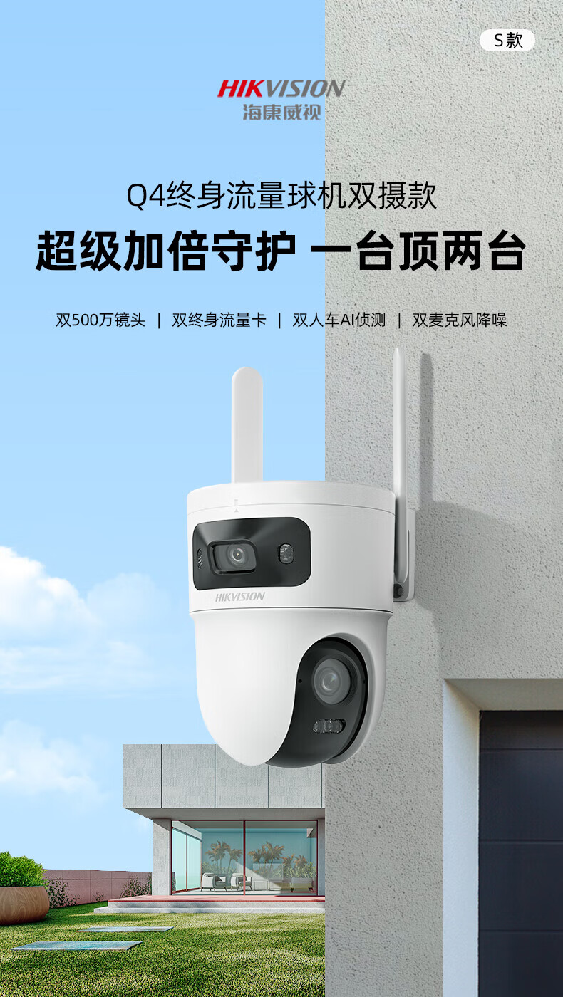 HIKVISION海康威视4g摄像头室户外终身免费充值无限流量1000万双摄农村家用监控器360度无死角夜视全景云台