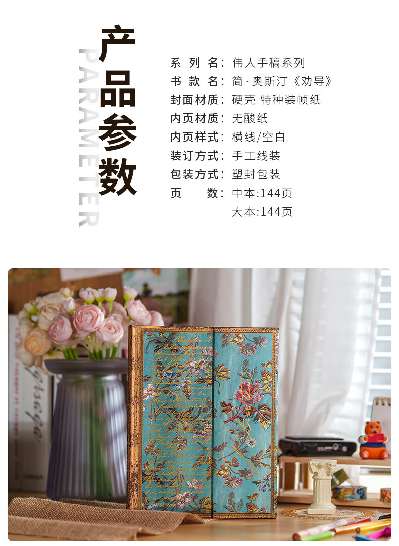 paperblanks佩兰克笔记本本子日记本文艺精致高颜值手帐手账本记事本学生伟人手稿简奥斯汀劝导 【硬壳翻盖款】简·奥斯汀/大本/横线