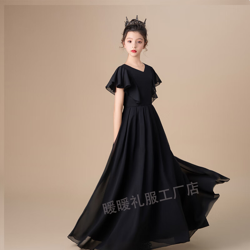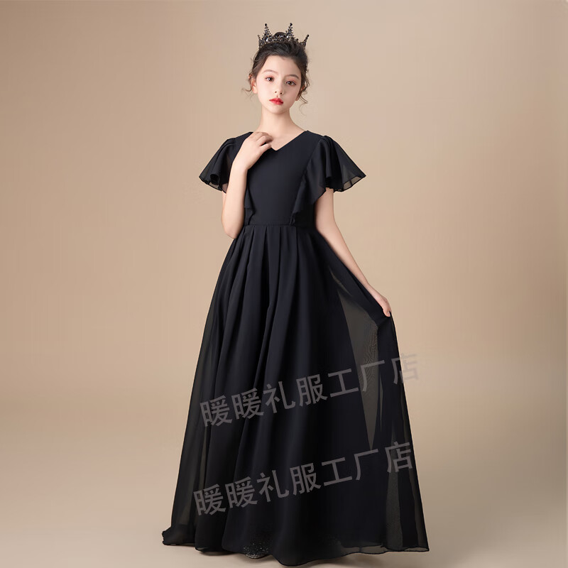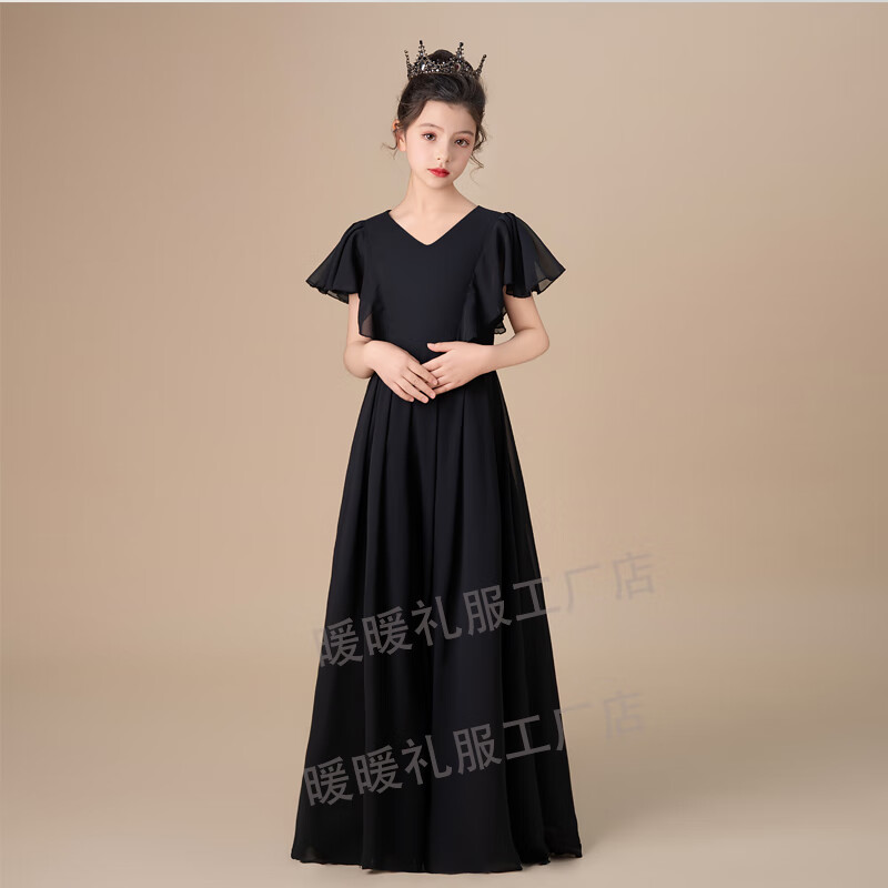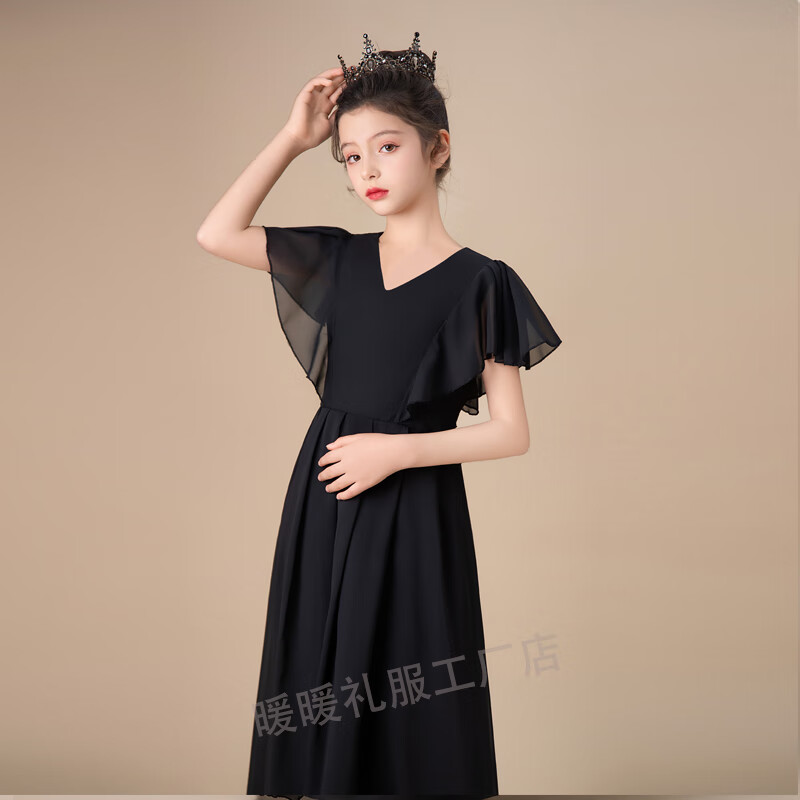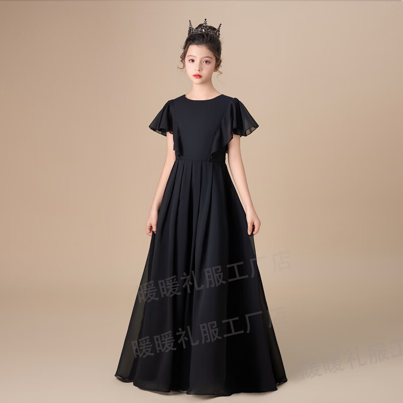 小学生初中晚礼服黑色中大童女童礼服钢琴演出服公主裙小提琴演奏 黑色圆领 150