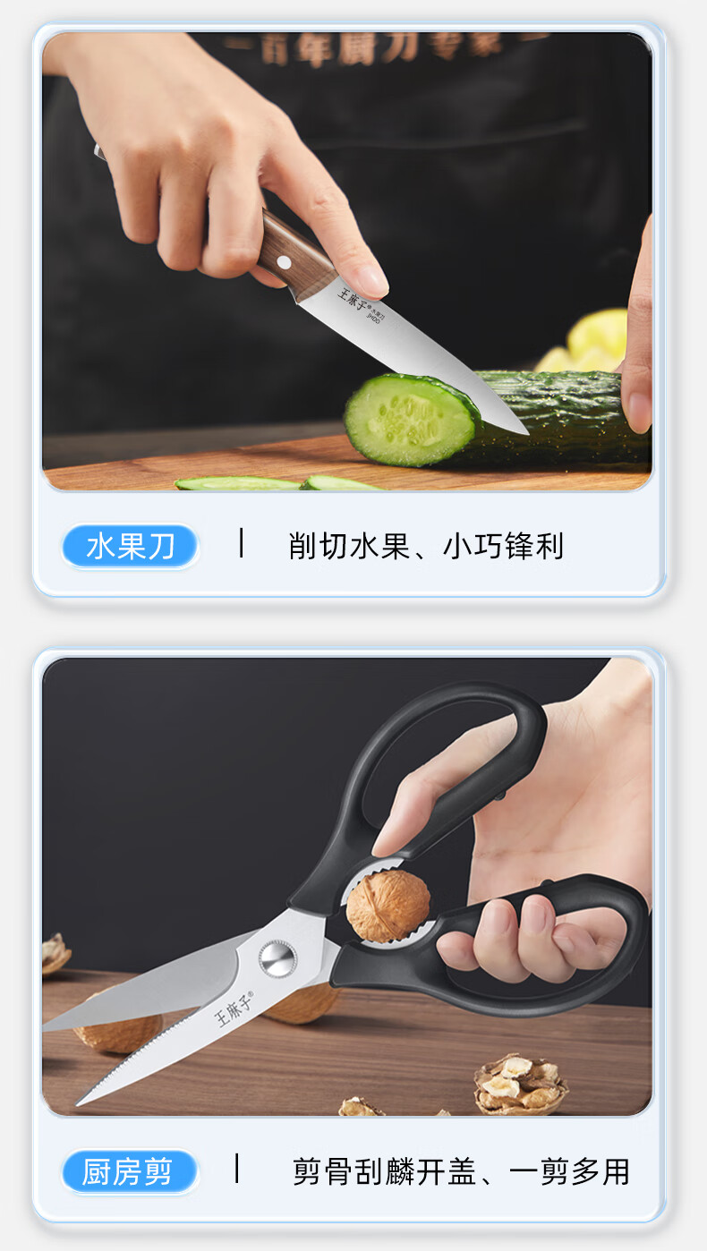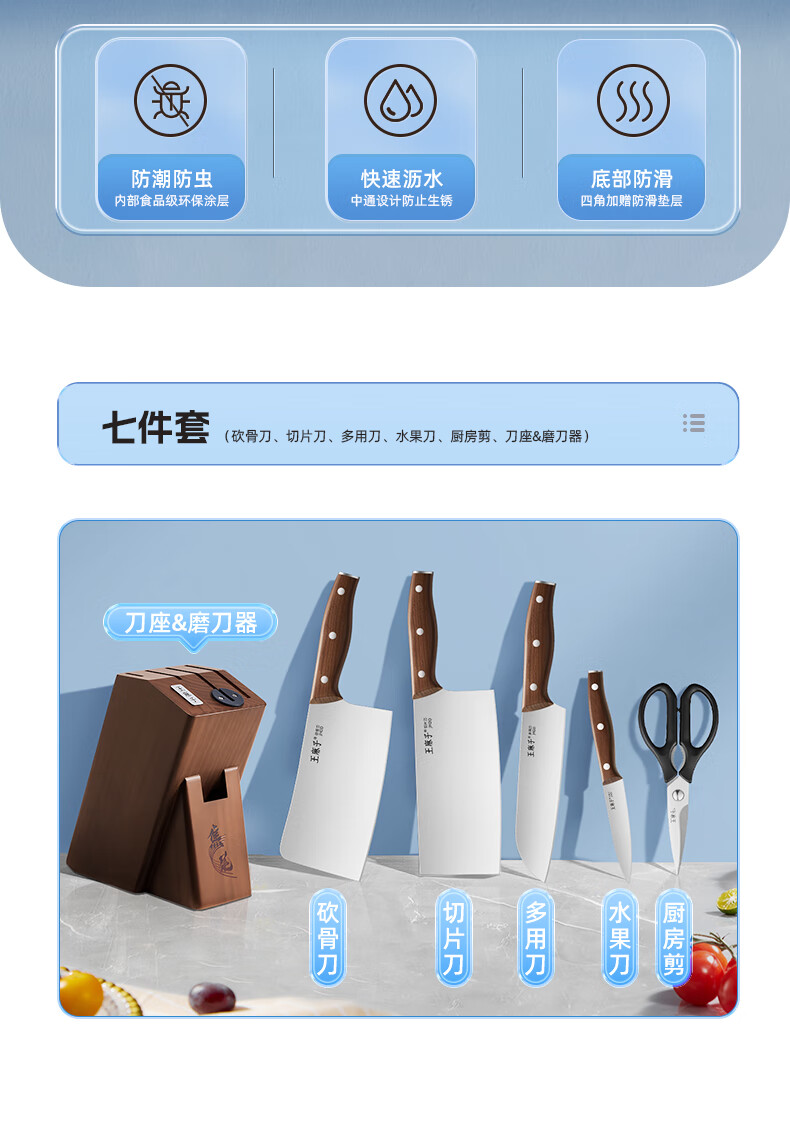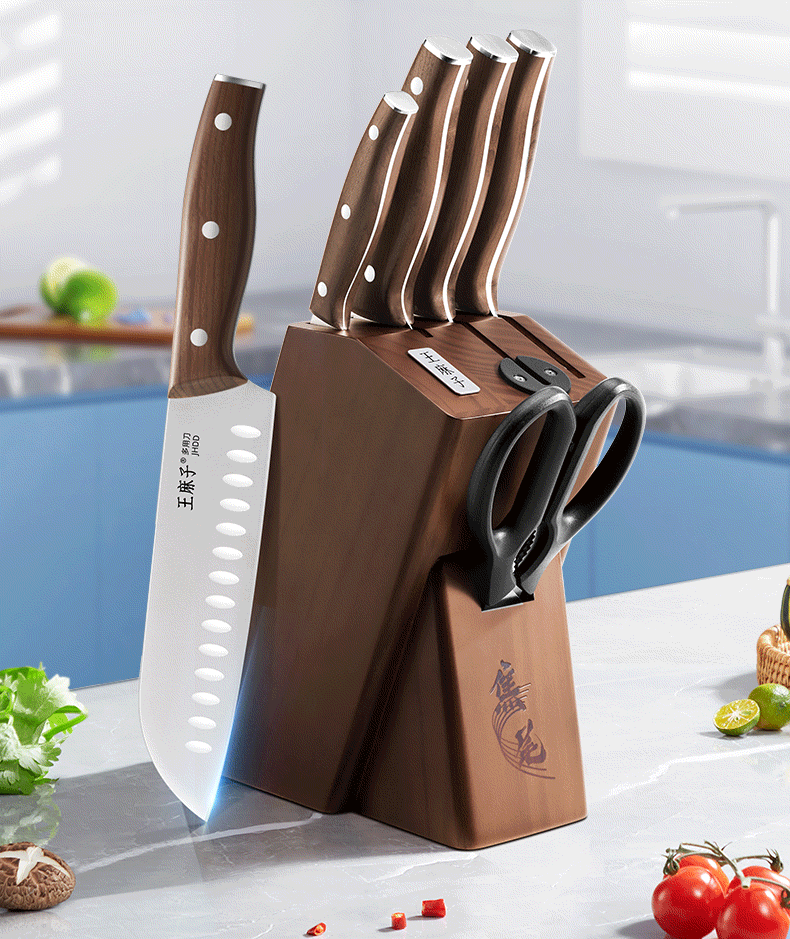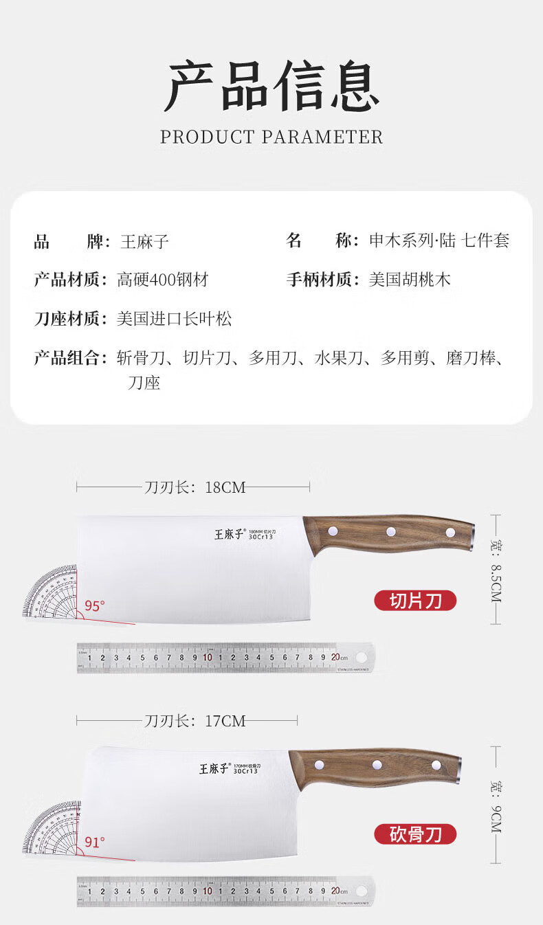 王麻子刀具全套 菜刀家用厨具菜板切菜刀水果刀剪刀厨房刀具套装 【40Cr钢】升级款焦尾 7件套