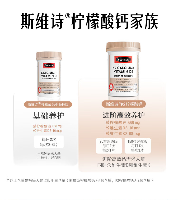 Swisse斯维诗 钙片+维生素D迷你钙片 中老年成人孕妇补钙 柠檬酸钙300片