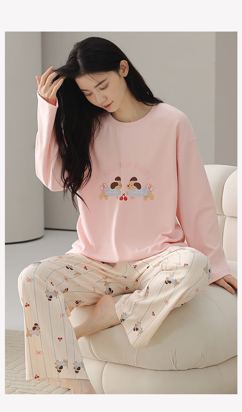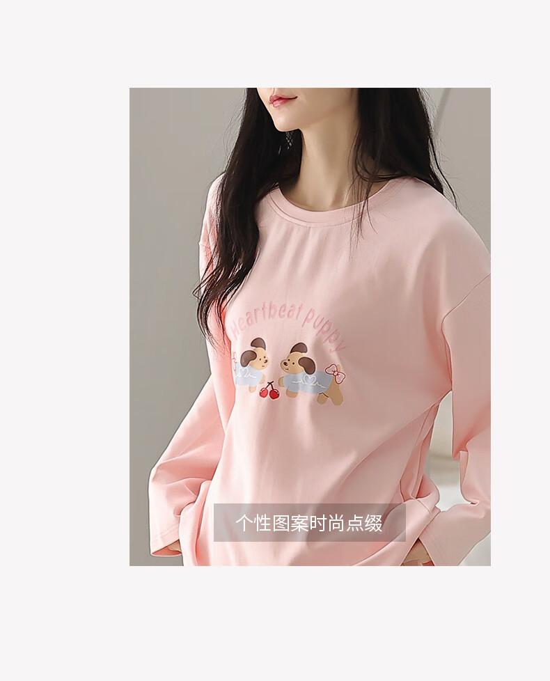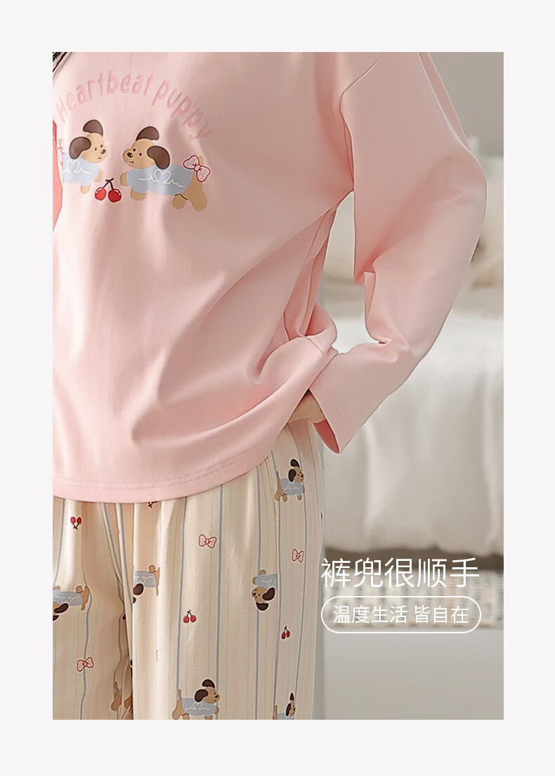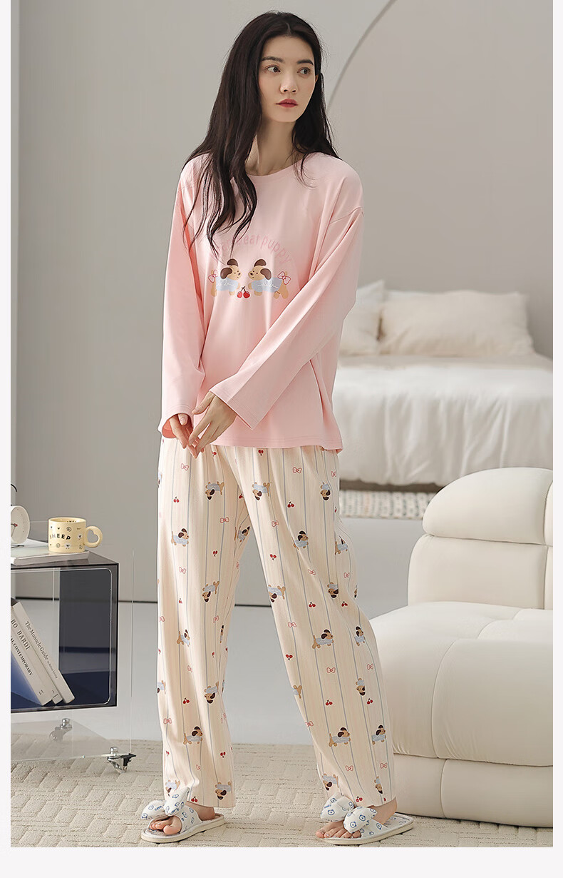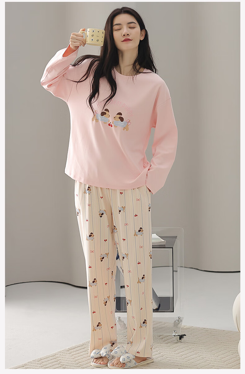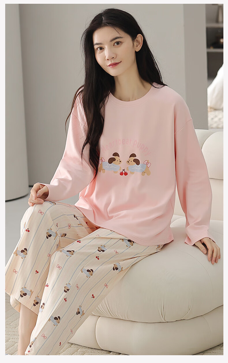 芬腾睡衣女【100%纯棉】秋冬新款圆领长袖卡通睡衣女家居服套装 粉色 L