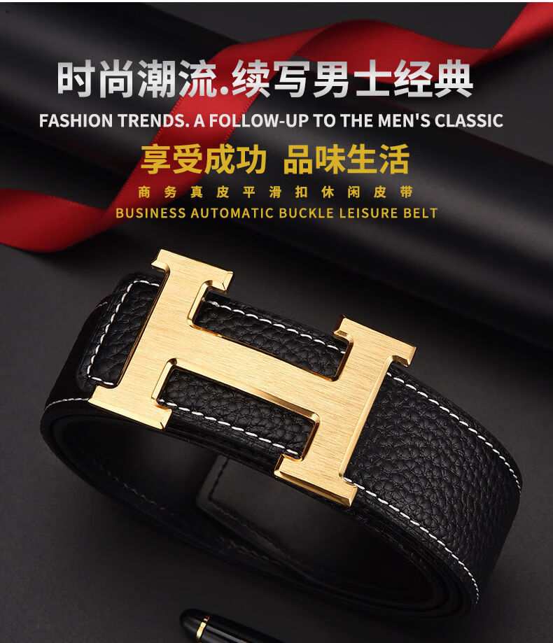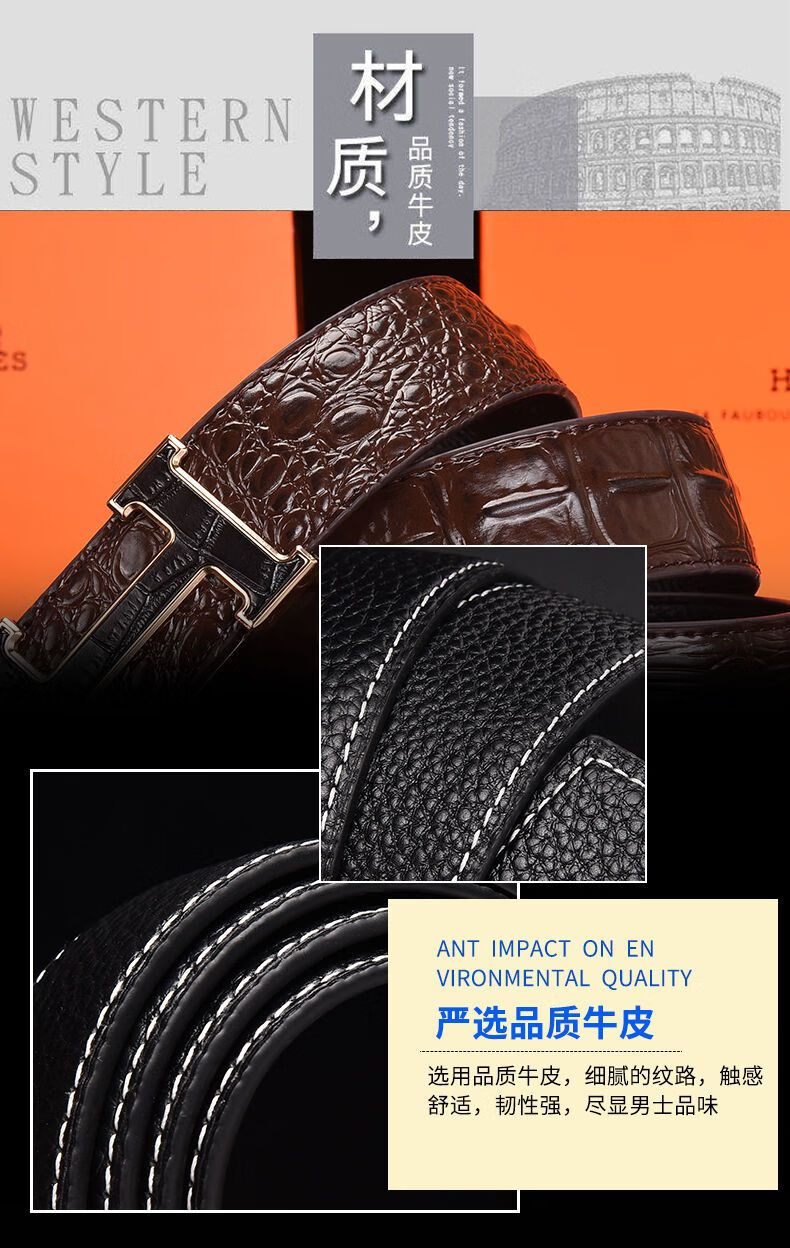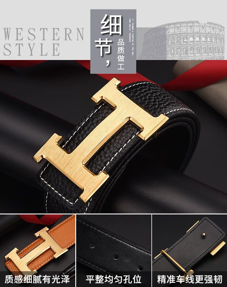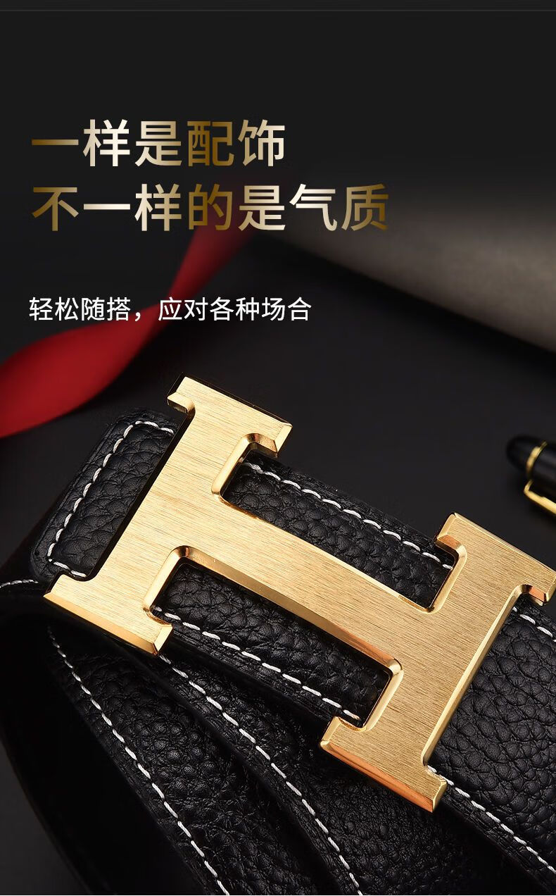 酷奇袋鼠男士皮带真牛皮时尚百搭H铜扣工字扣真皮休闲青中年腰带男 H黑色+银扣 3.8宽 105cm