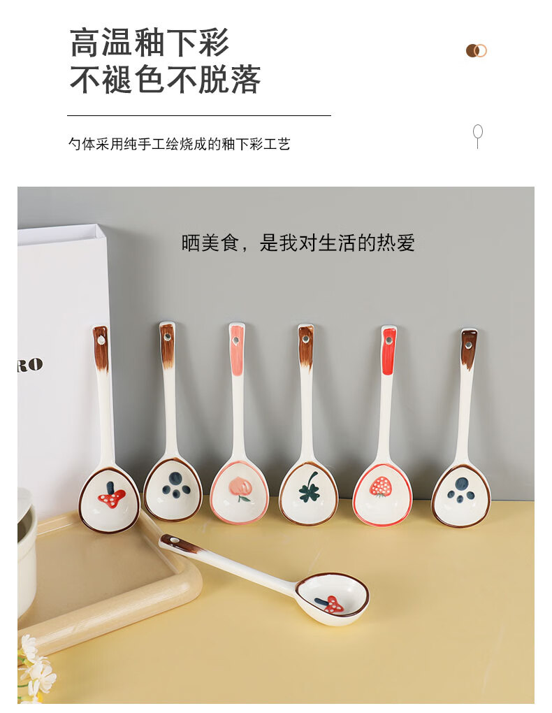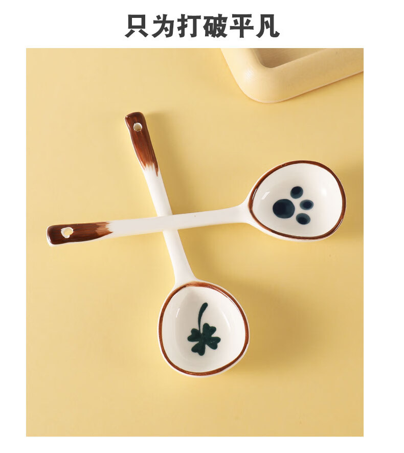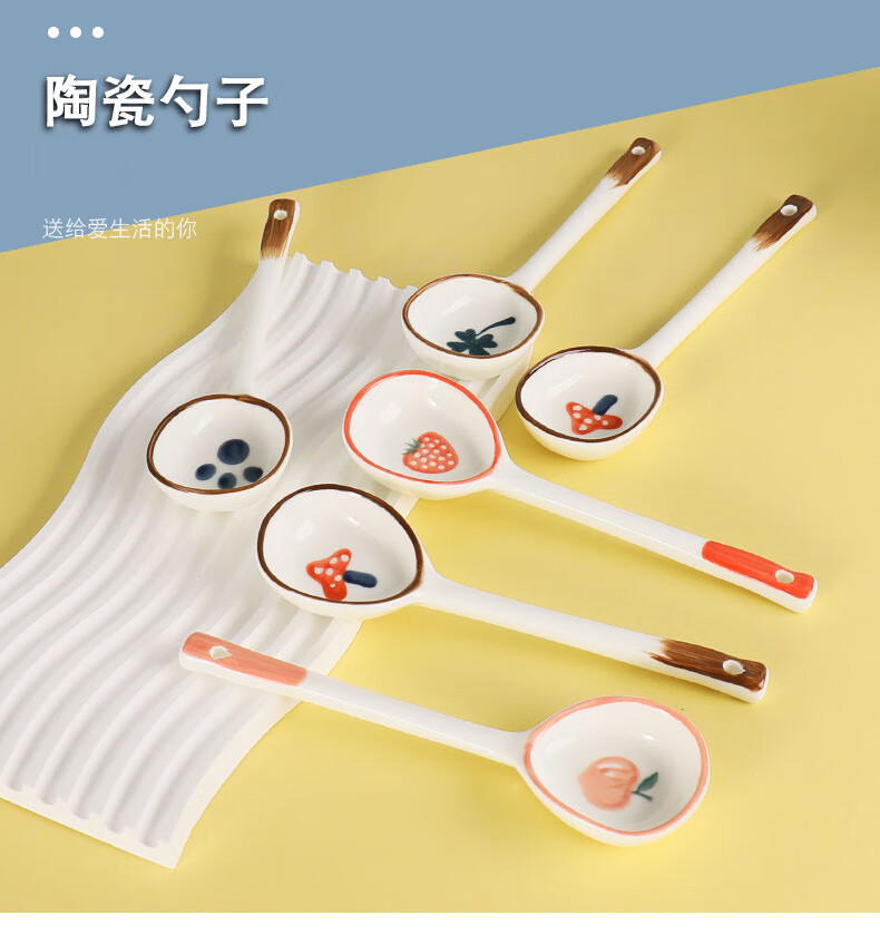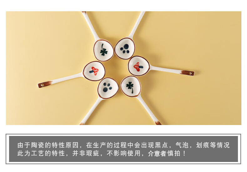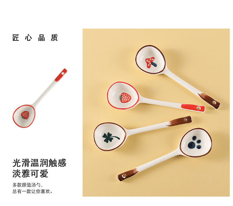PJ陶瓷勺子家用小汤勺长柄日式高颜值喝汤专用圆头盛汤舀粥调羹勺 混色5个装