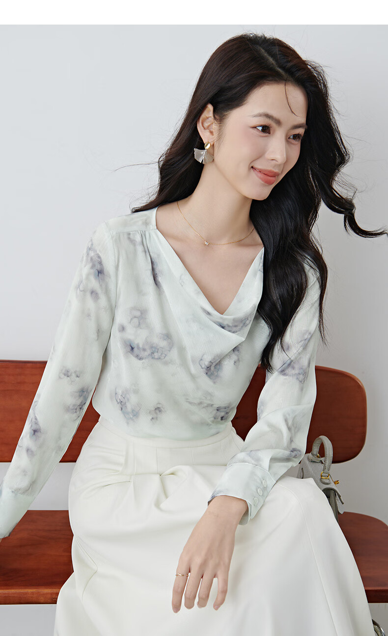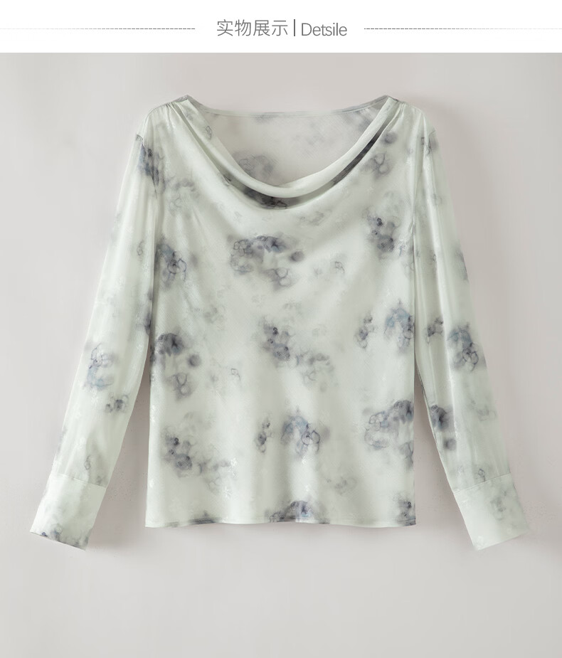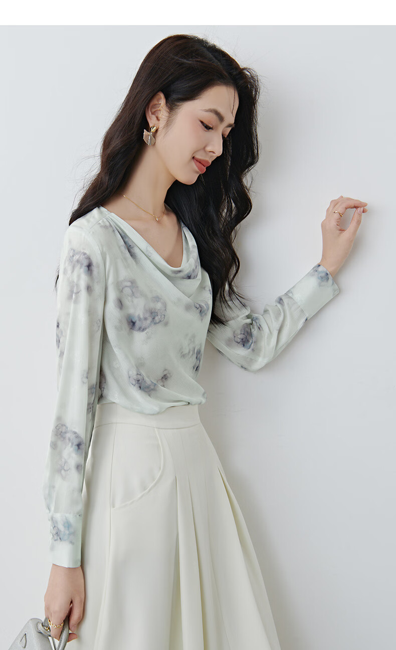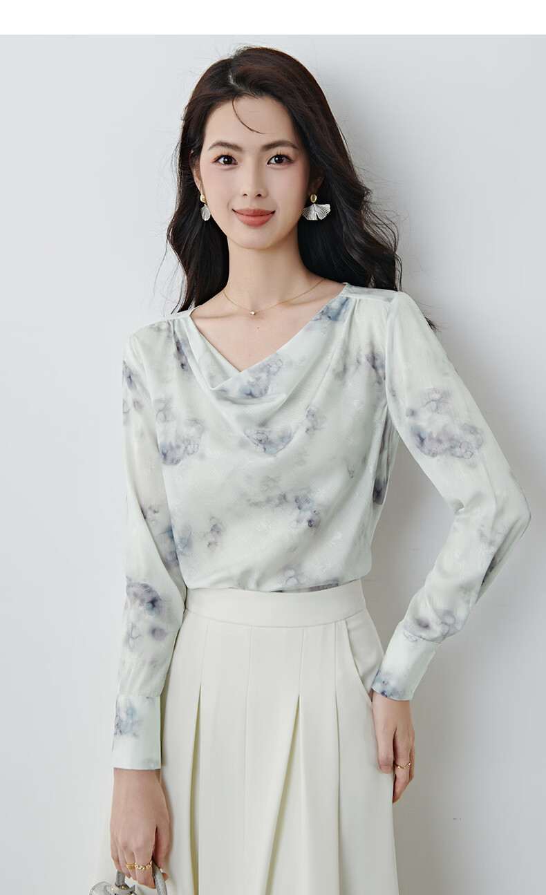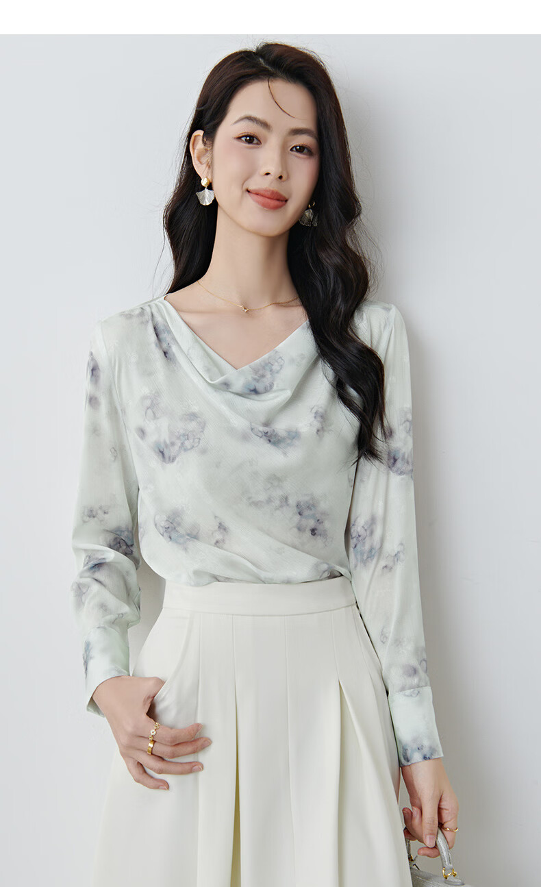 晚白2026年春款法式不规则荡领烟雨水墨印花上衣清新雅致缎面衬衫女 花色 L