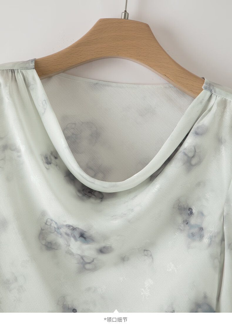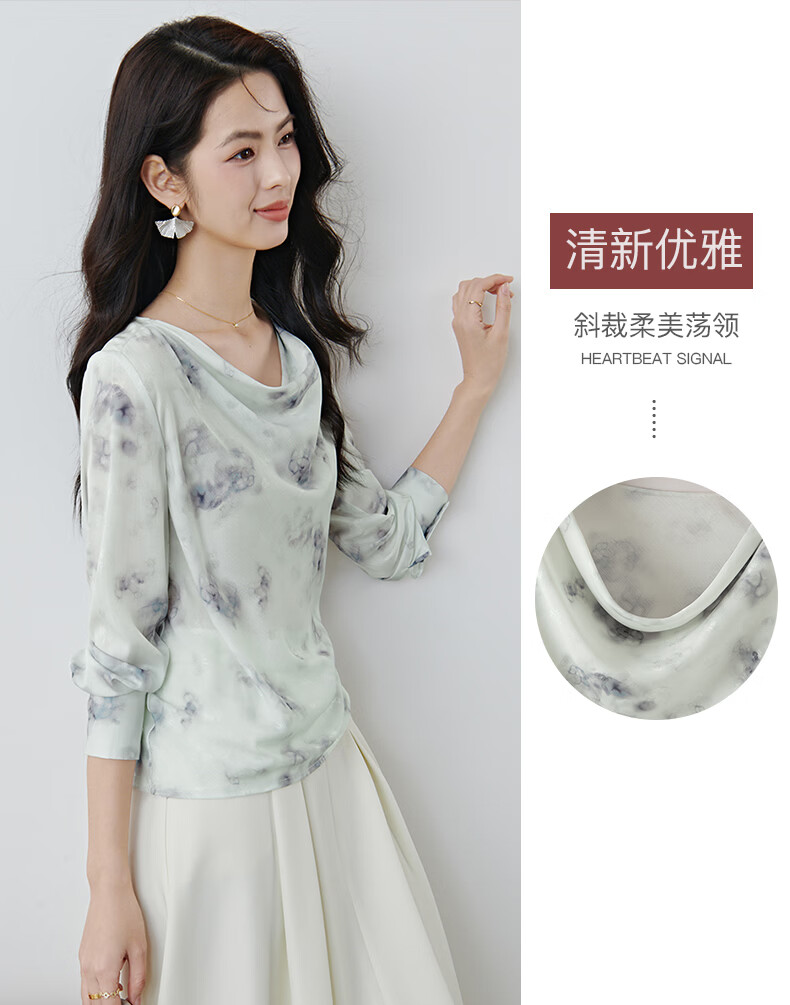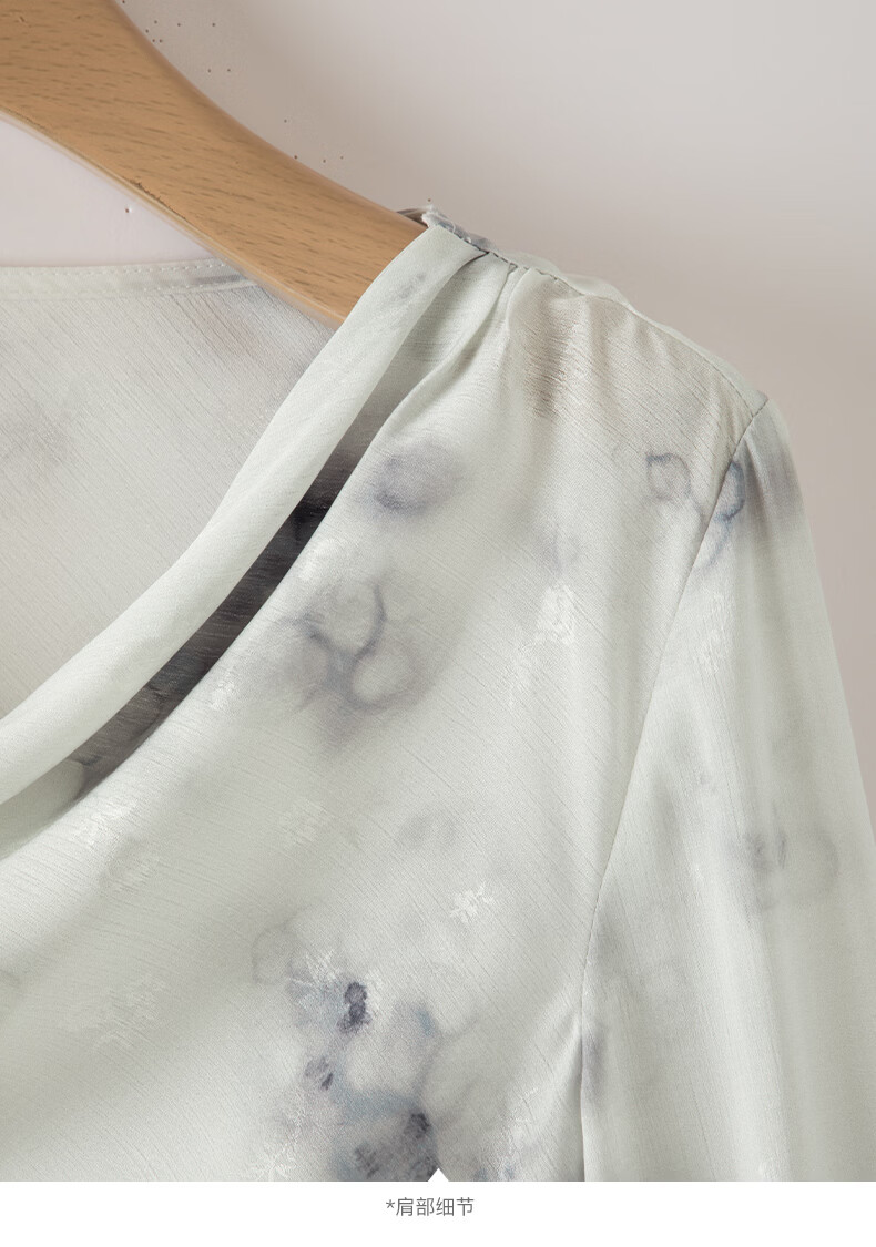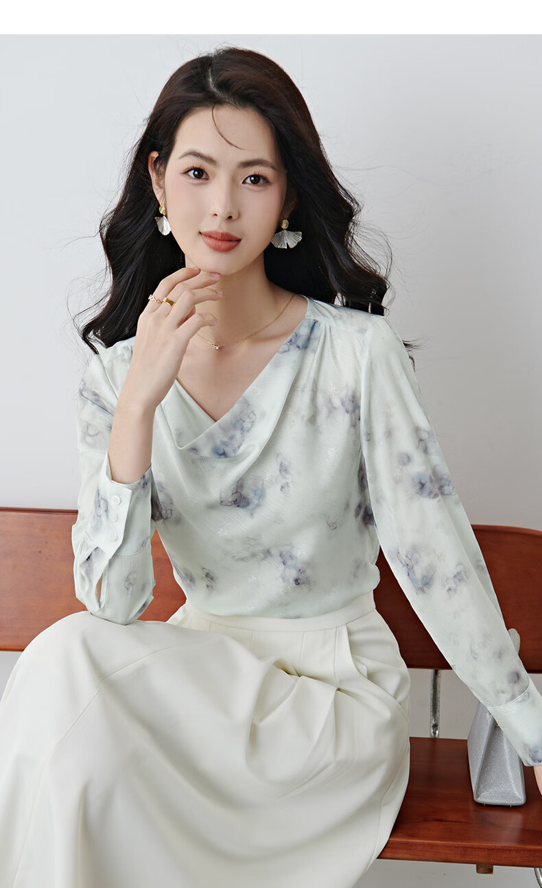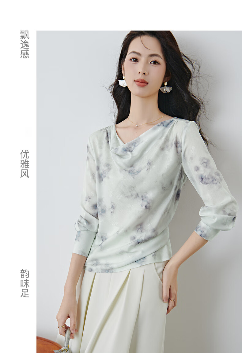 晚白2026年春款法式不规则荡领烟雨水墨印花上衣清新雅致缎面衬衫女 花色 L