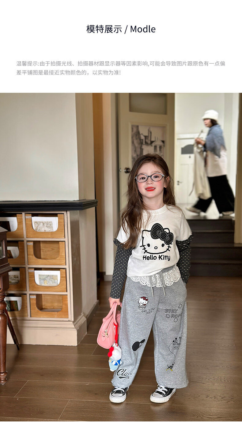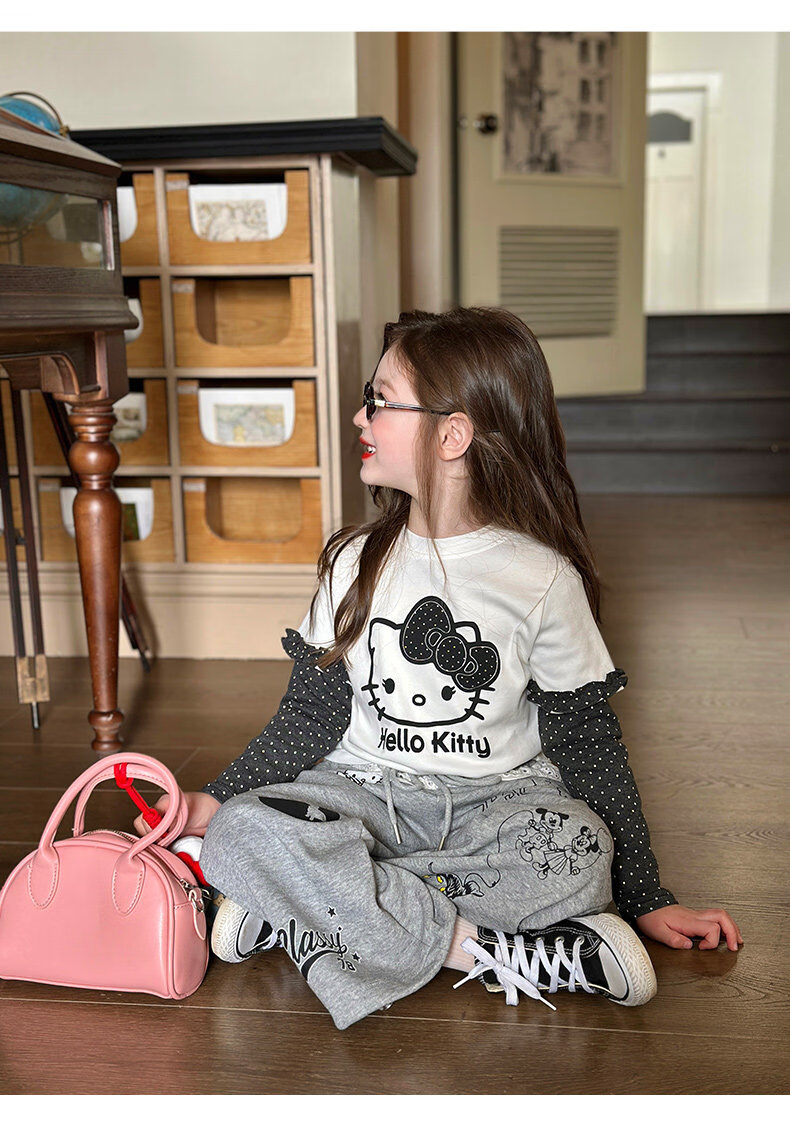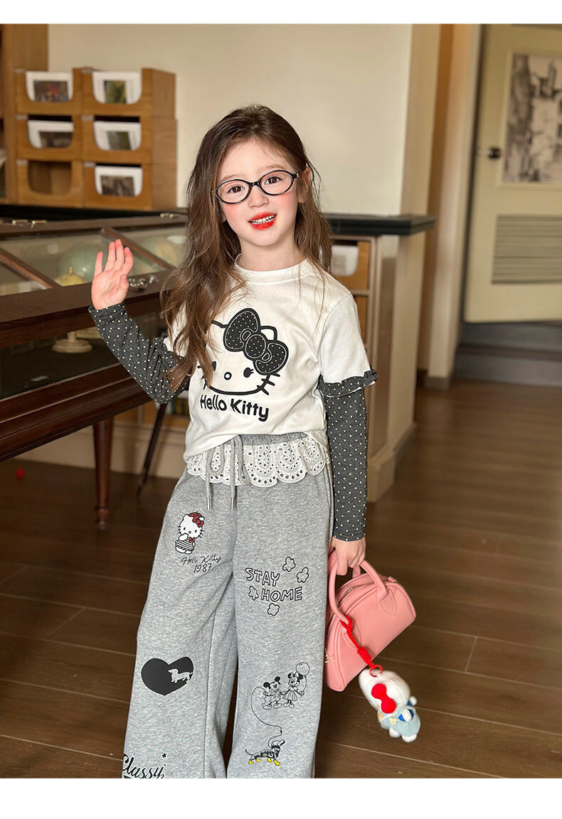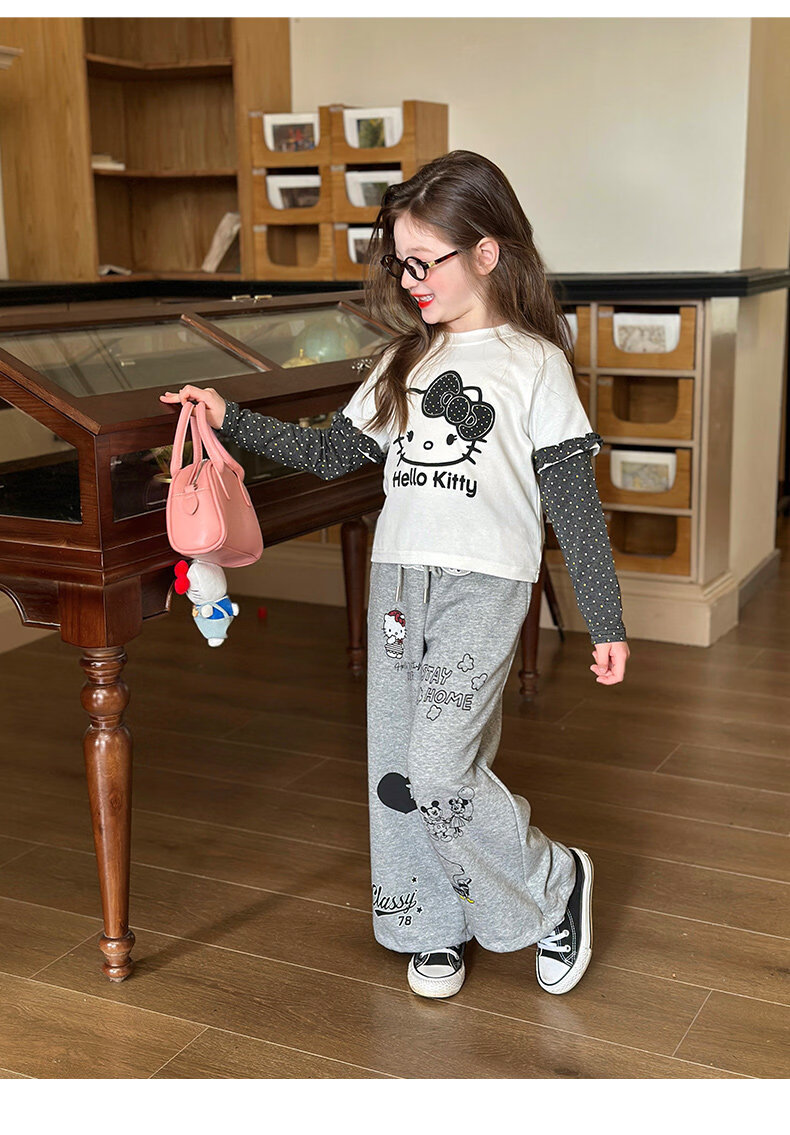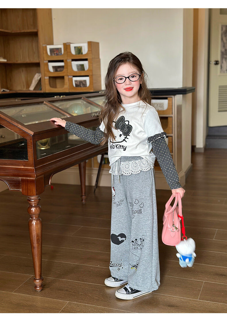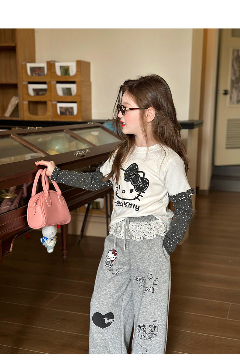 栀了成长记童装女童卡通假两件上衣2026春季儿童韩版时髦长袖T恤 灰色 裤子 130 cm
