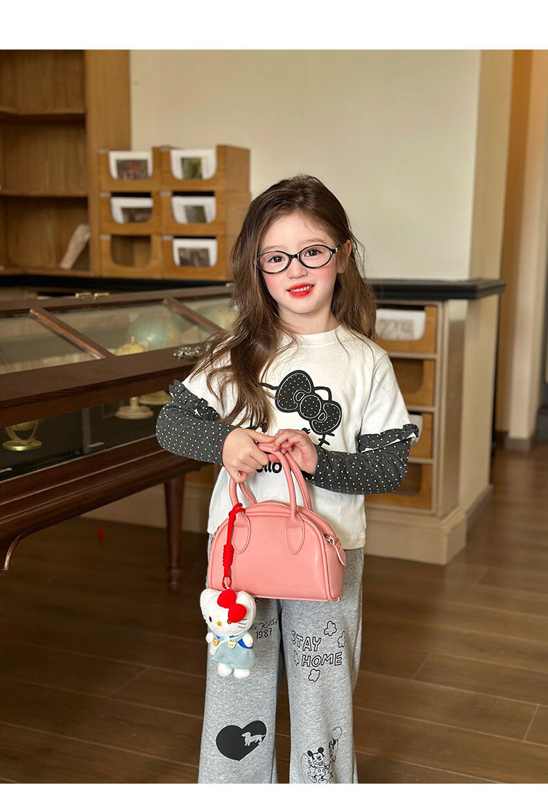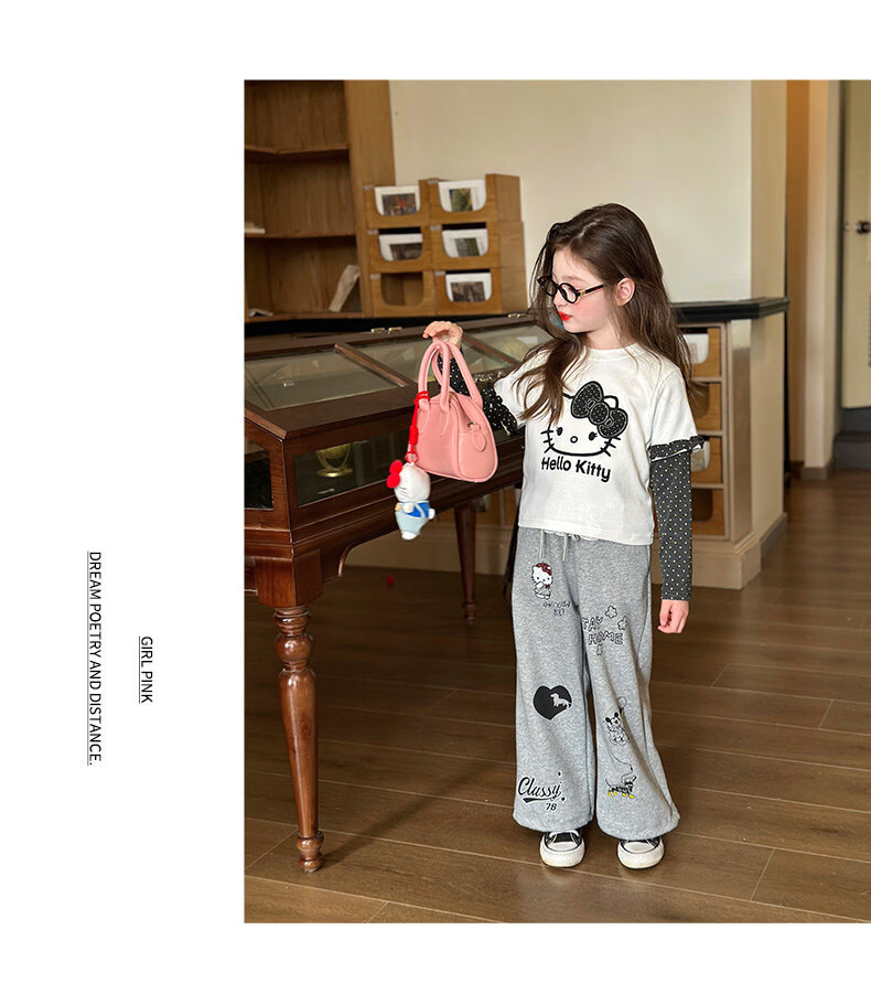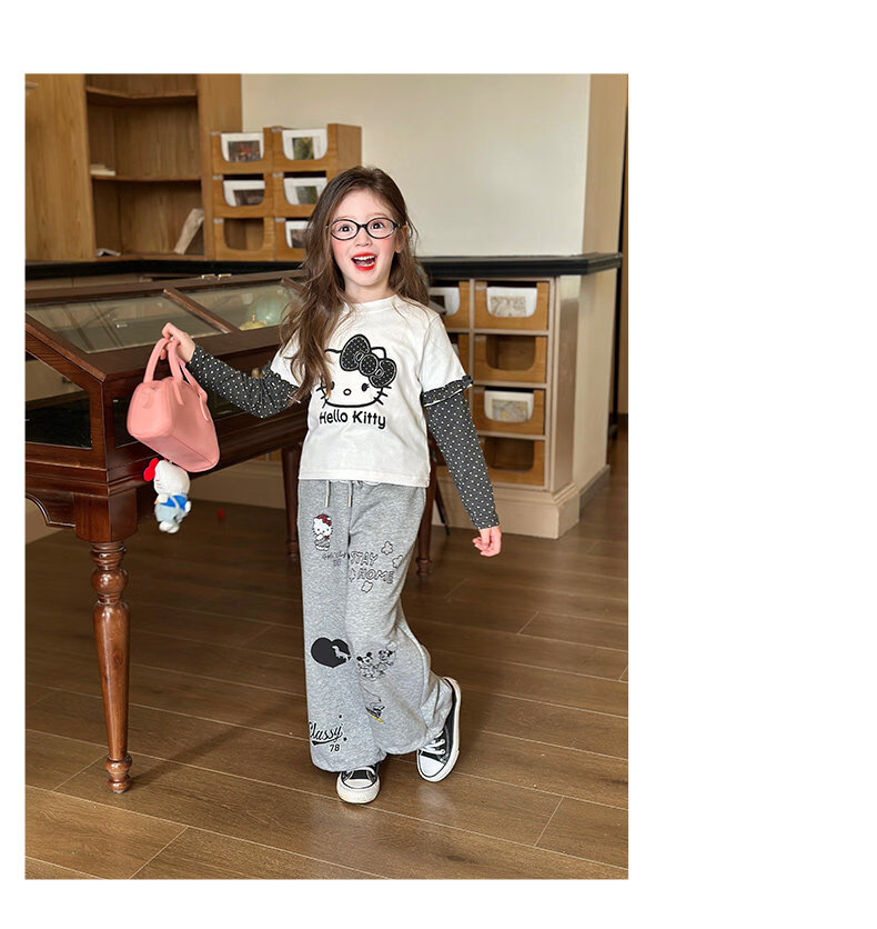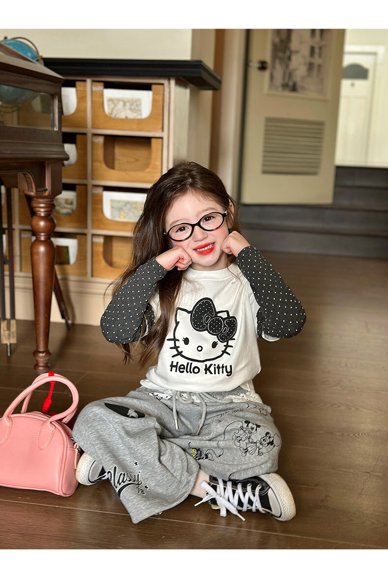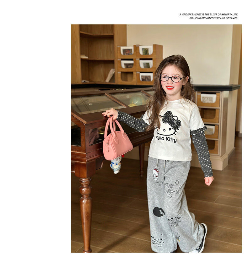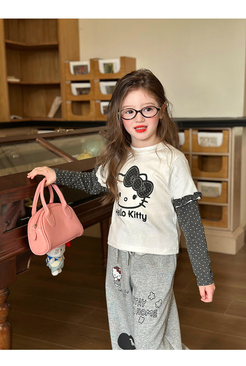栀了成长记童装女童卡通假两件上衣2026春季儿童韩版时髦长袖T恤 灰色 裤子 130 cm