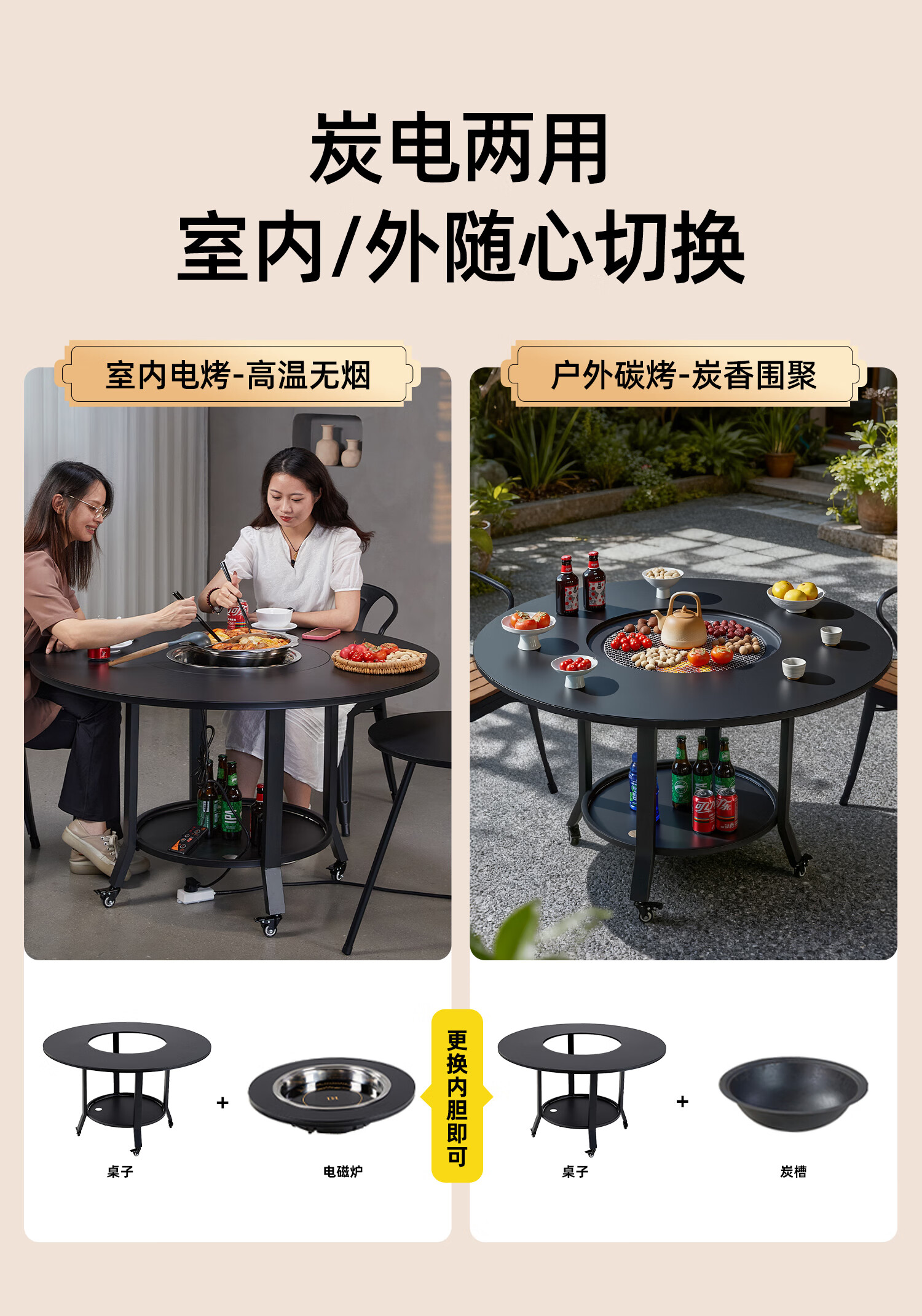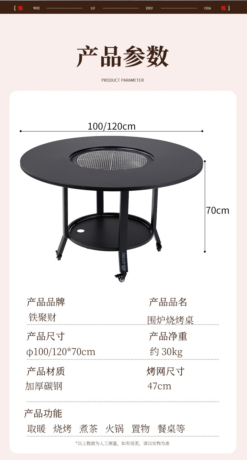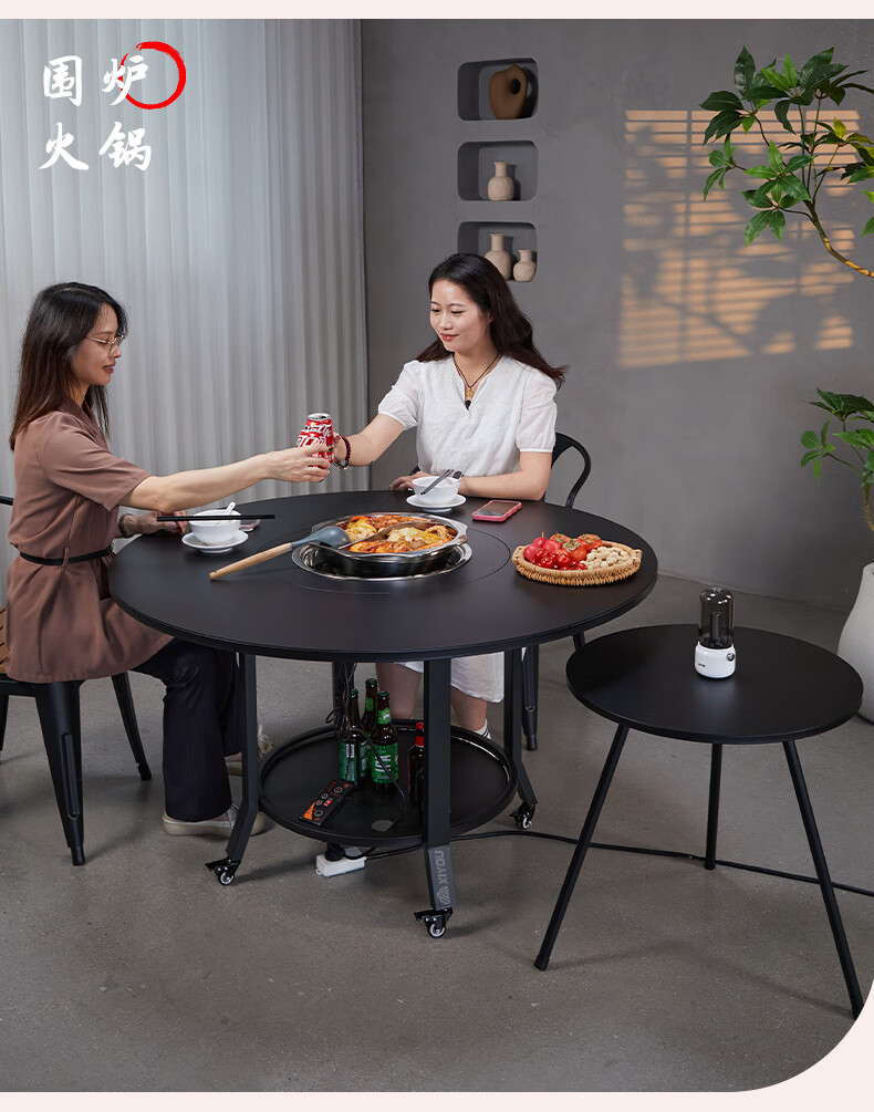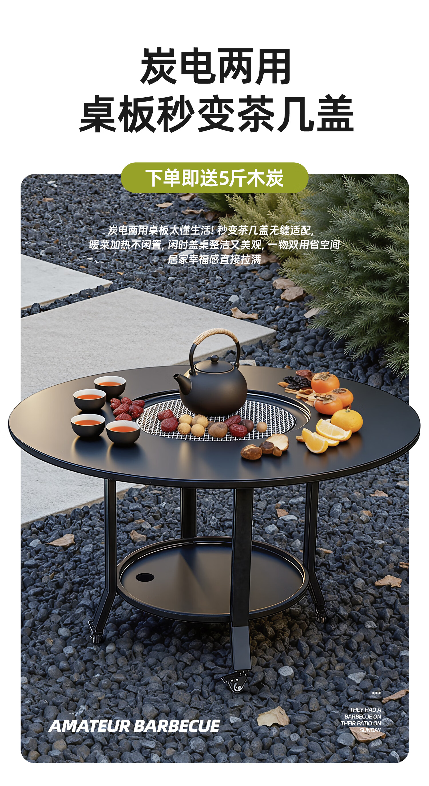 嘻由围炉煮茶炭电两用家用室内烧烤炉套装户外取暖盆加高庭院插电碳炉 【100烧烤桌+烤网+5斤木炭】 【一桌两用】桌板秒变茶几盖