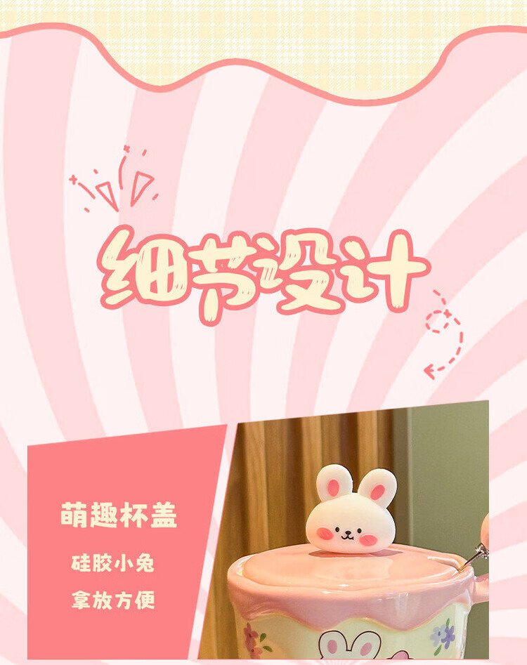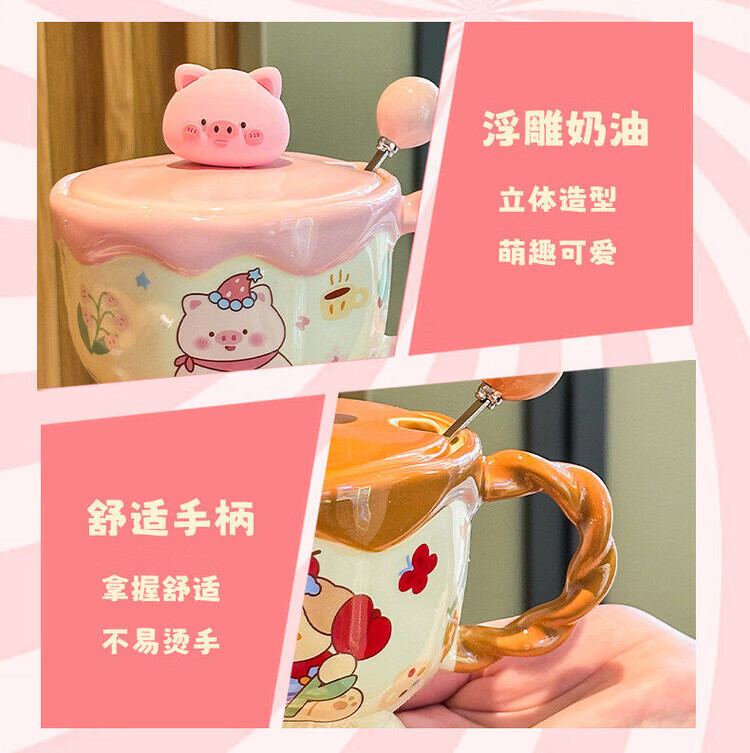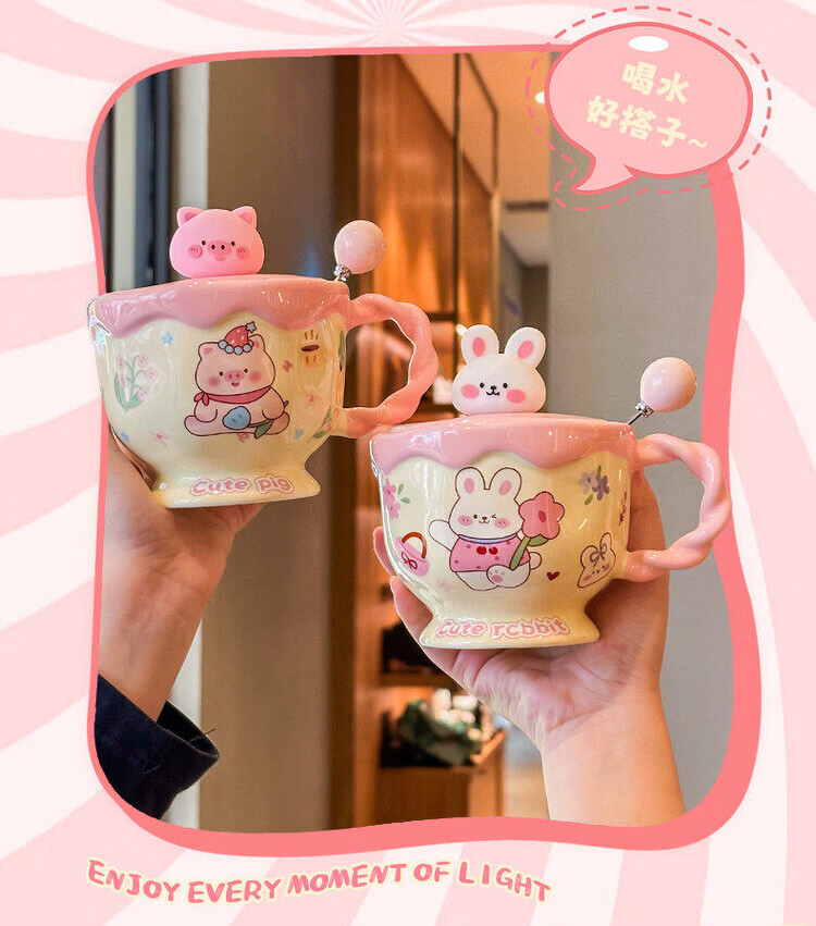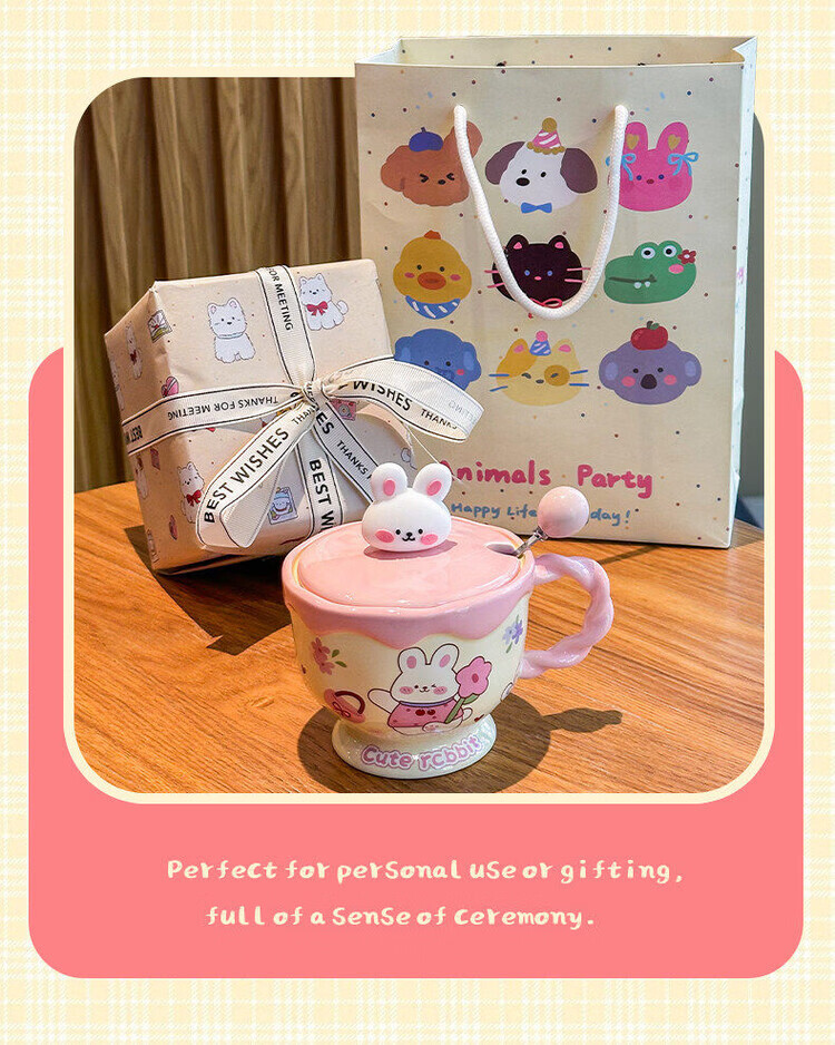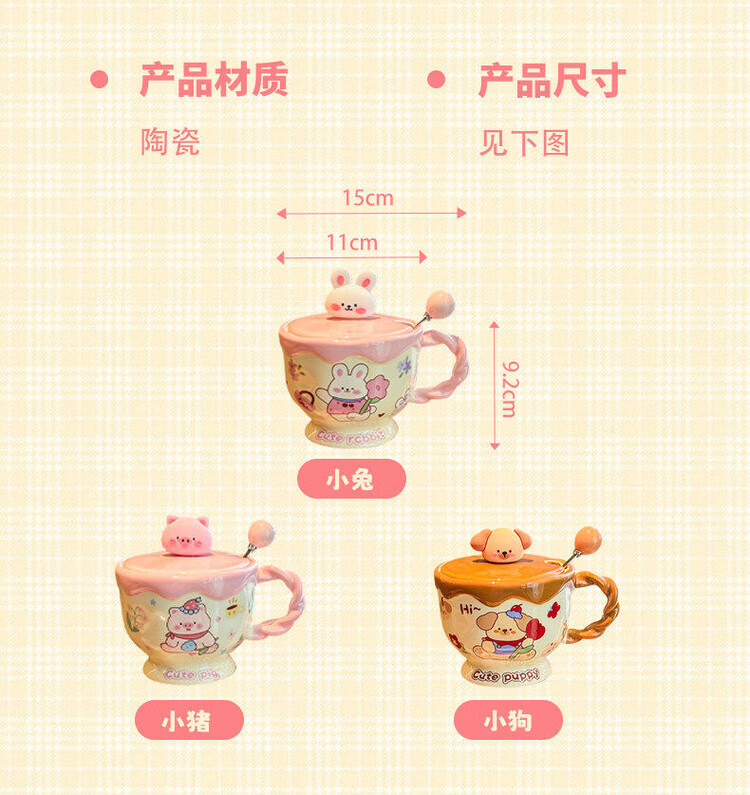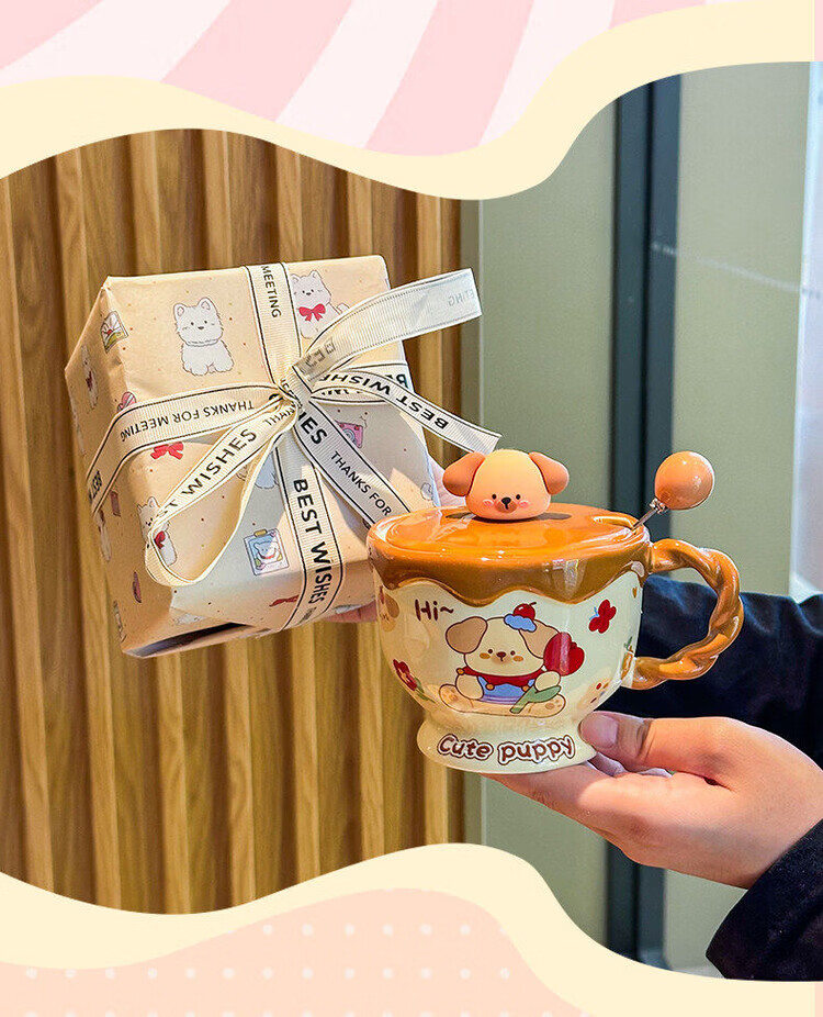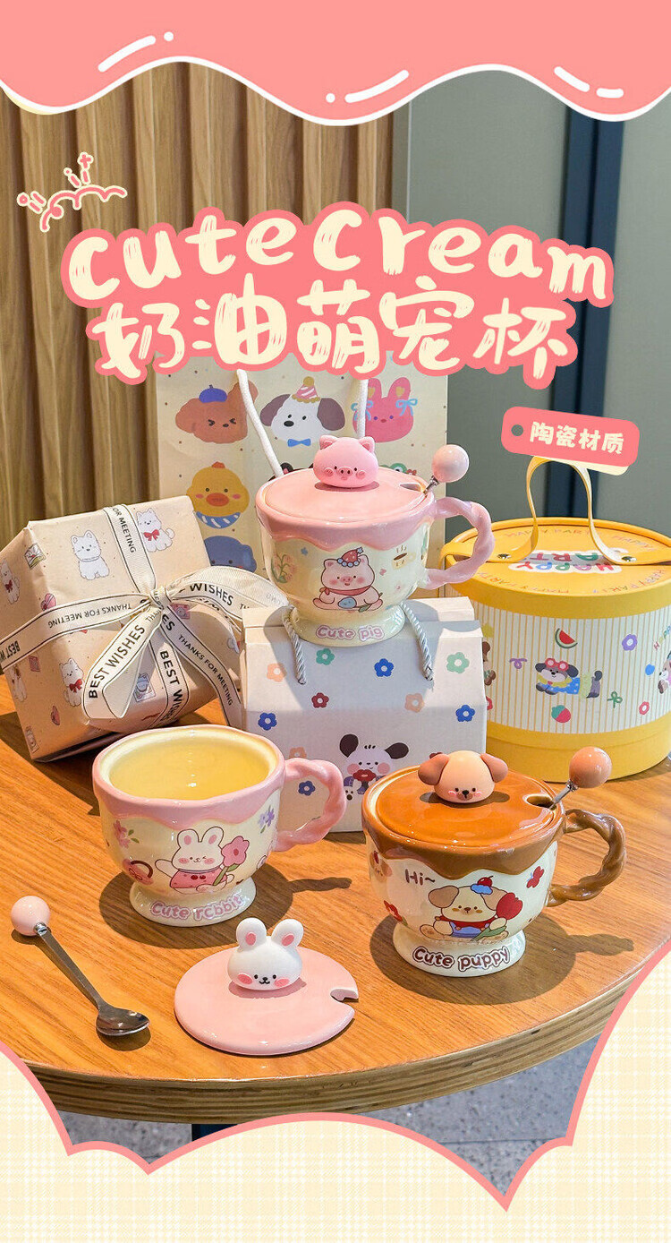 儿童陶瓷水杯 ins奶油小兔伴手礼女生可爱马克杯男实用带盖伴手礼 奶油萌宠杯-棕色小狗【杯+盖+勺】