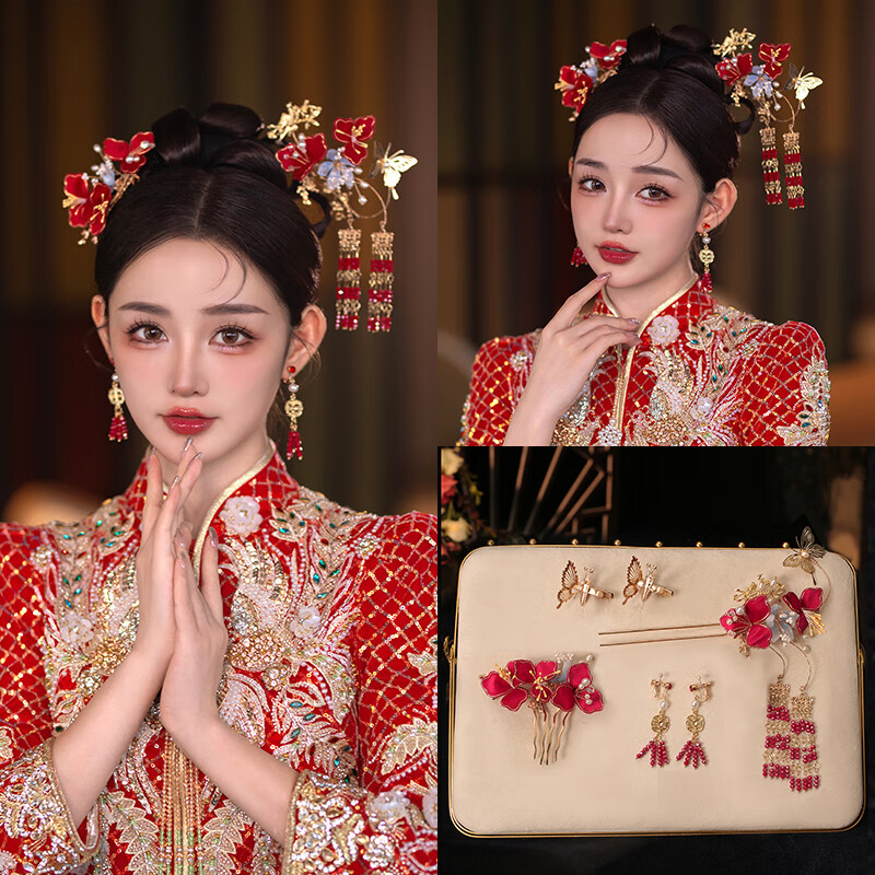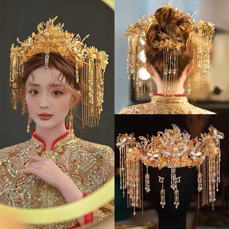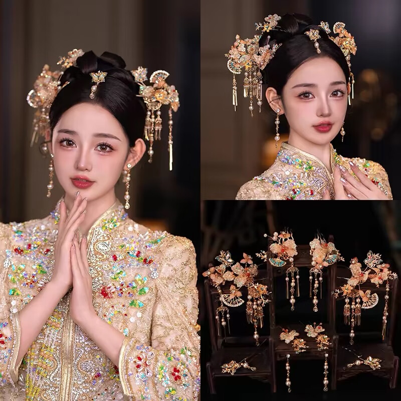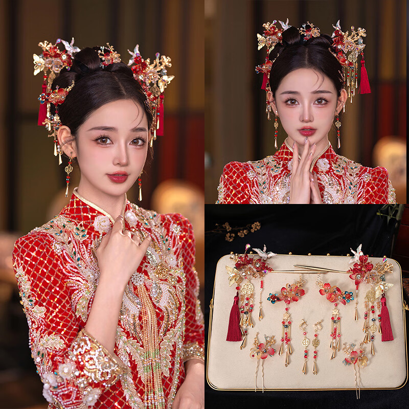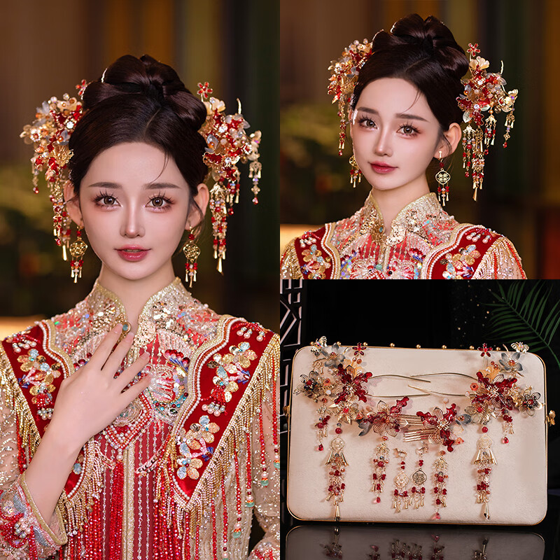 胖东来同款DL 1998秀禾服头饰新中式秀禾2025新款结婚龙凤褂大 新娘结婚头饰+耳夹