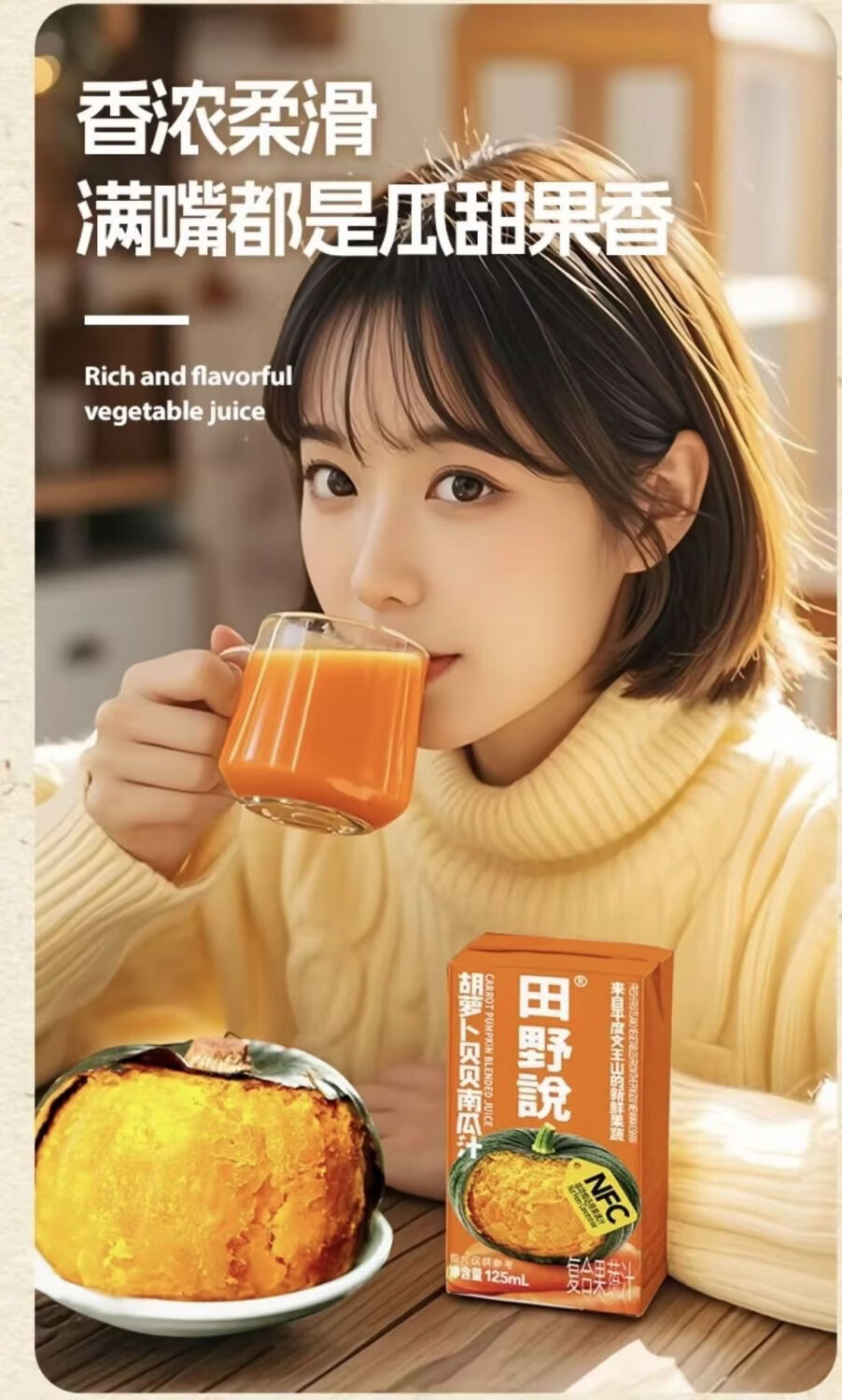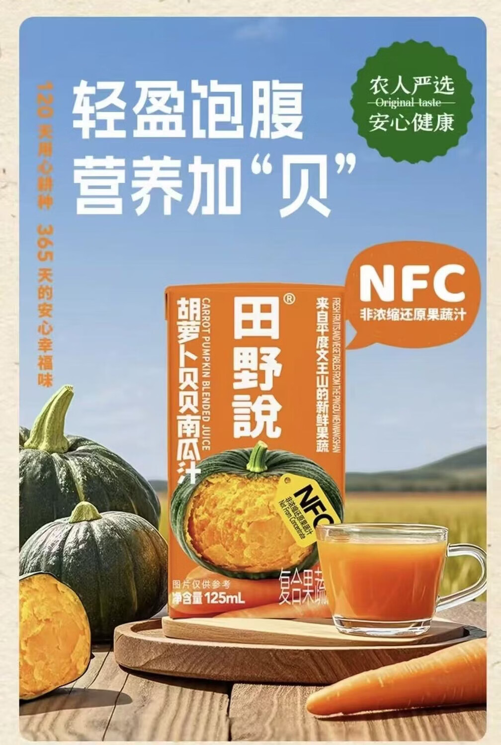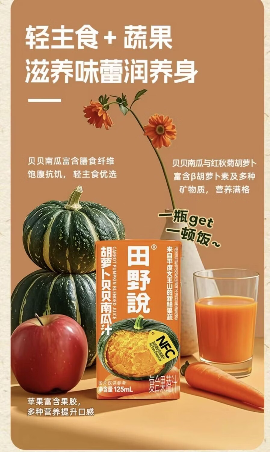 田野说贝贝南瓜胡萝卜复合果蔬汁无添加0蔗糖轻食液断饱腹膳食纤维 1箱(共125ml*16盒)