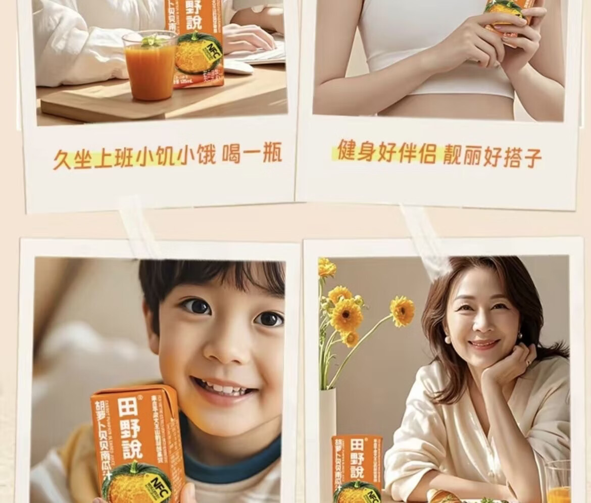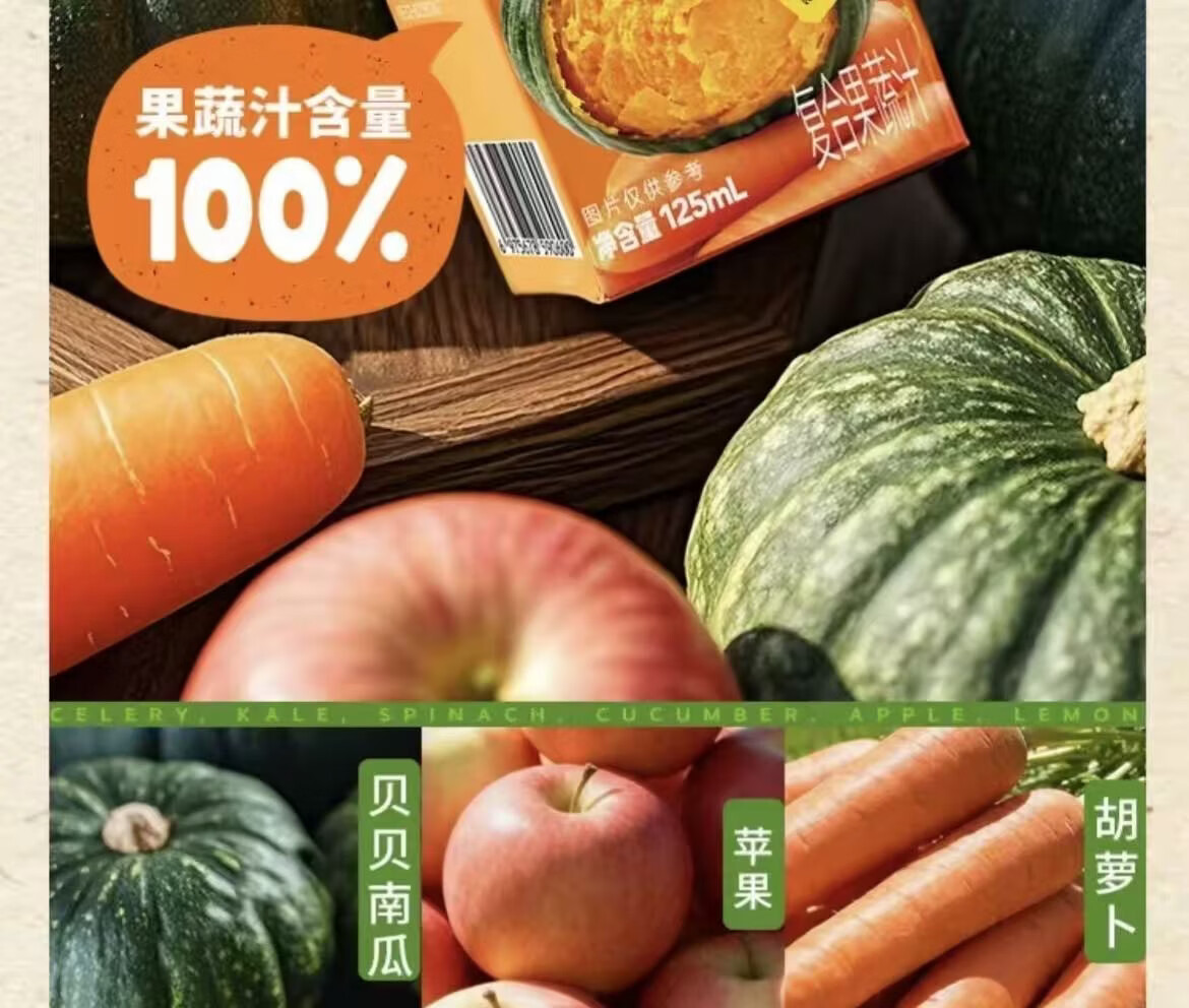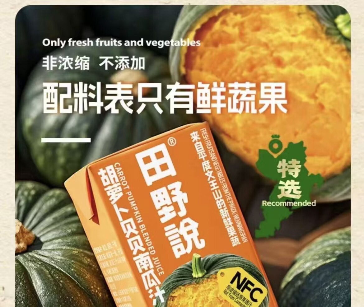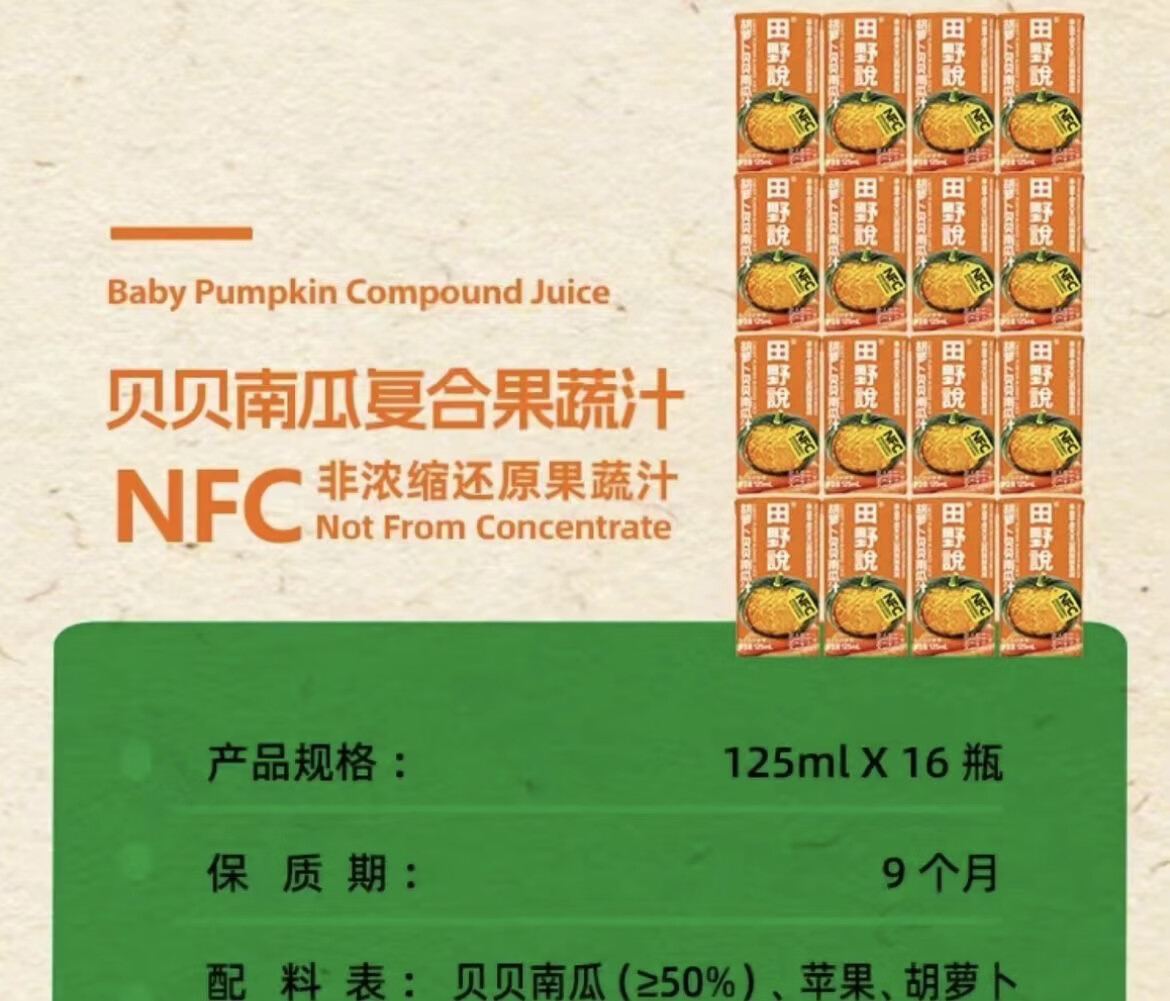 田野说贝贝南瓜胡萝卜复合果蔬汁无添加0蔗糖轻食液断饱腹膳食纤维 1箱(共125ml*16盒)
