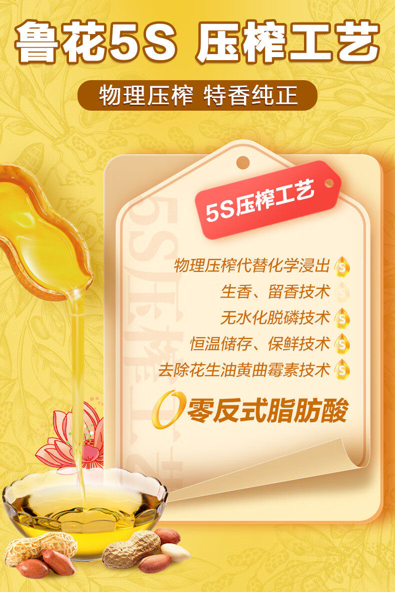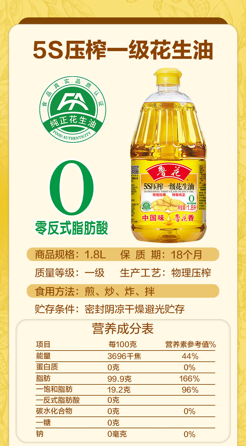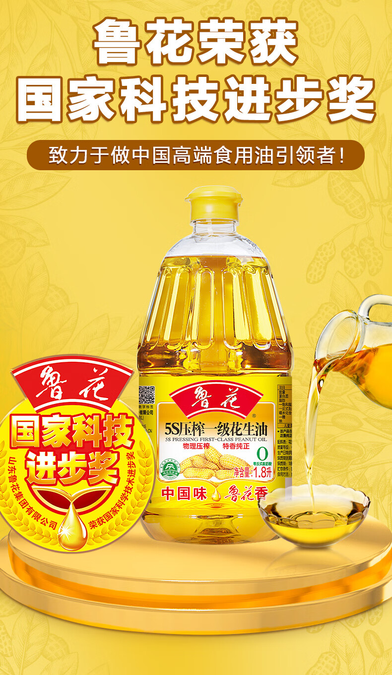 鲁花【保真花生油】5S 物理压榨 压榨一级 花生油1.8L