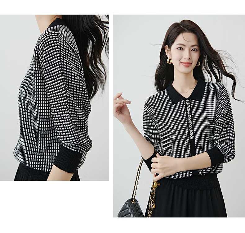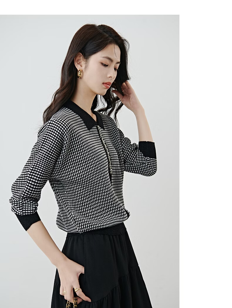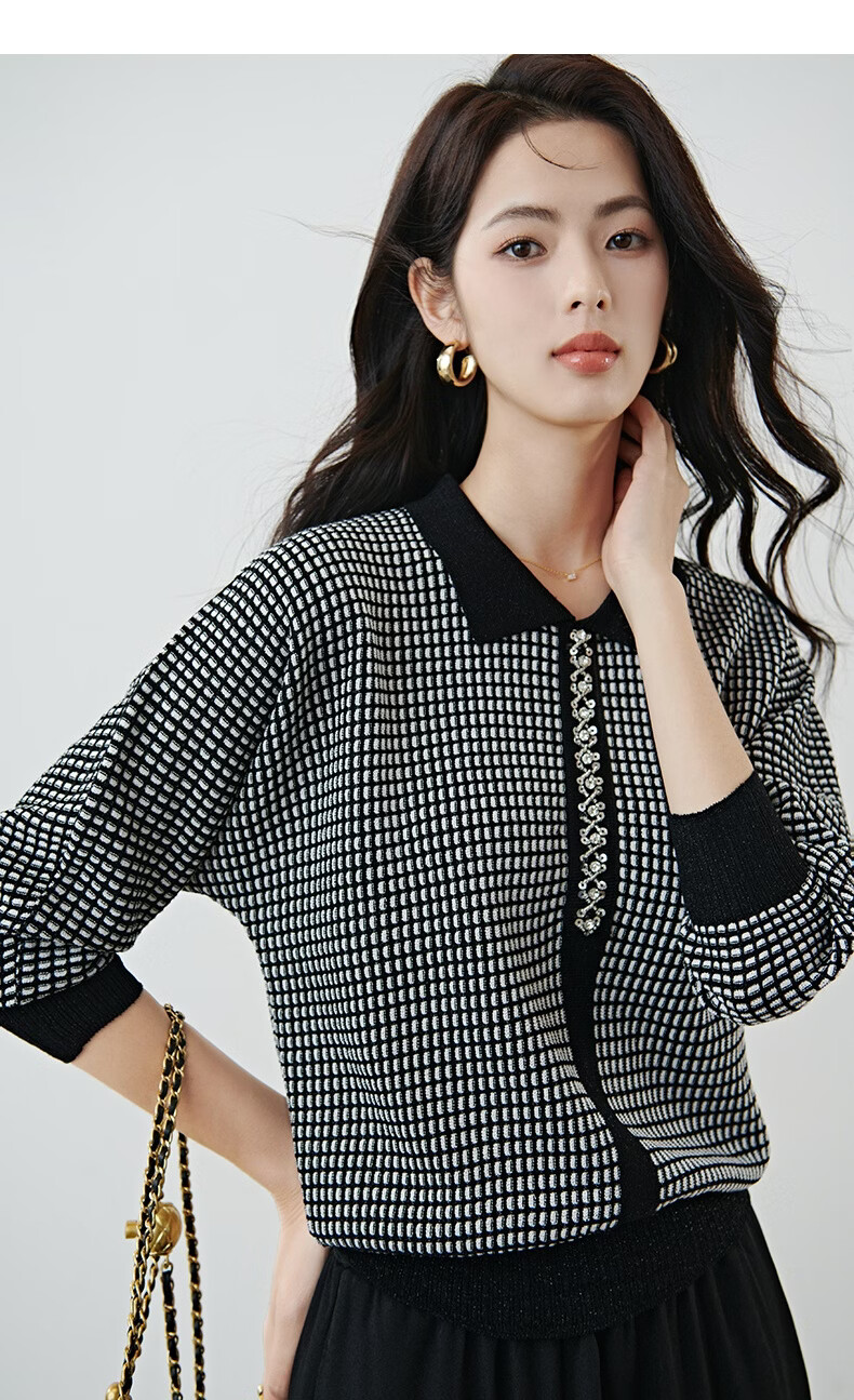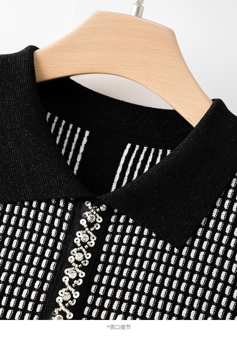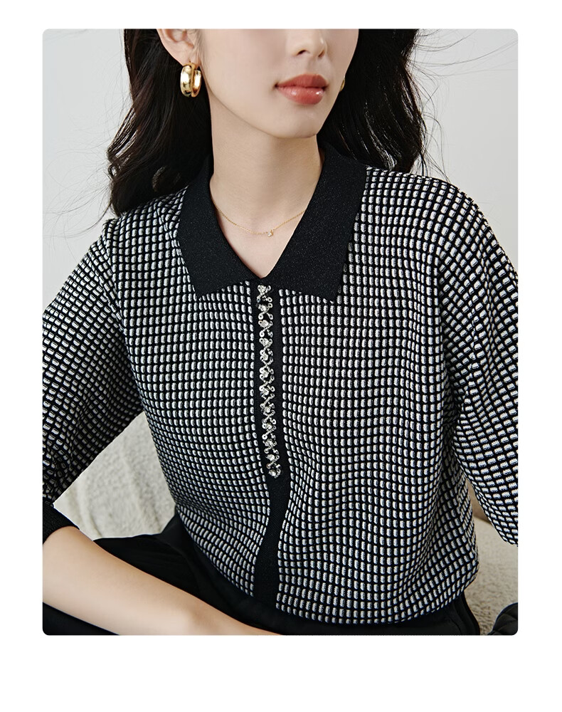 晚白2026年春款时尚高级感翻领钉珠格纹毛衣显瘦遮肉弹力针织衫女 黑色 M