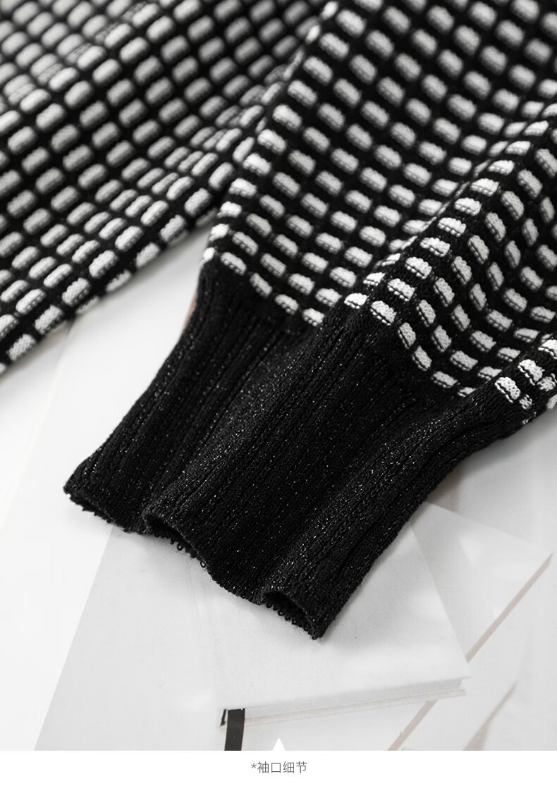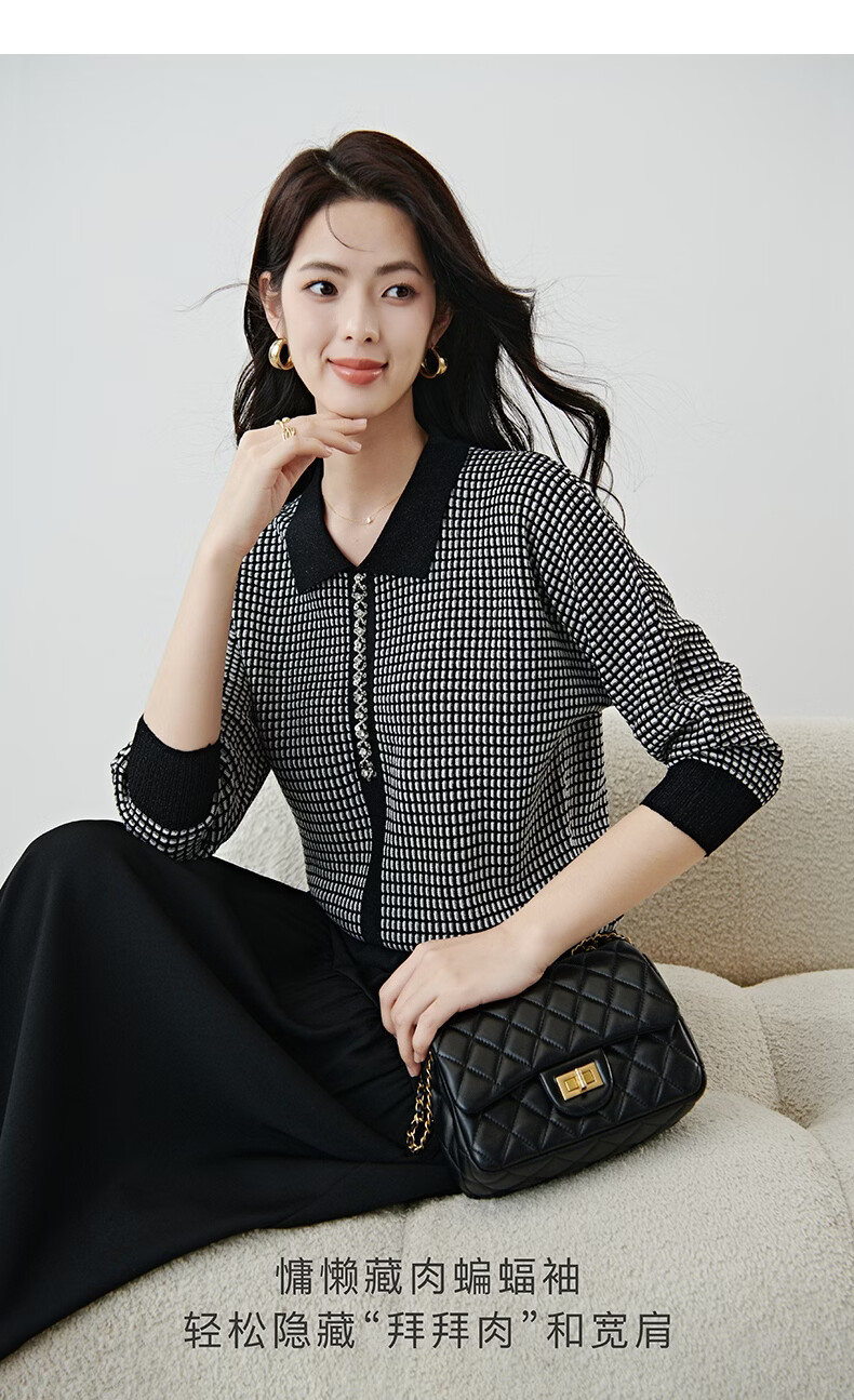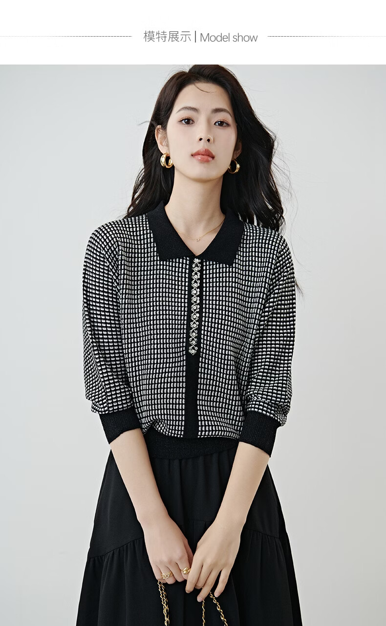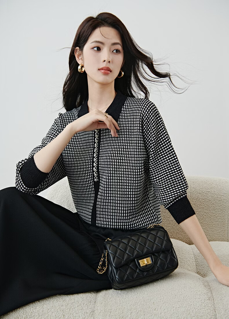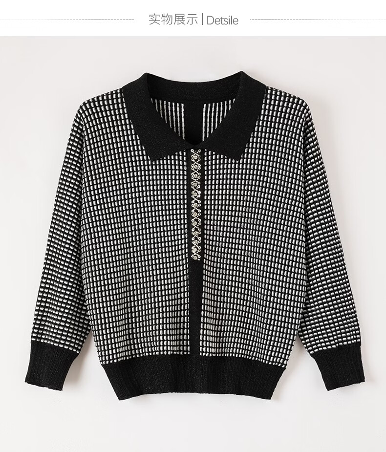 晚白2026年春款时尚高级感翻领钉珠格纹毛衣显瘦遮肉弹力针织衫女 黑色 M