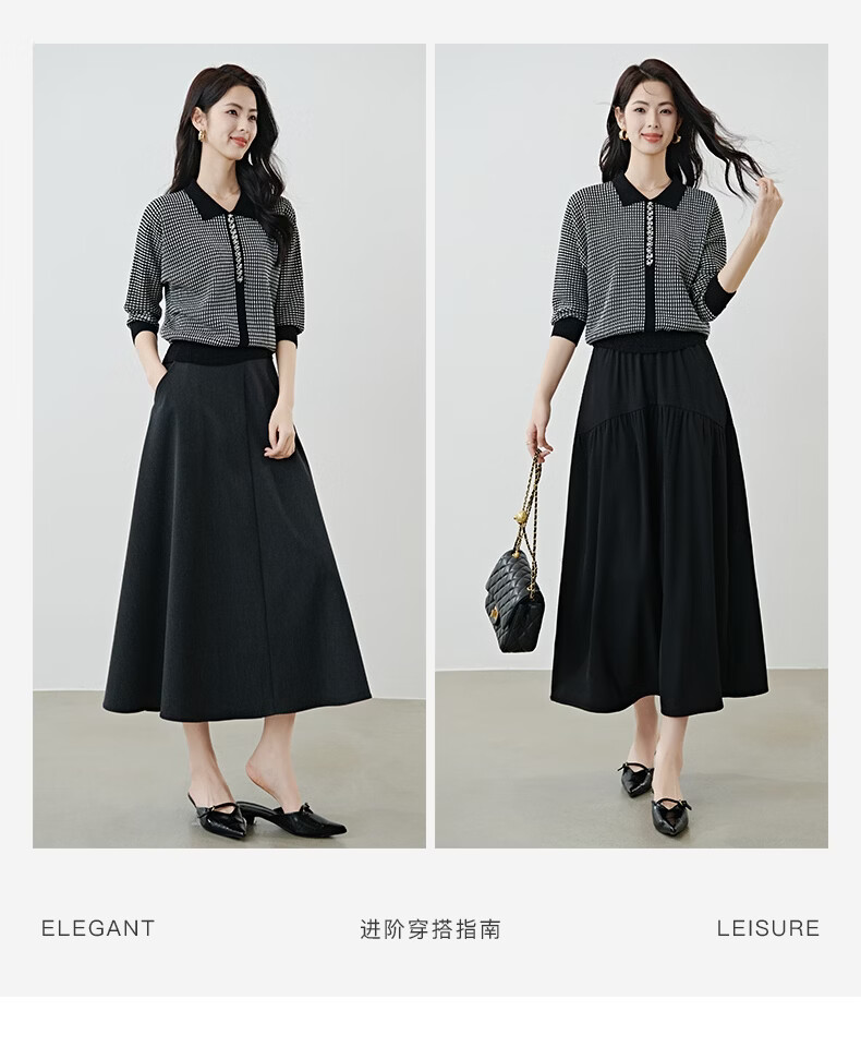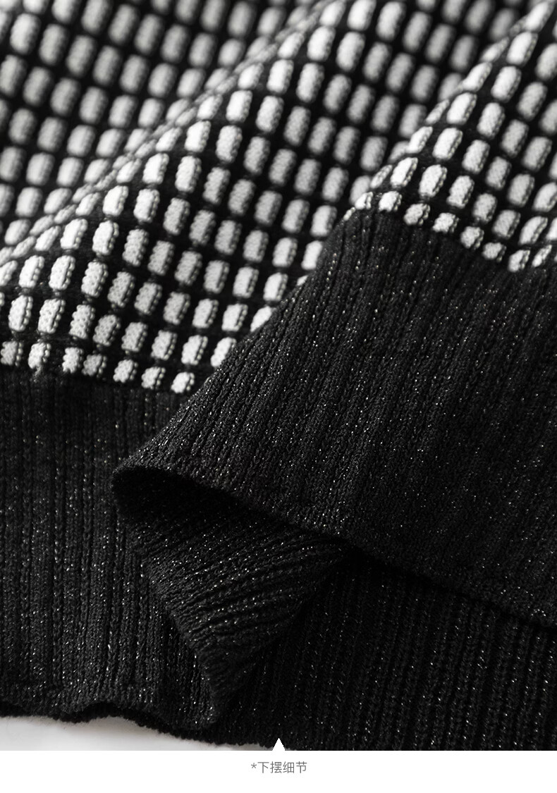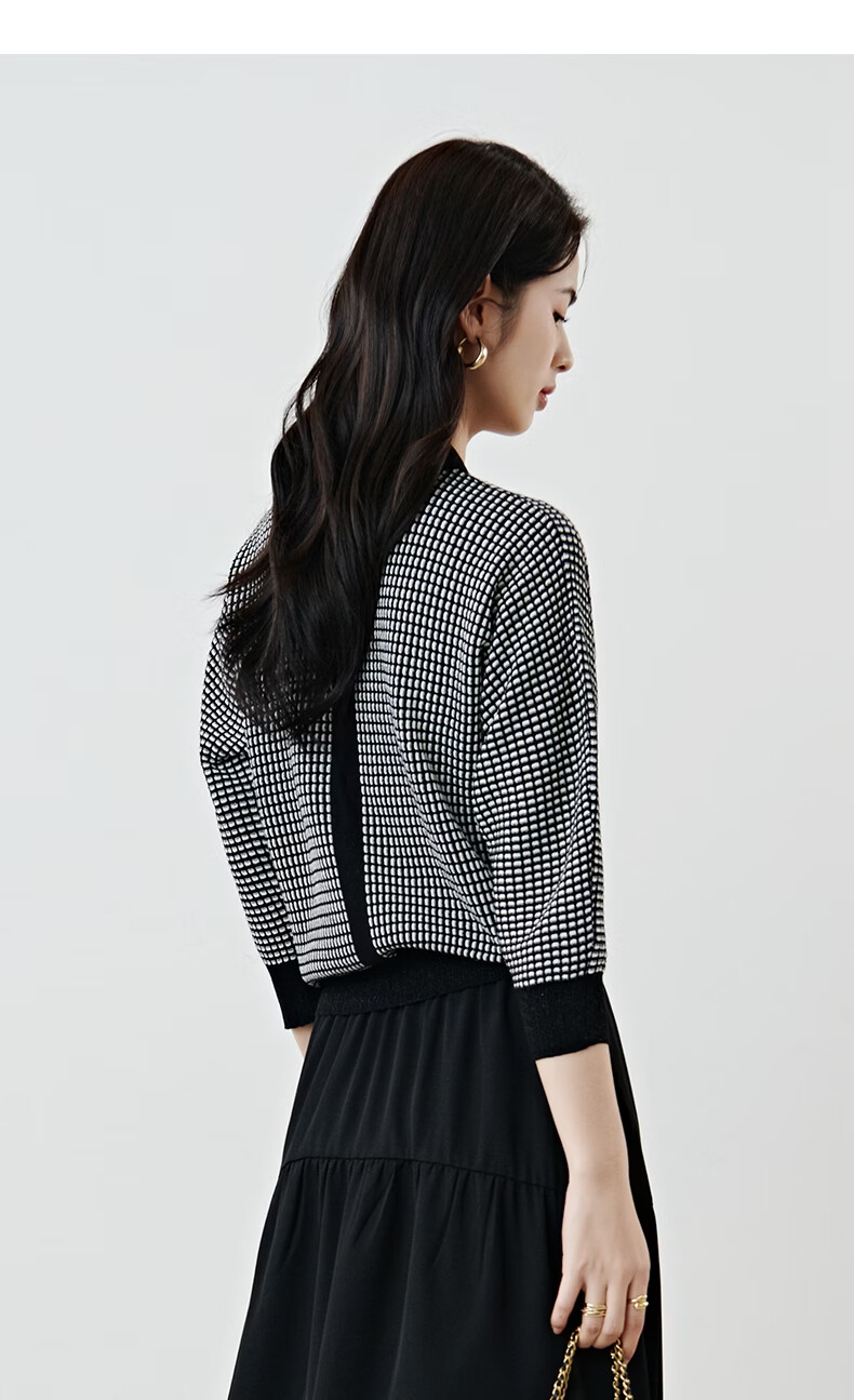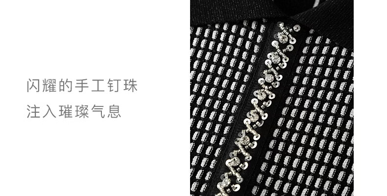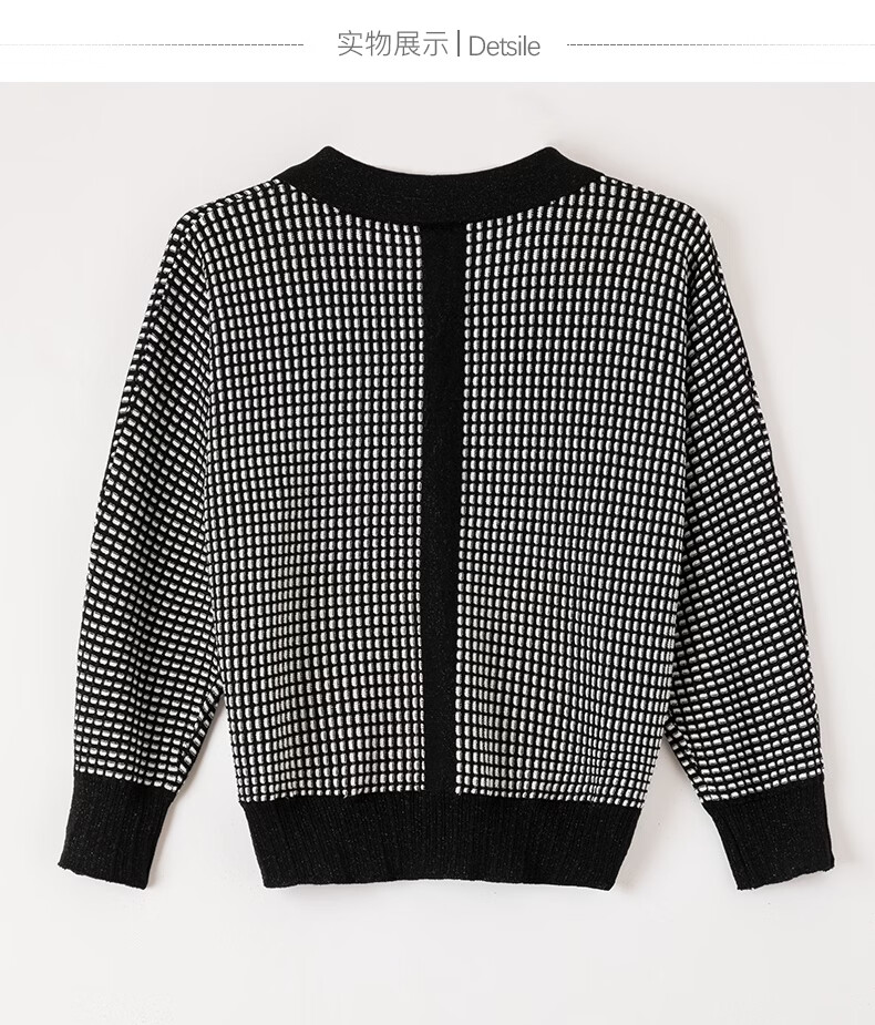 晚白2026年春款时尚高级感翻领钉珠格纹毛衣显瘦遮肉弹力针织衫女 黑色 M