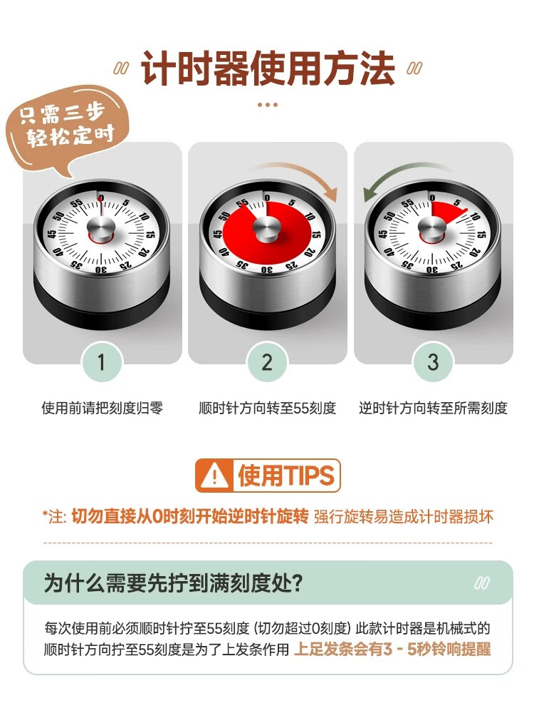 京东物流 不锈钢厨房定时器煮蛋烘培闹钟自动提醒器机械计时器 【颜色随机】可磁吸