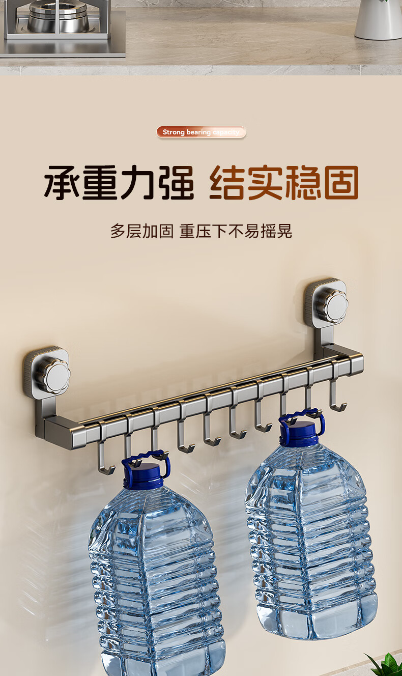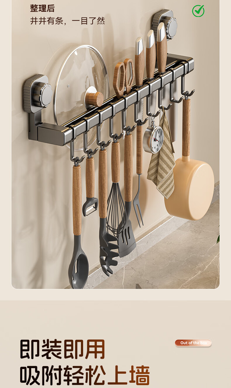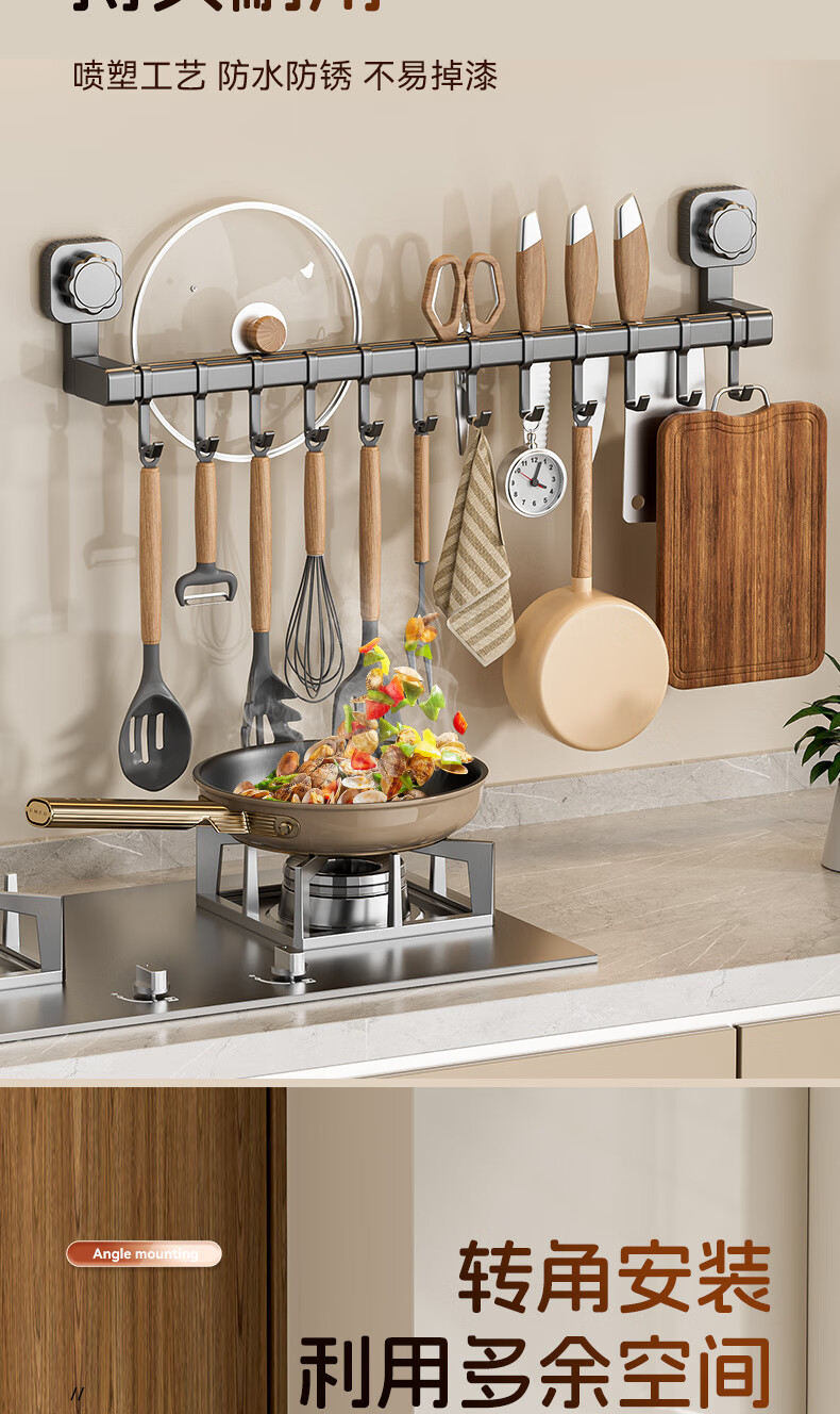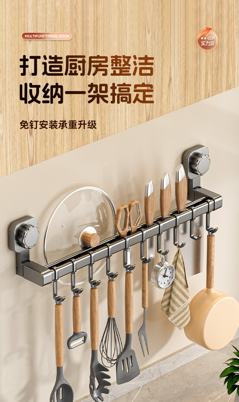馨婺家吸盘挂钩厨房多功能用品置物架锅具收纳架免打孔家用铲子勺子挂架 枪灰色-双杆30cm【强力吸盘】