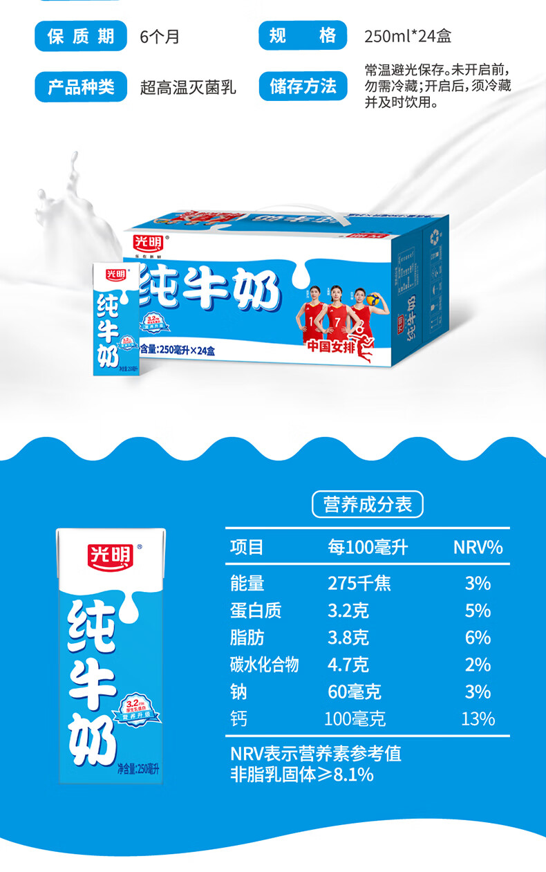 光明纯牛奶250mL*24盒3.2g原生乳蛋白营养早餐年货送礼【部分10月产】