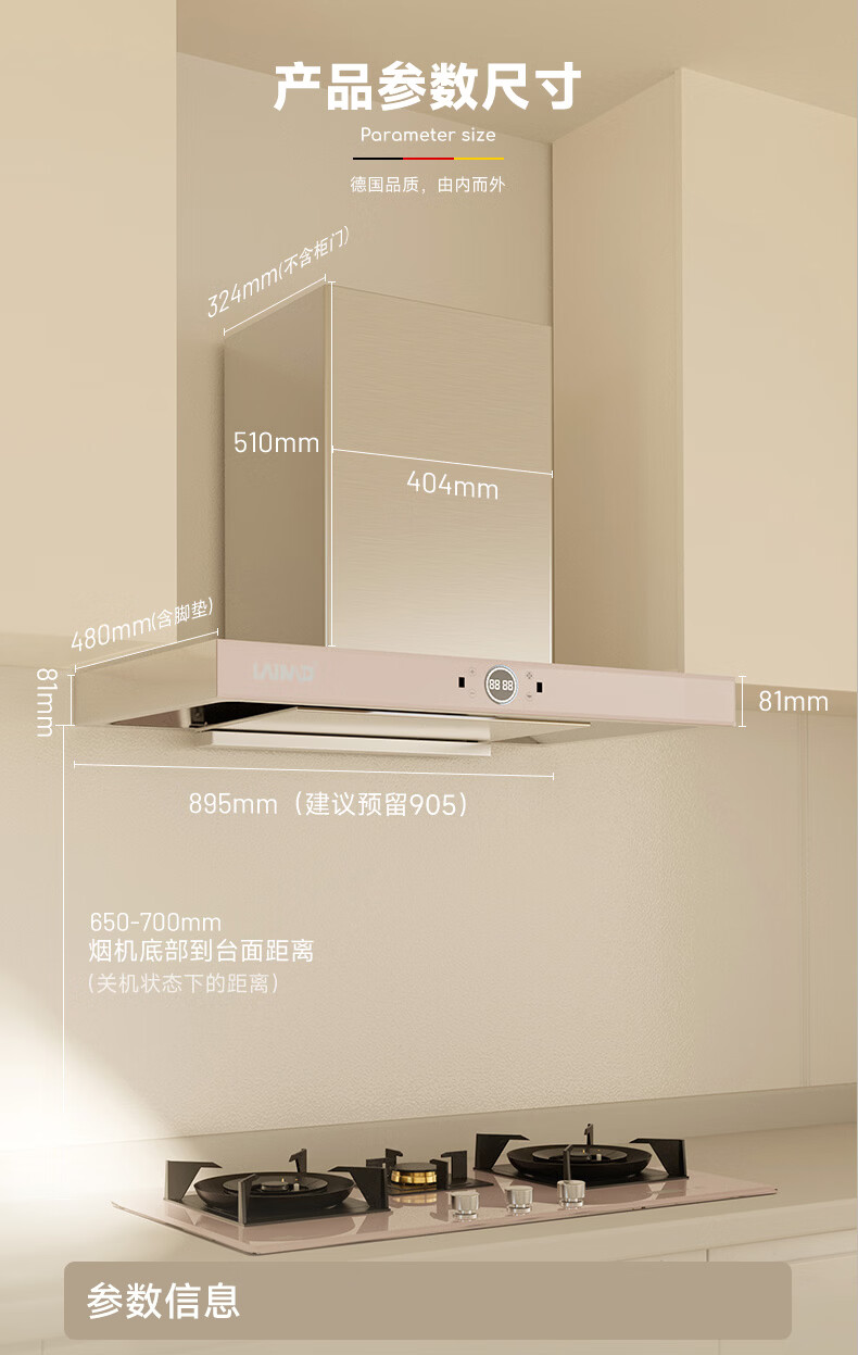 莱梅德(LAIMD)德国油烟机大吸力抽油烟机变频顶吸式 粉色油烟机 高温自清洁免拆洗 CXW-9020