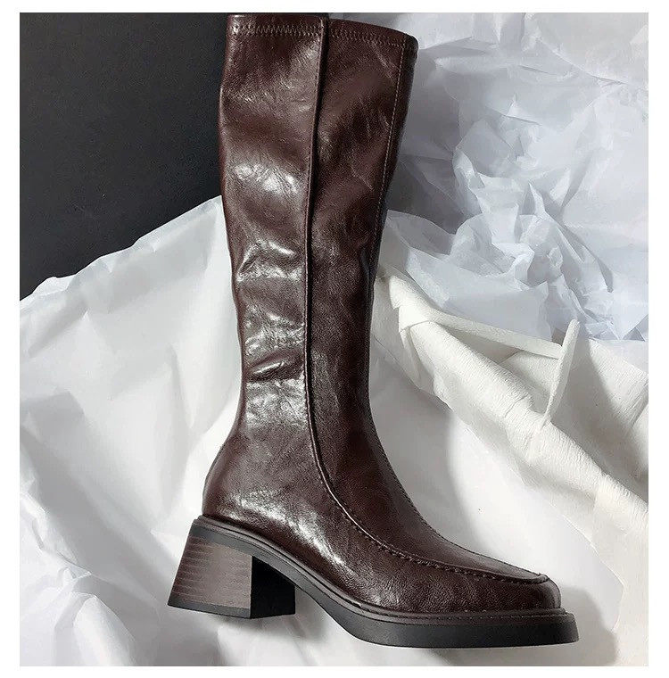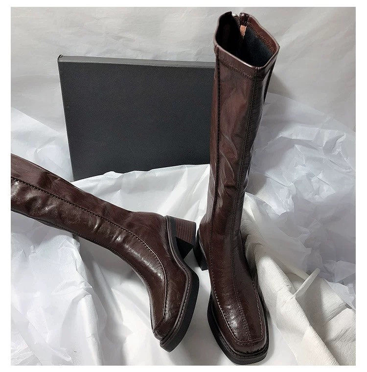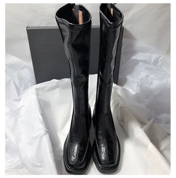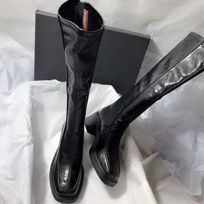稻草人(MEXICAN)不过膝巨好看长筒靴女粗跟高跟2026秋冬季新款真皮黑色高筒骑士靴 黑色【单里】 35