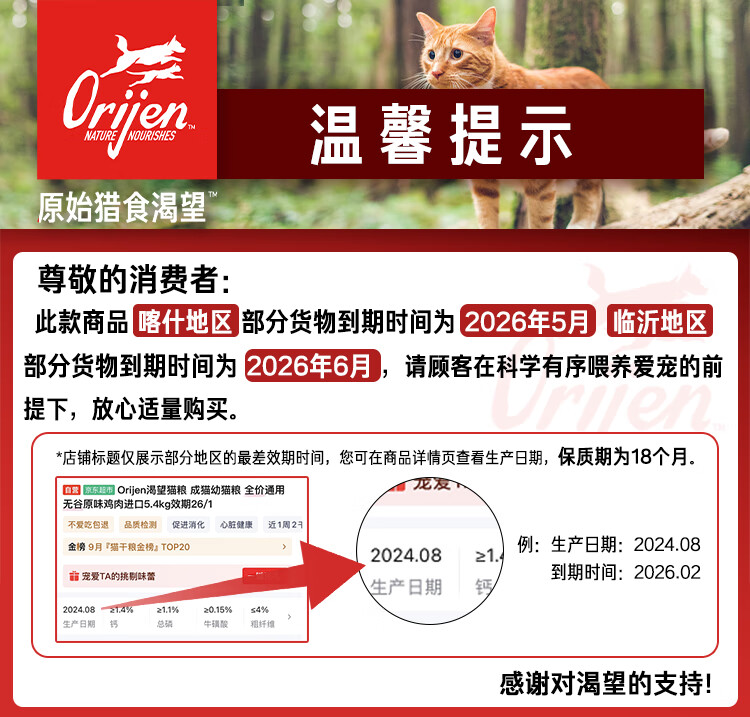 Orijen渴望猫粮 成猫幼猫粮 全价通用无谷原味鸡肉进口5.4kg效期26/8