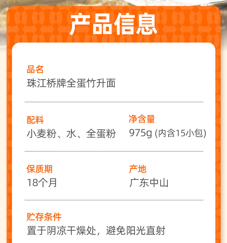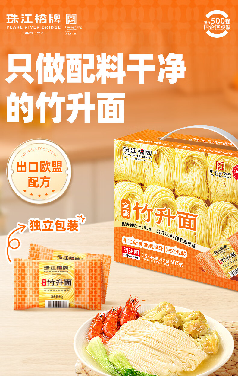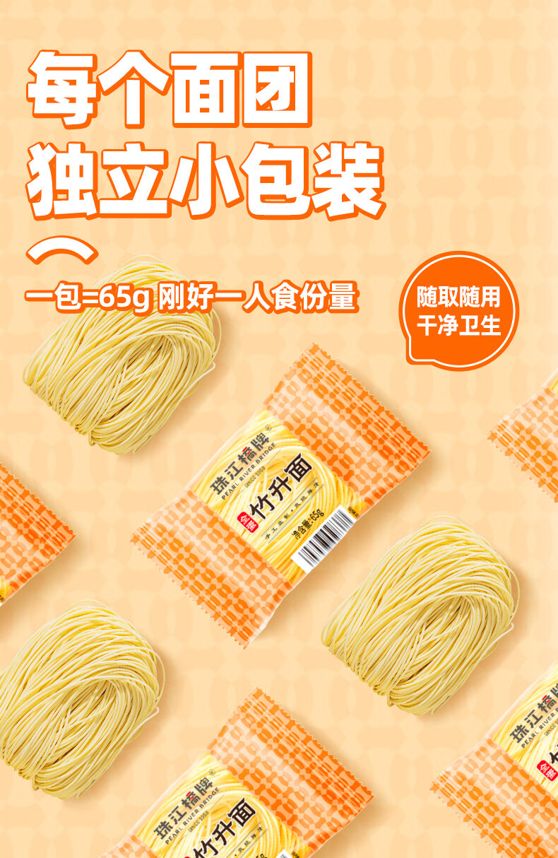 珠江桥牌全蛋竹升面65g*15包 手工面云吞面儿童挂面鸡蛋面 0添加面条礼盒