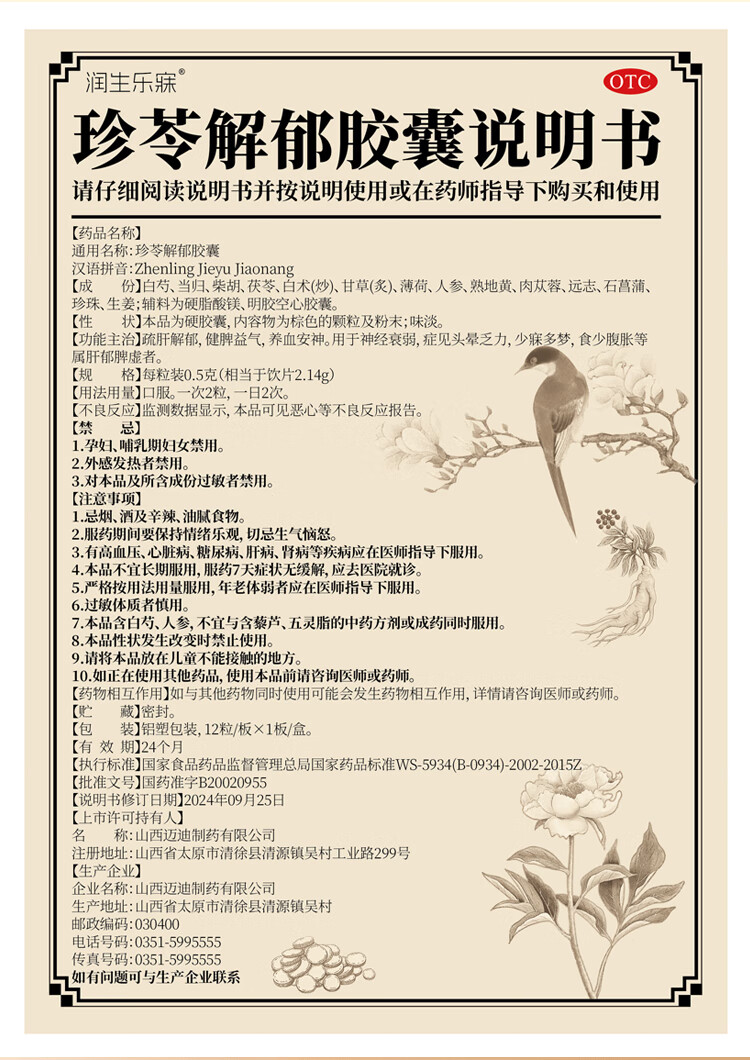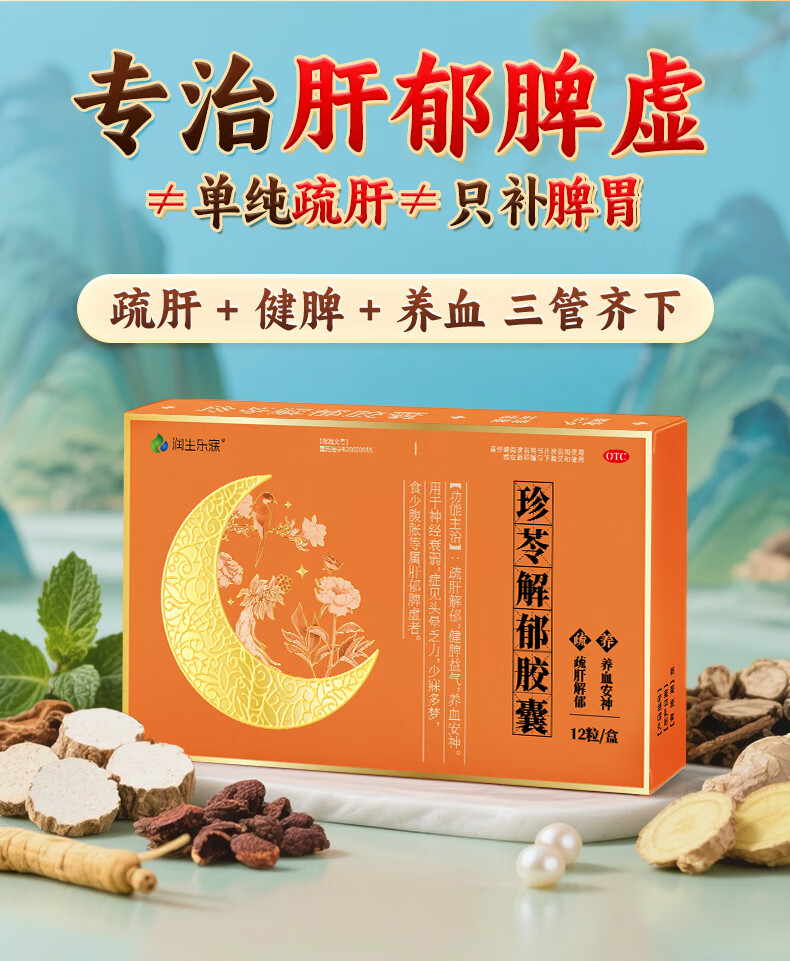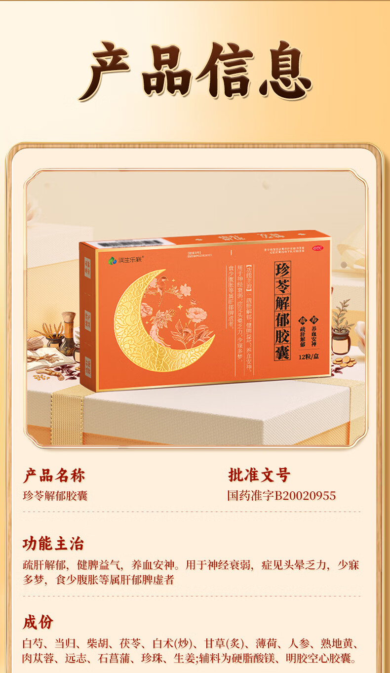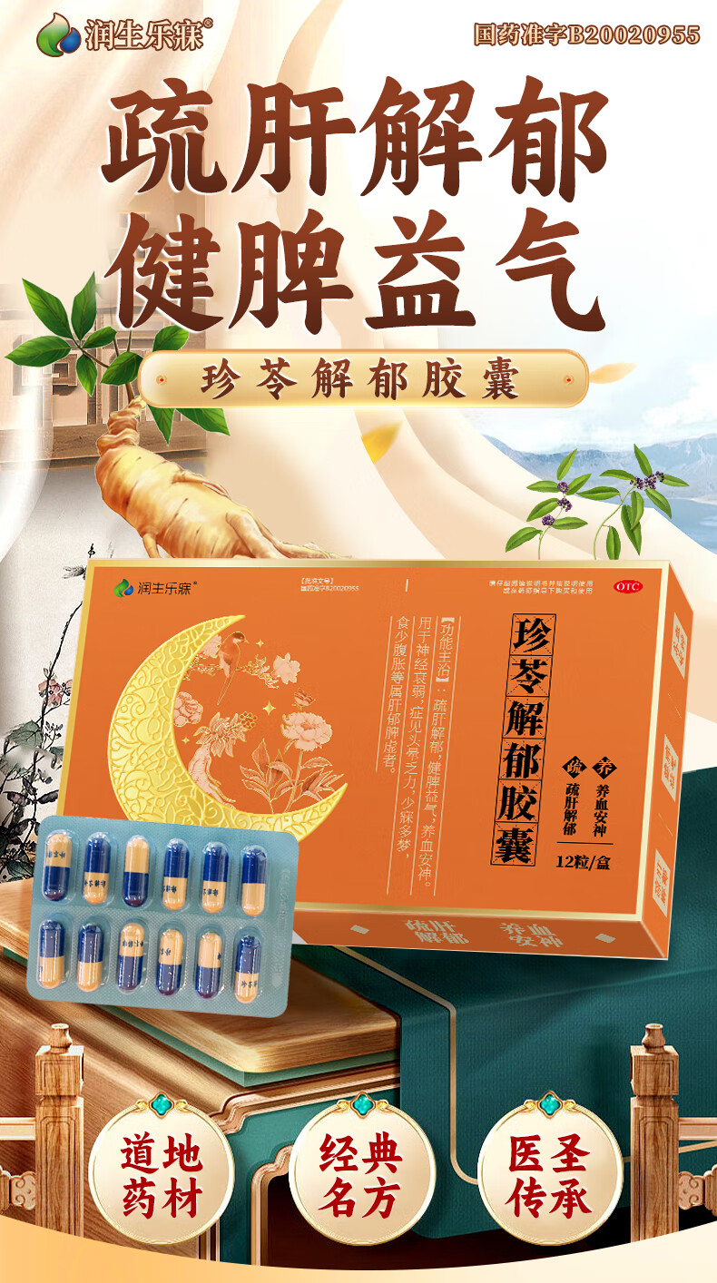 [润生乐寐]珍苓解郁胶囊 0.5g*12粒 2盒装 疏肝郁健脾益气养血安神治疗神经衰弱头晕乏力肝郁脾虚调理失眠多梦中成药otc 疏肝+健脾+养血安神