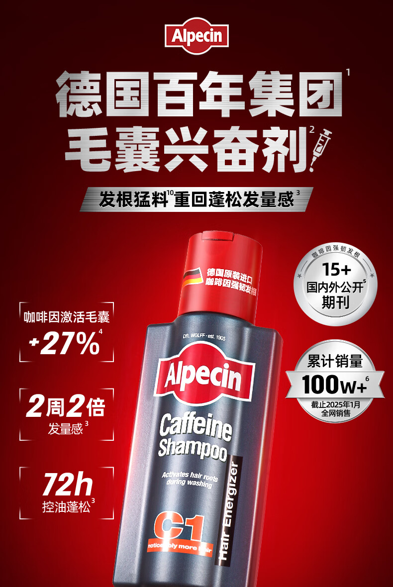 欧倍青(Alpecin)德国进口洗发水强韧发根洗头膏男女适用洗发露250ml*3 C1咖啡因洗发水250ml*3瓶