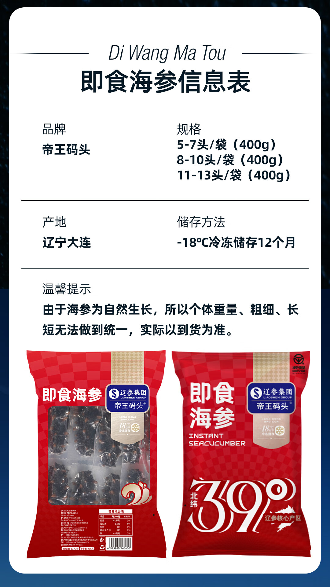 帝王码头即食海参400g真辽参送礼配料表干净交个朋友直播间同款绿色食品 8-10头/400g