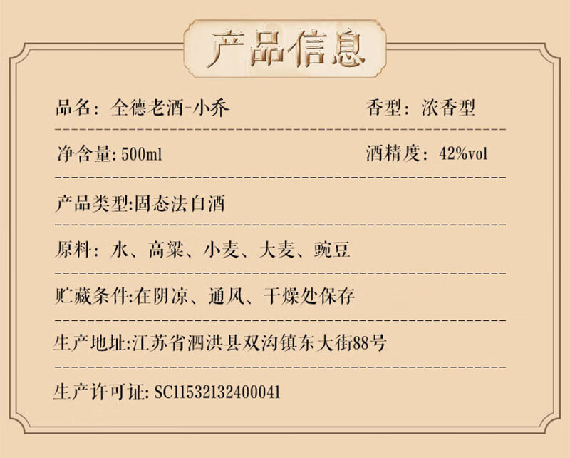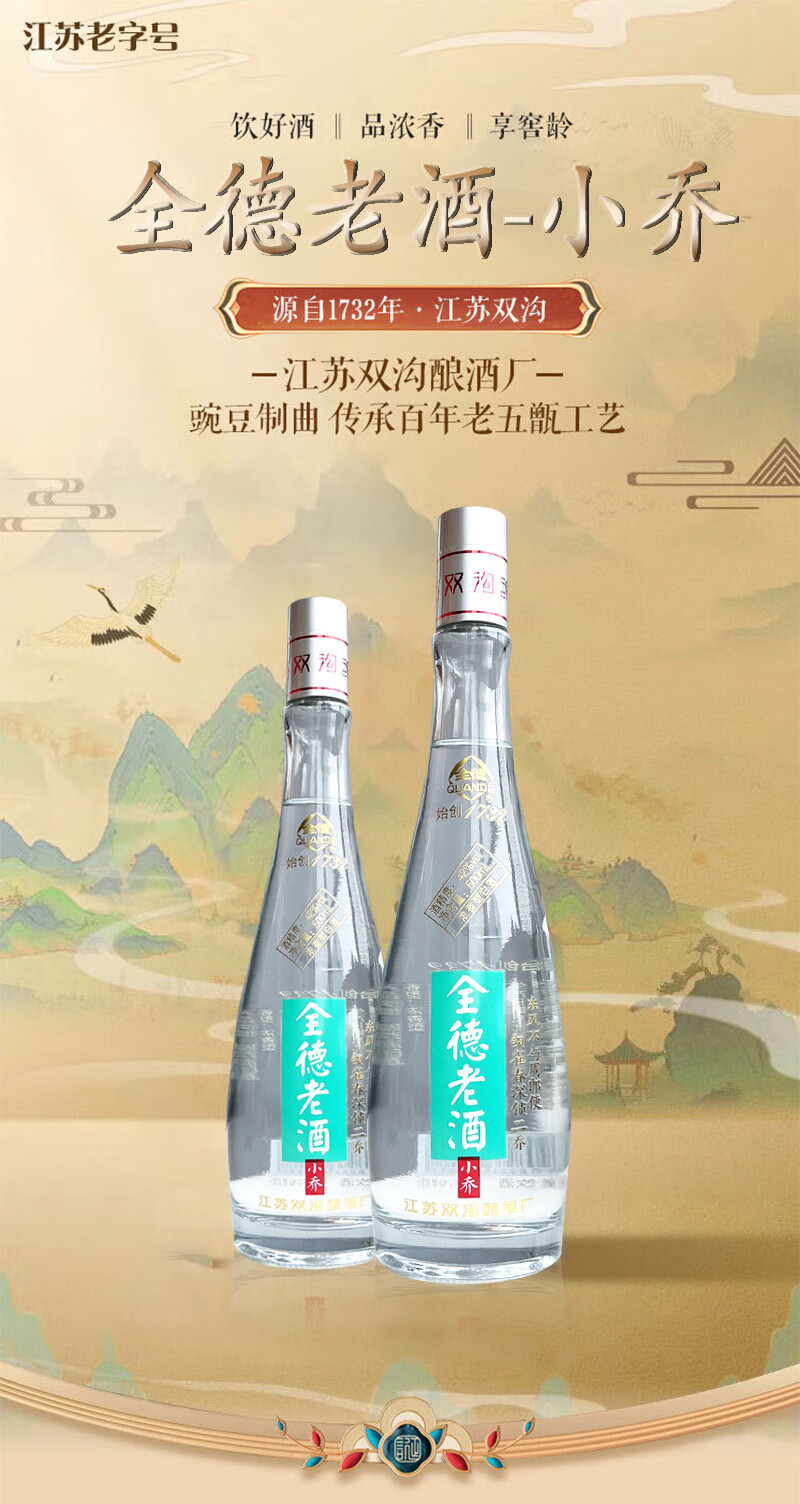 全德小乔42度白酒 江苏老字号始创1732年 浓香型白酒 纯粮酿造 42%vol 500mL 6瓶 整箱