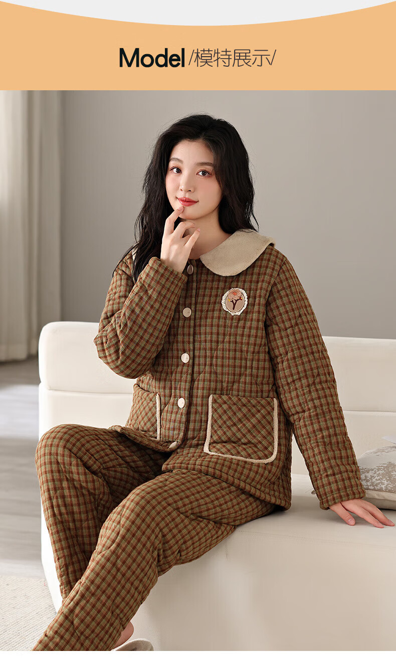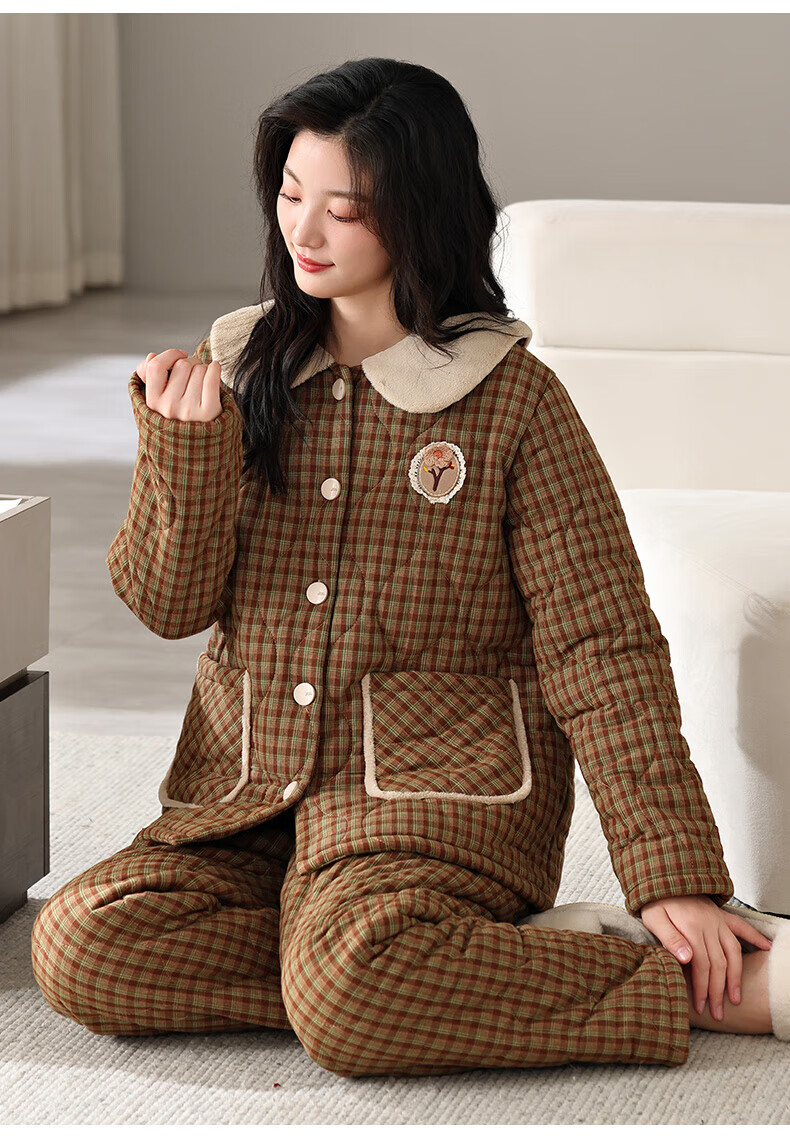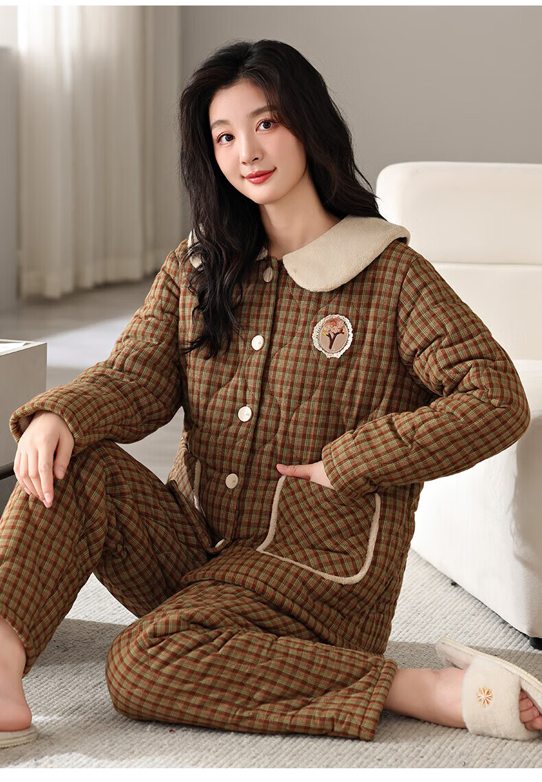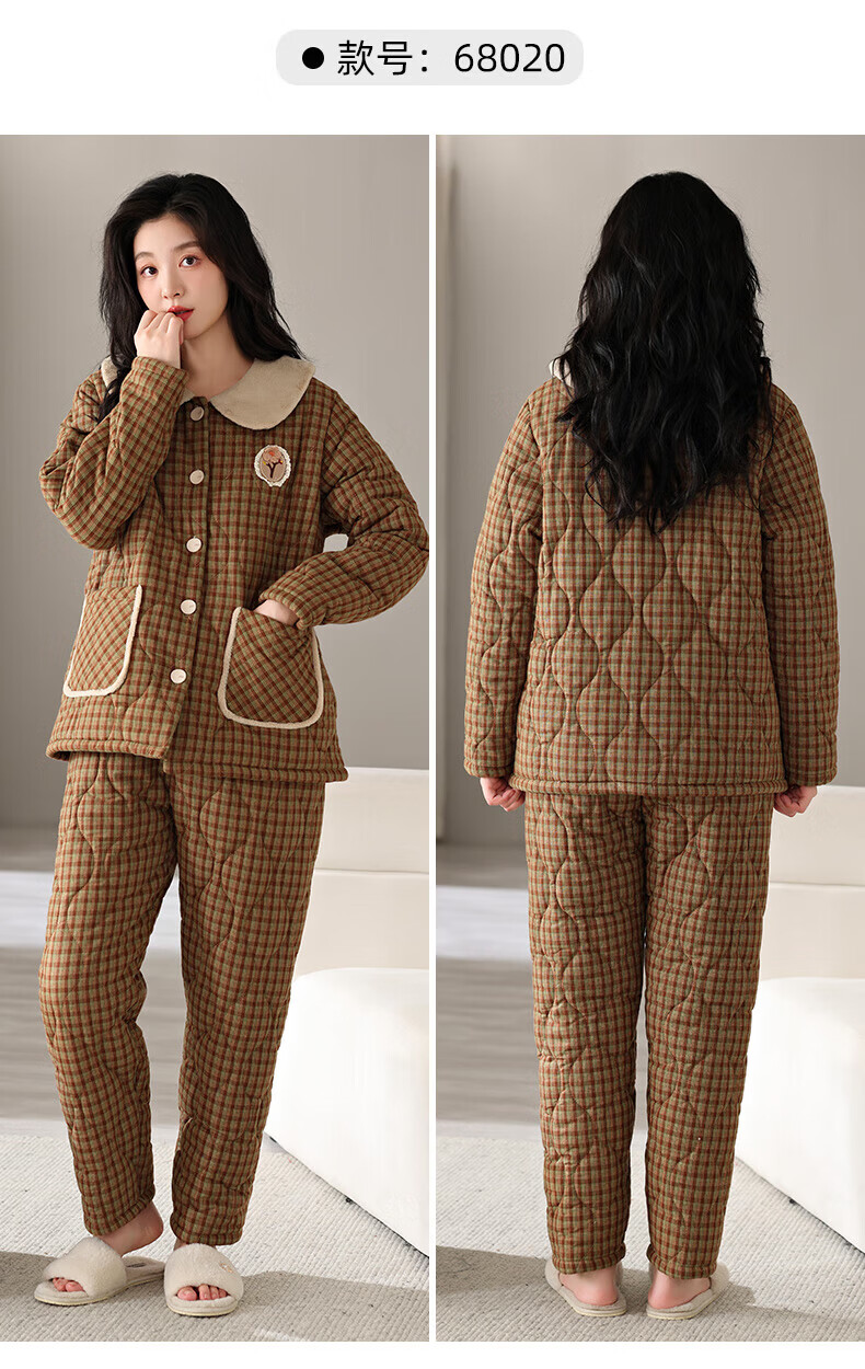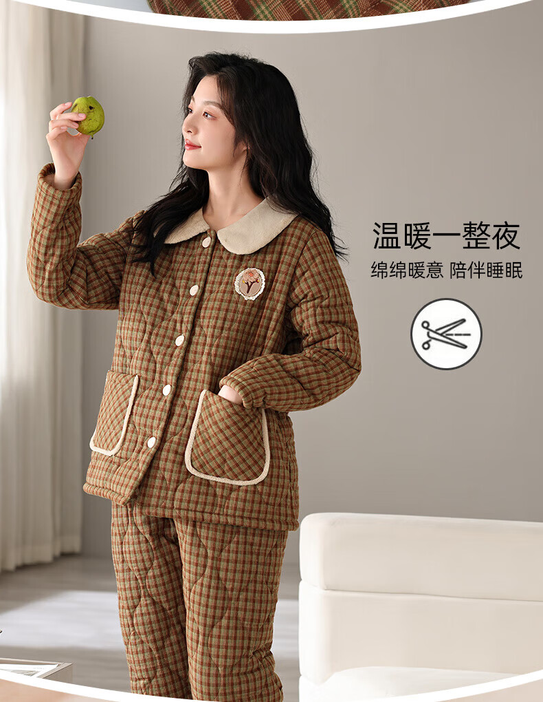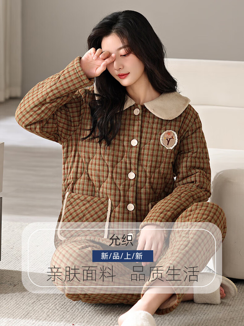 允织睡衣女冬季三层加厚加绒梭织纯棉夹棉袄秋冬款珊瑚绒高级感家居服 68020-浅褐 M (160) :建议90-110斤穿着