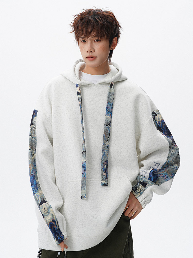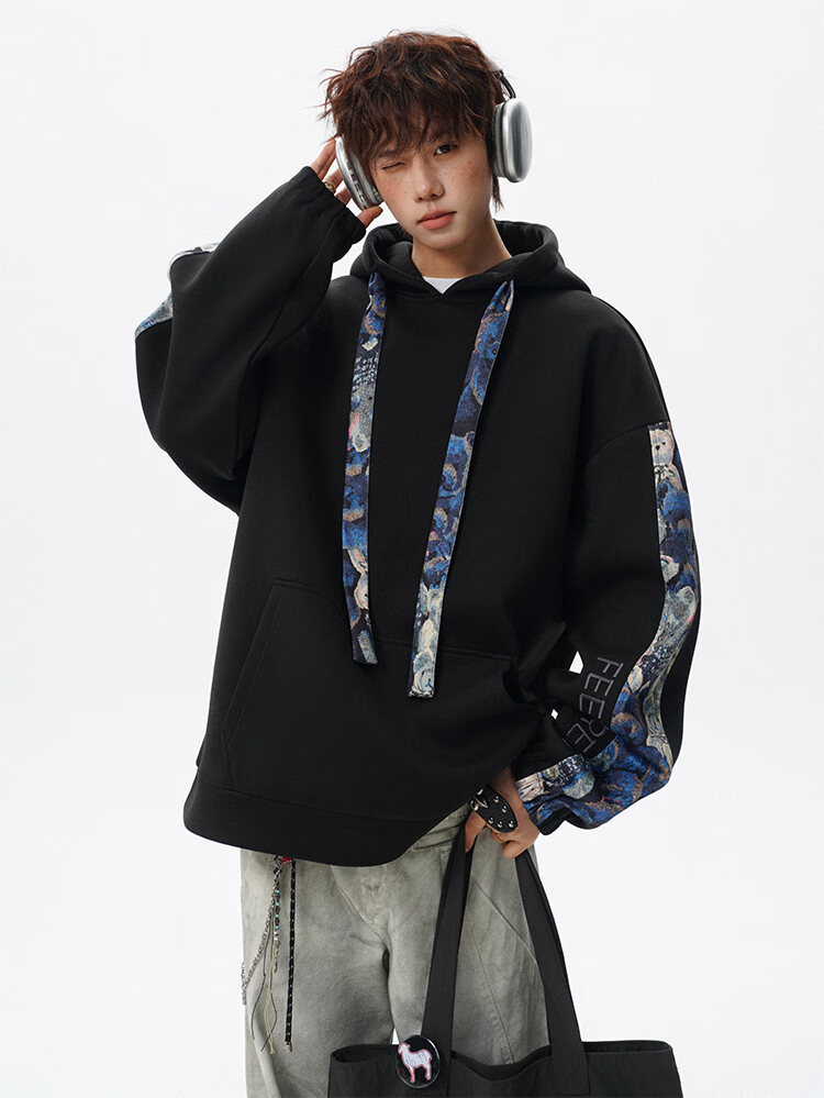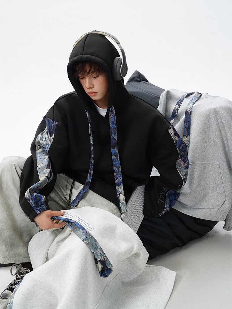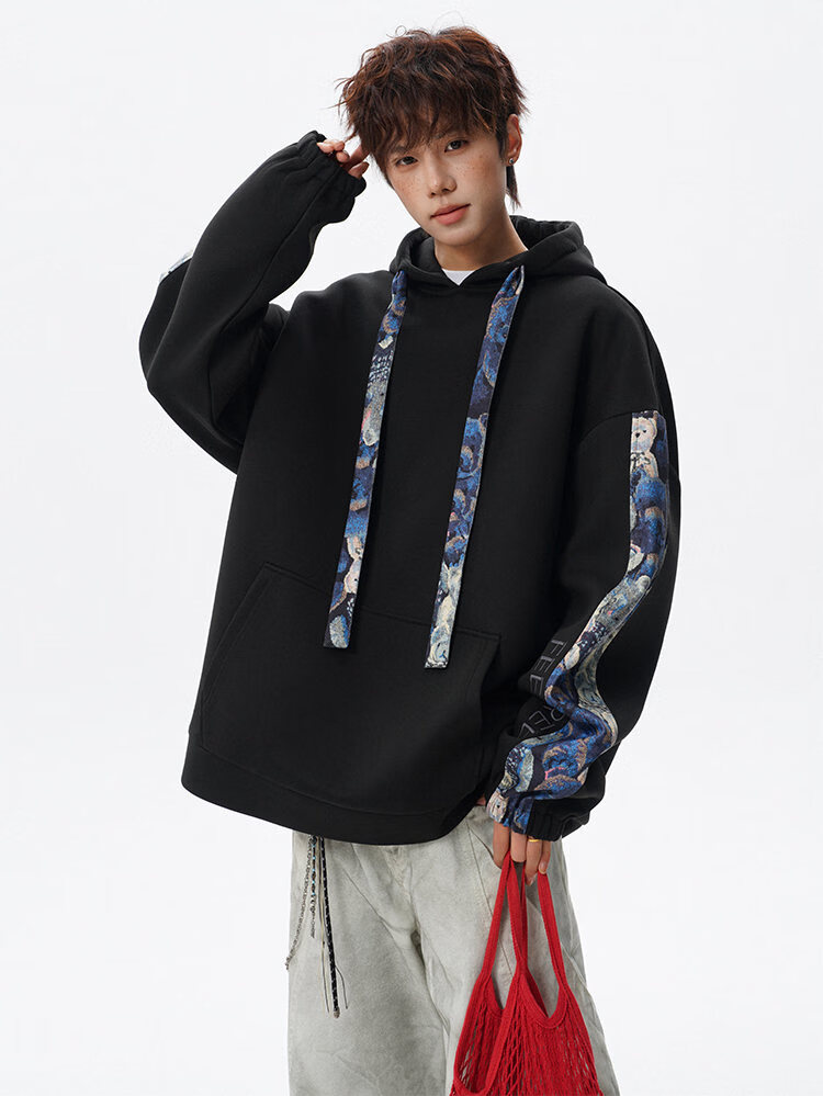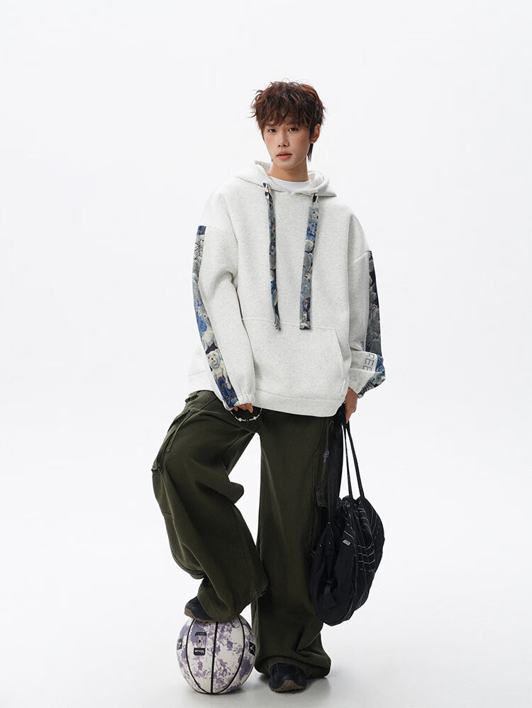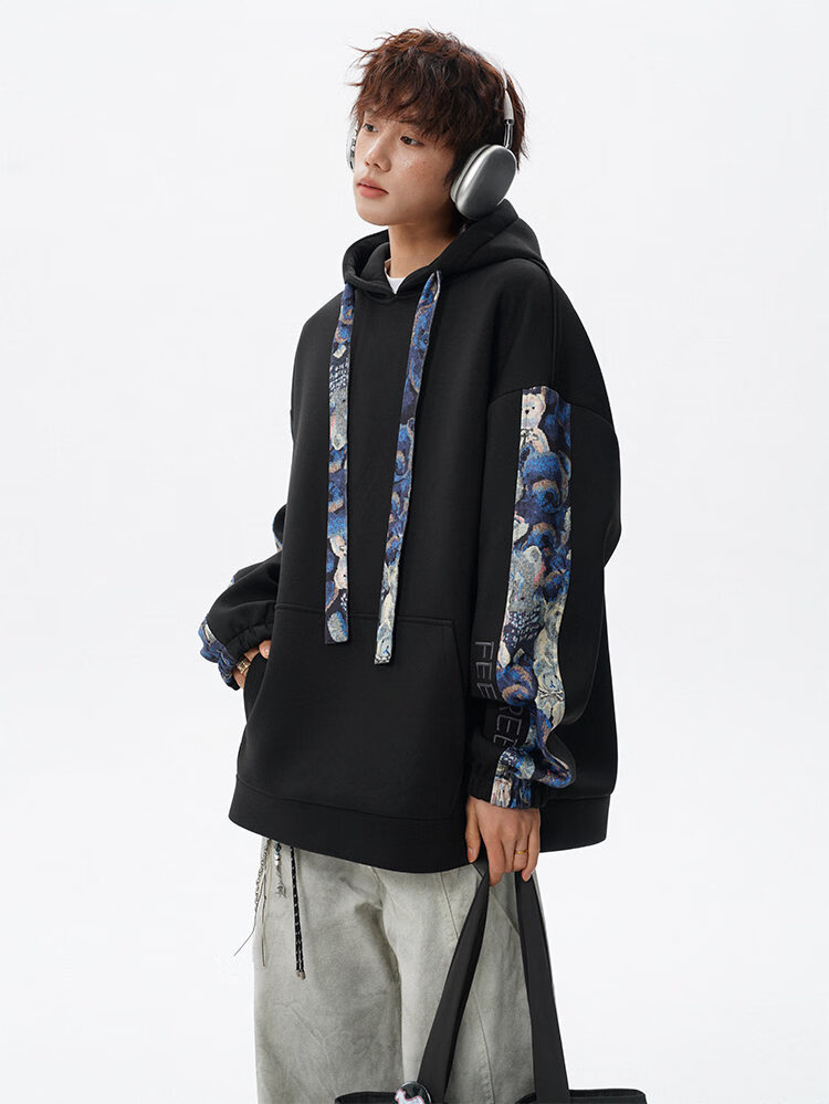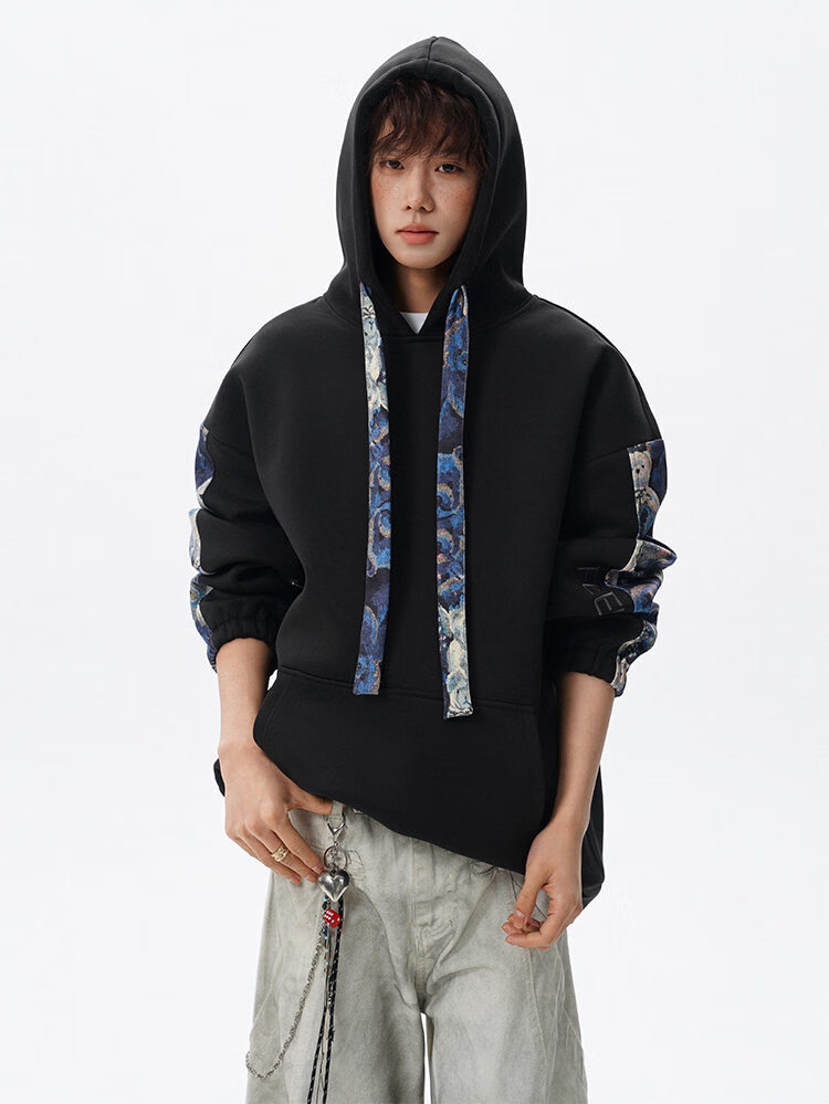 NEW OR MODE国潮小熊花纹拼接连帽卫衣男春秋美式撞色抽绳设计感宽松情侣外套 深灰色【高品质】 M 【建议90-110斤】