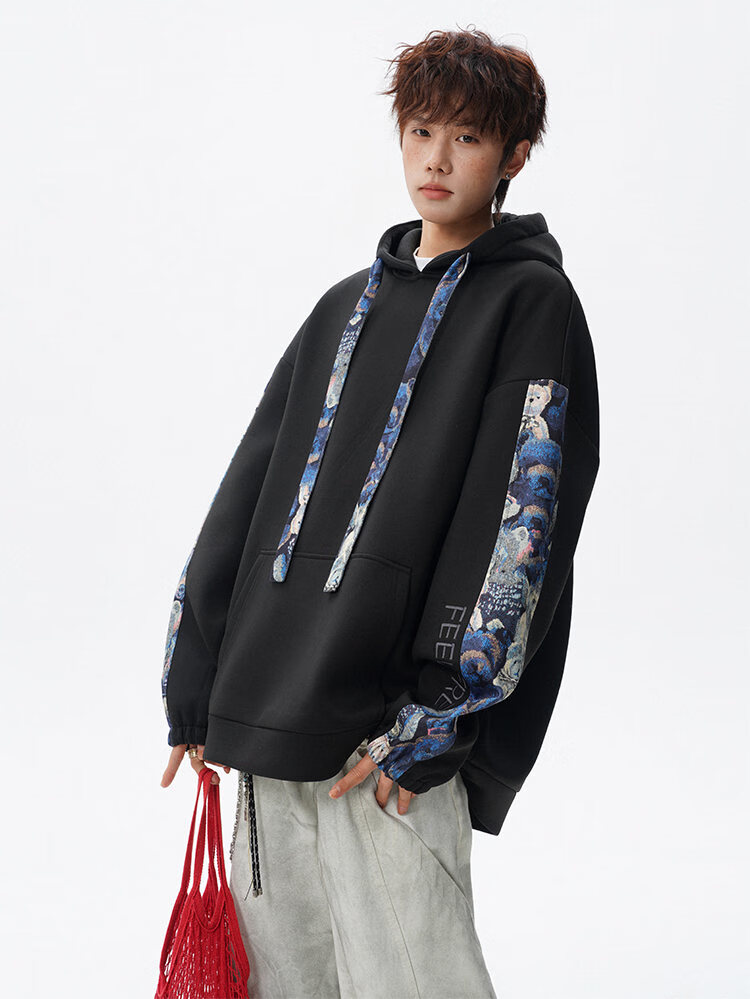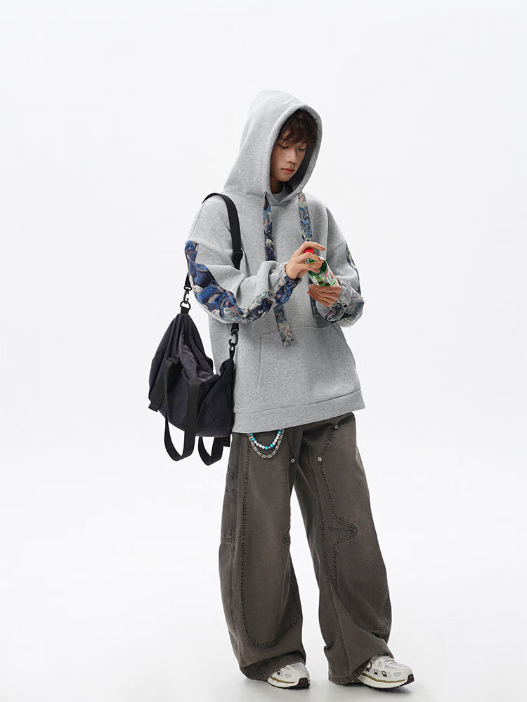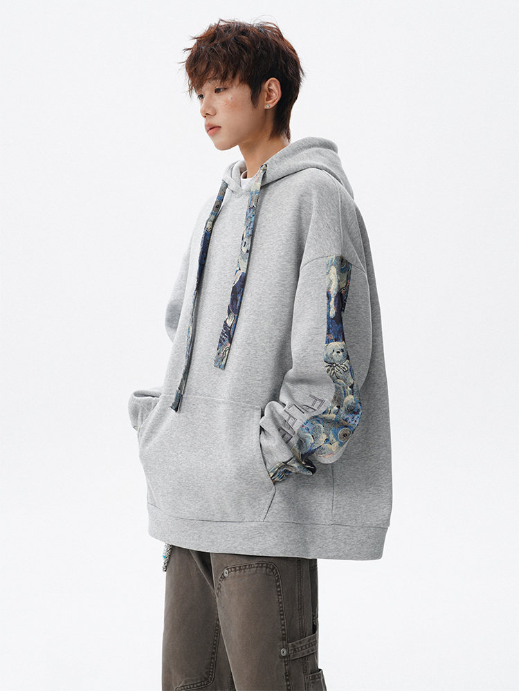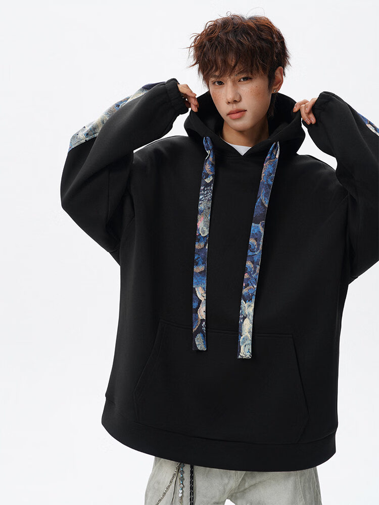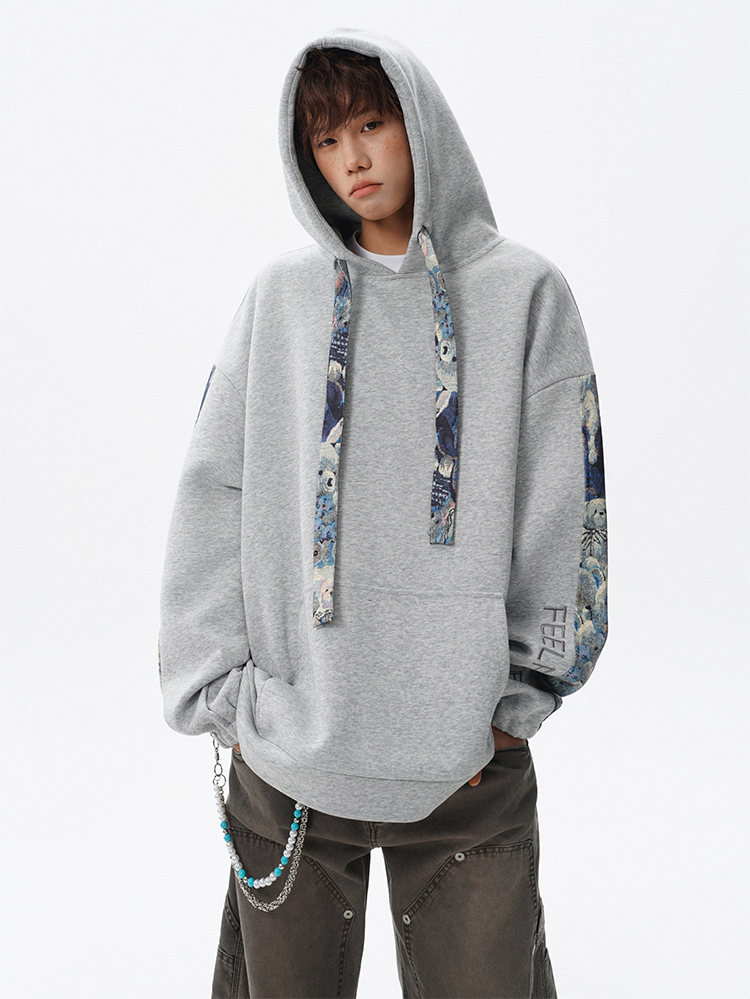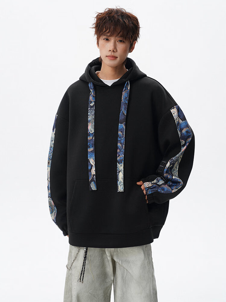 NEW OR MODE国潮小熊花纹拼接连帽卫衣男春秋美式撞色抽绳设计感宽松情侣外套 深灰色【高品质】 M 【建议90-110斤】