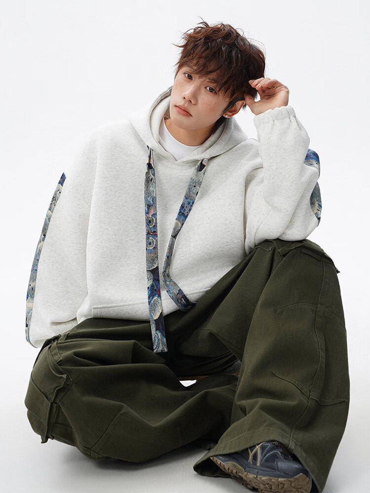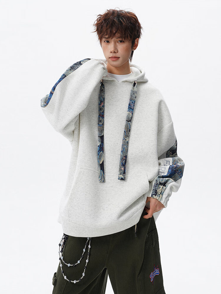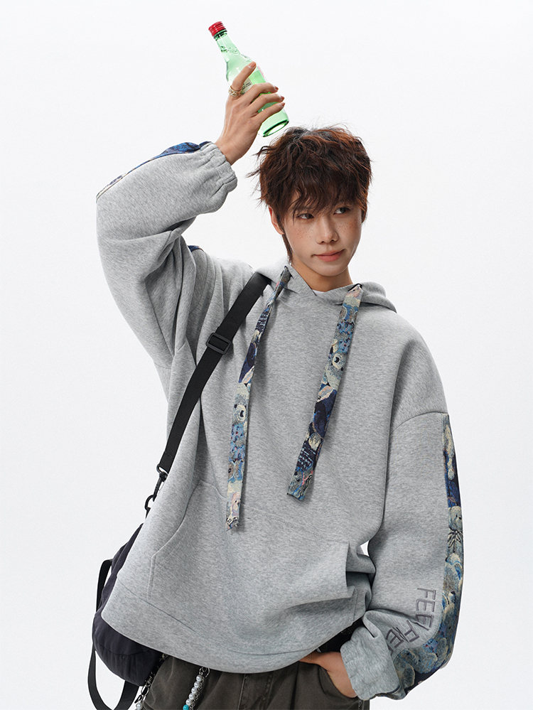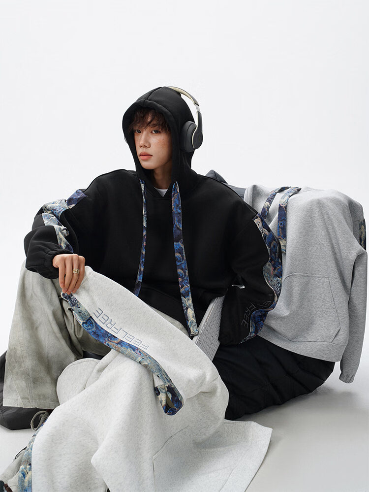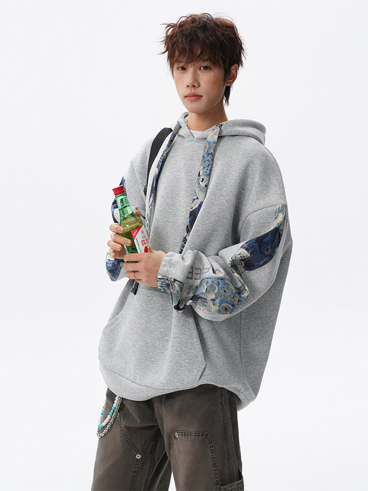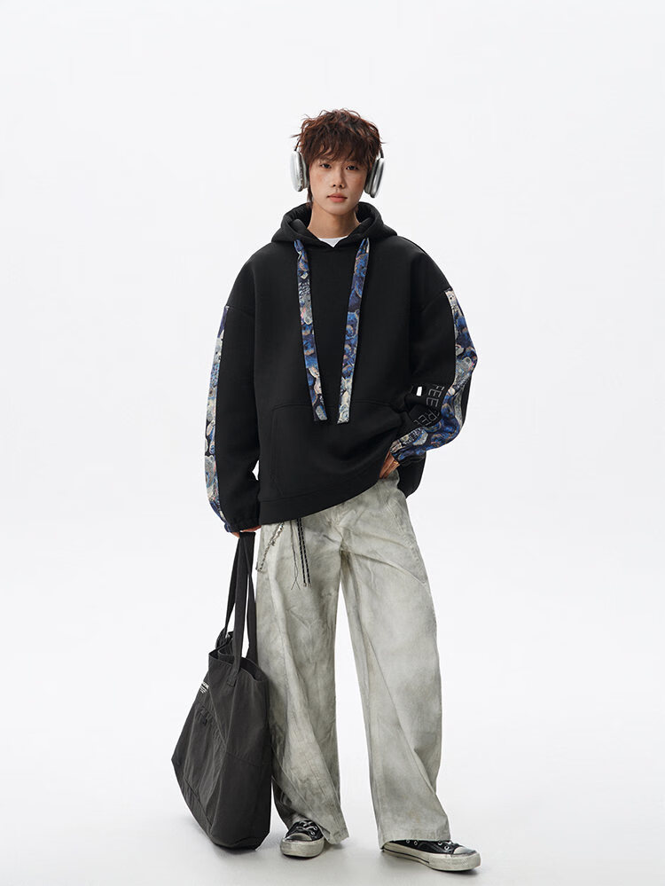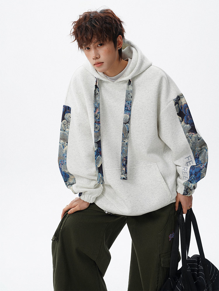 NEW OR MODE国潮小熊花纹拼接连帽卫衣男春秋美式撞色抽绳设计感宽松情侣外套 深灰色【高品质】 M 【建议90-110斤】