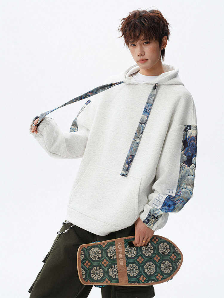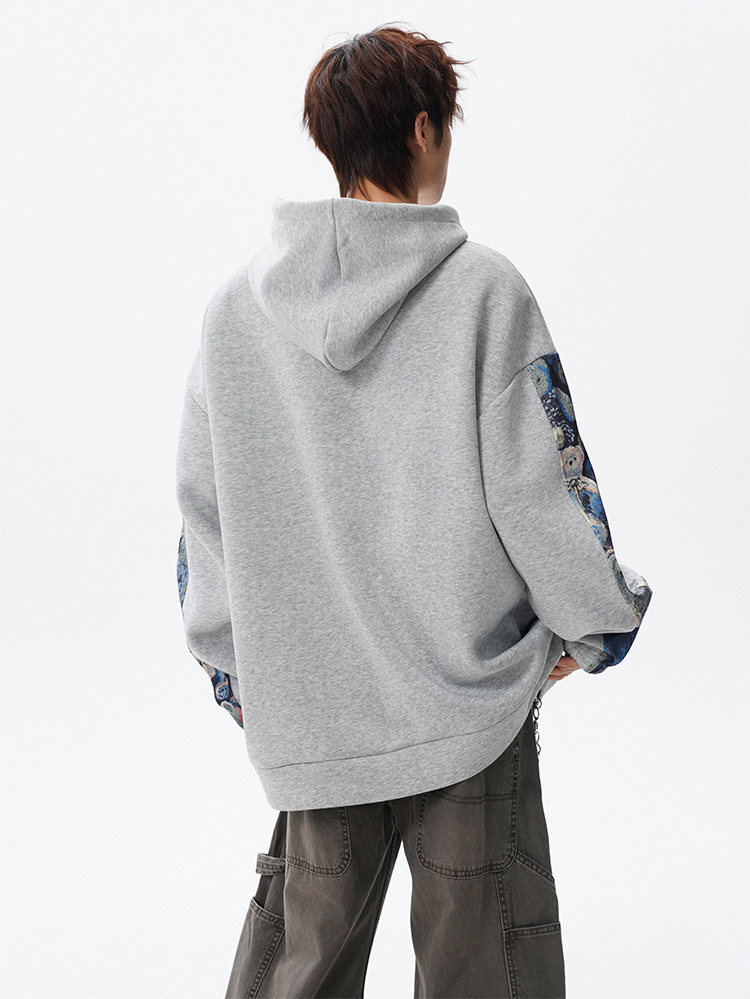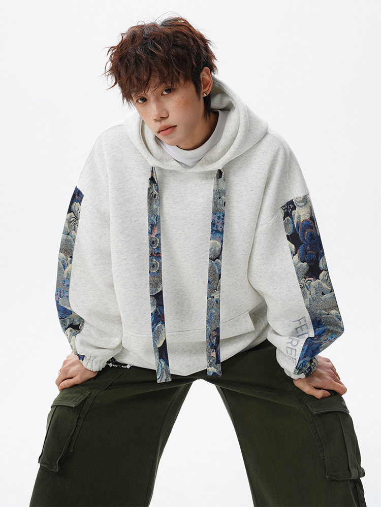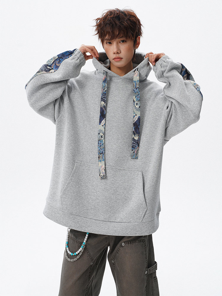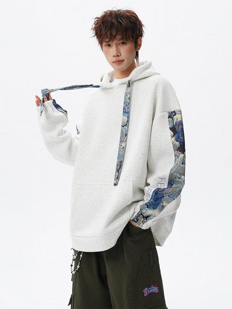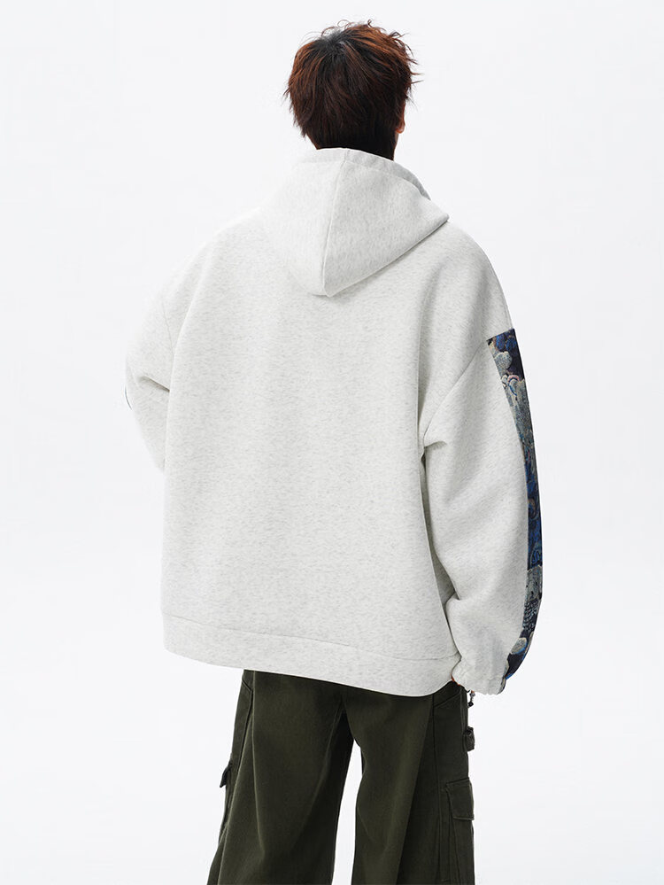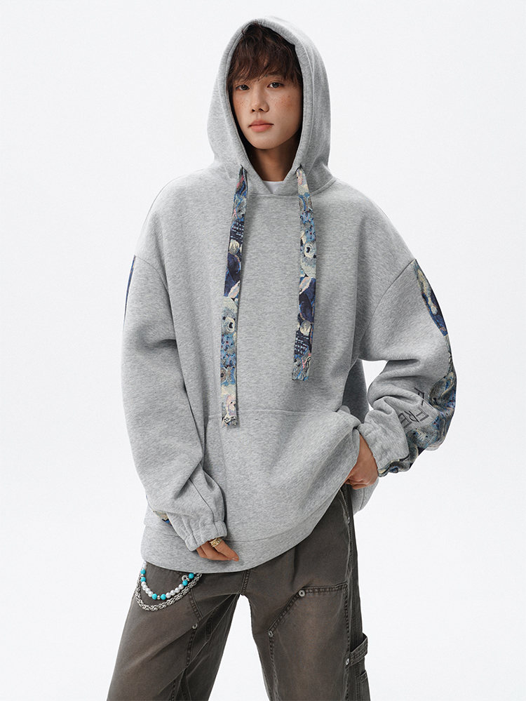 NEW OR MODE国潮小熊花纹拼接连帽卫衣男春秋美式撞色抽绳设计感宽松情侣外套 深灰色【高品质】 M 【建议90-110斤】