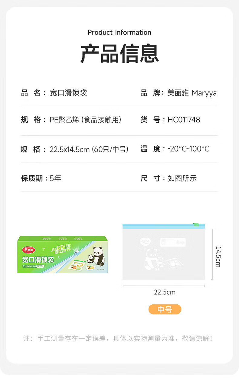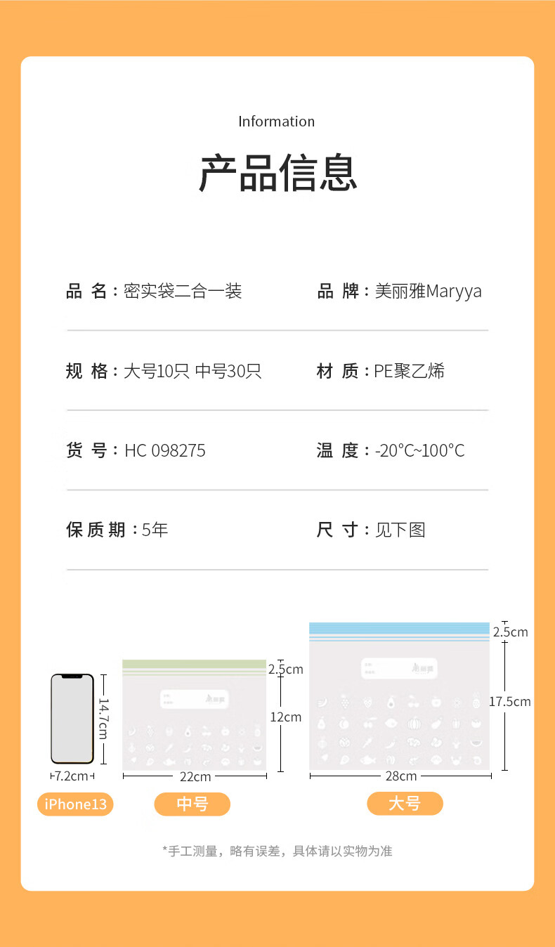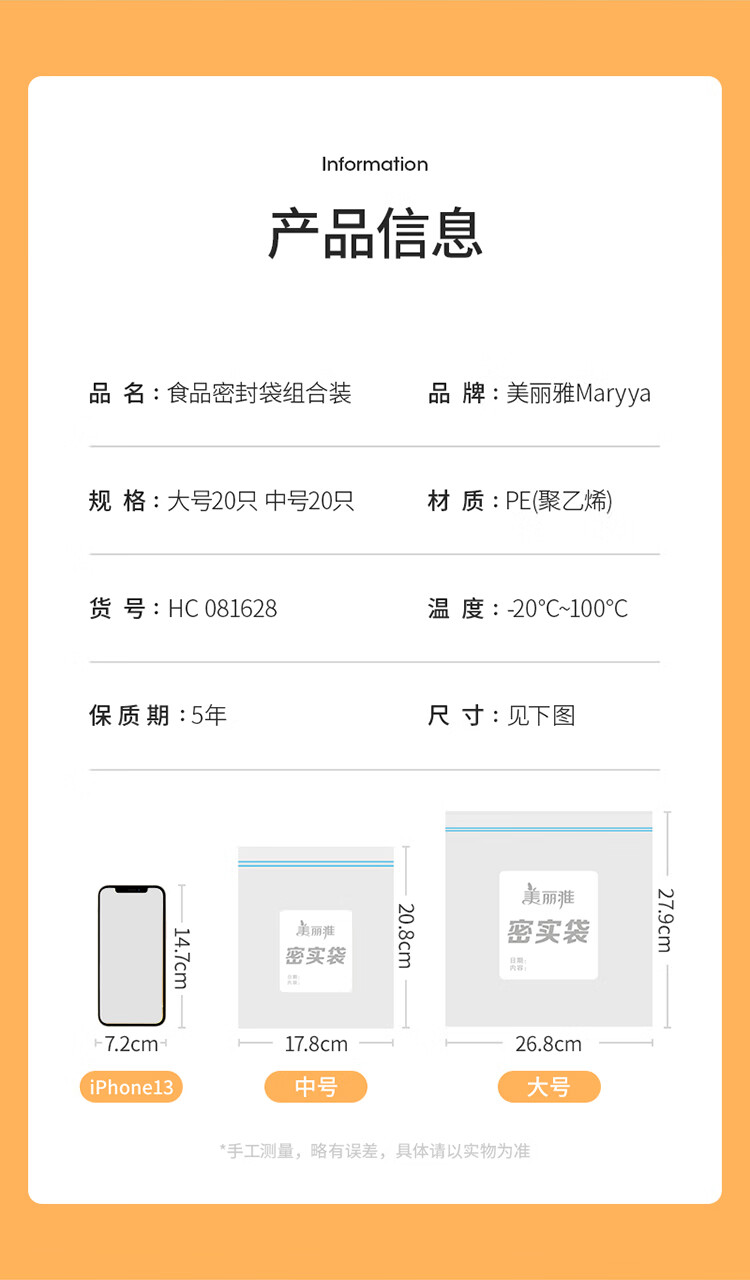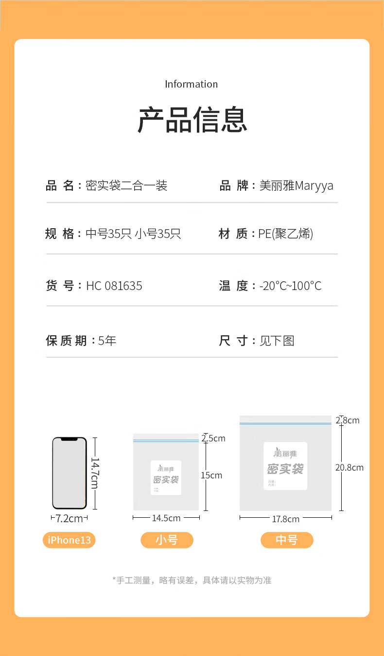 美丽雅(MARYYA)收纳袋 食品级加厚自封袋 家用厨房分装收纳袋防水防潮可微波炉 【小号35只+中号55只+大号20只】共110只