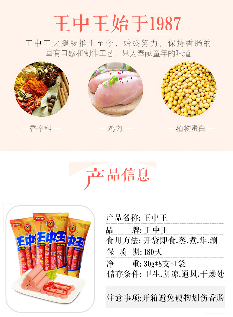 王中王优级火腿肠即食猪肉肠户外旅游休闲便携零食泡面搭档香肠配螺蛳粉 30g*8根*3袋【元气满满】