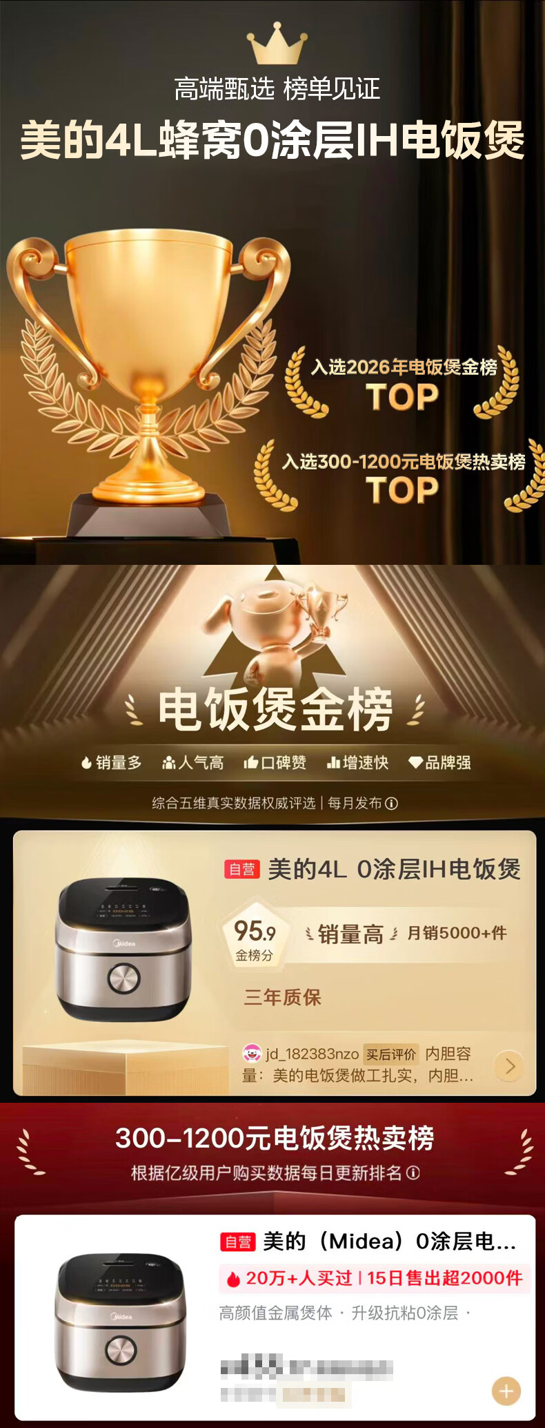 美的(Midea)0涂层电饭煲IH加热无涂层4L大容量316L不锈钢蜂窝内胆家用多功能智能3-4人4-5人电饭锅MB-HC459S