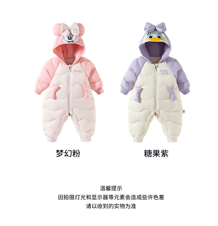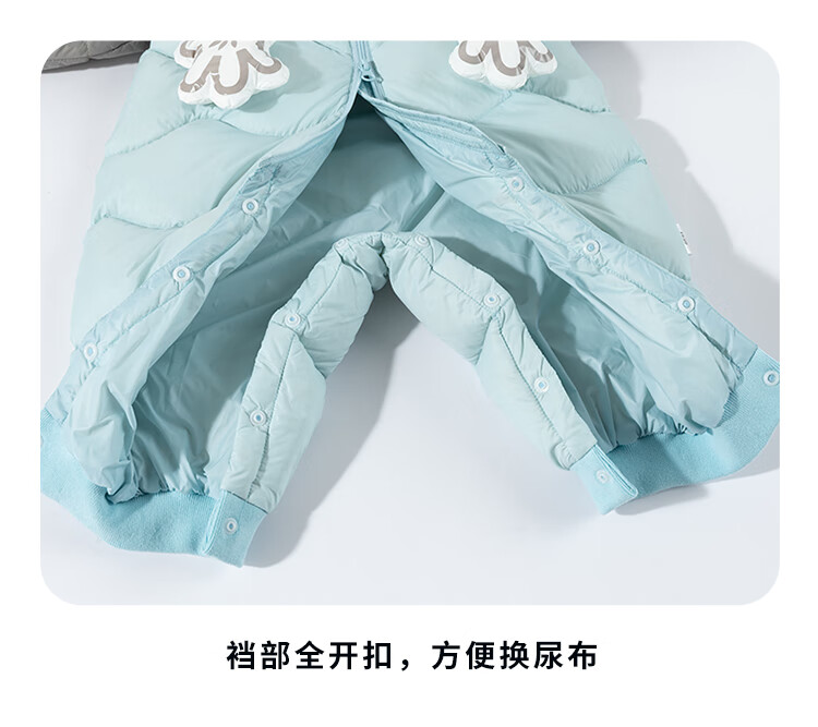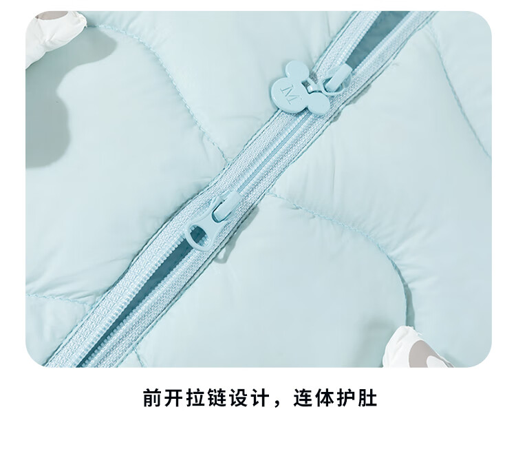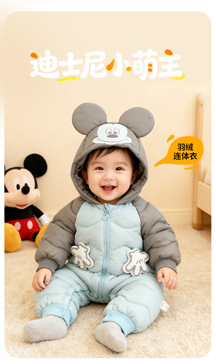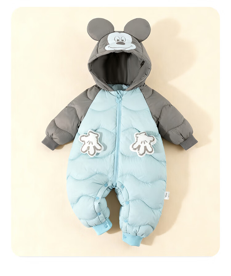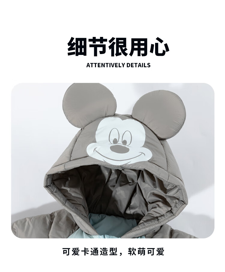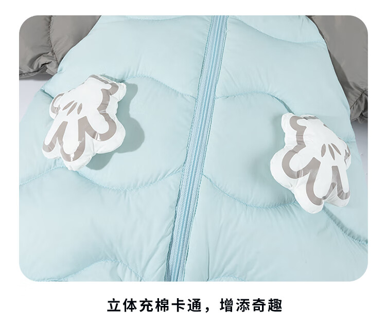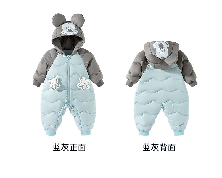 迪士尼(Disney)婴儿宝宝拼色可爱保暖90白鸭绒羽绒服连帽设计立体卡通连 蓝灰色 80 (建议9-15个月身高73-80cm)