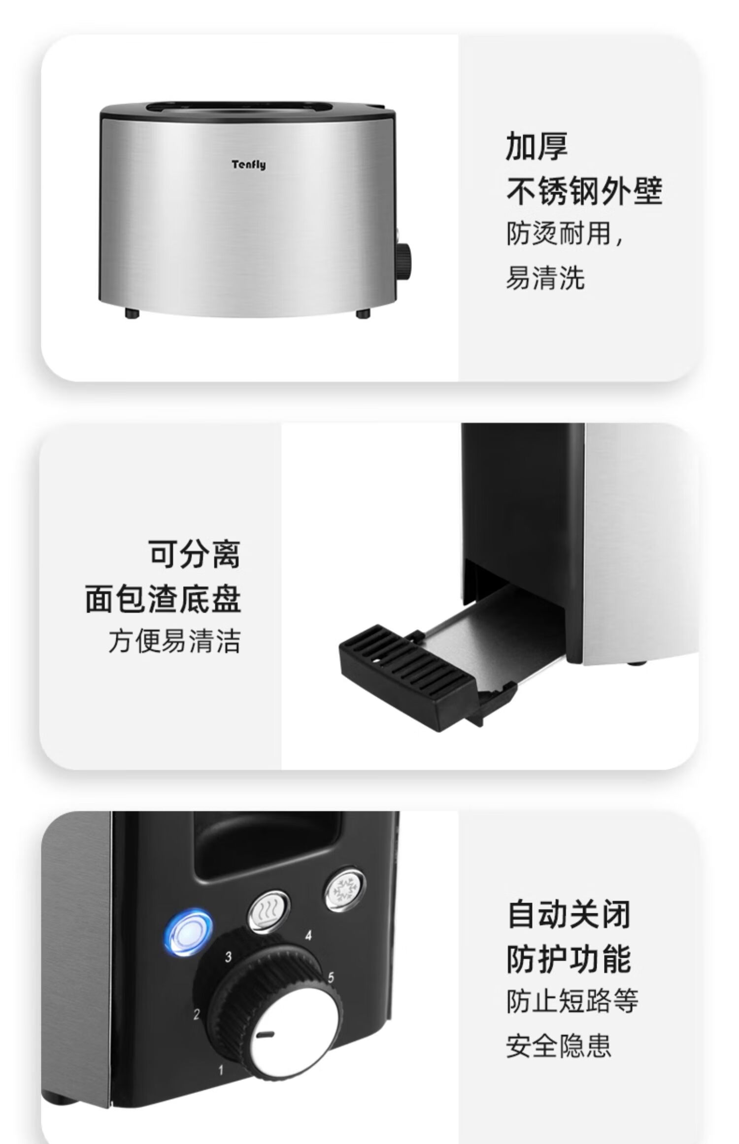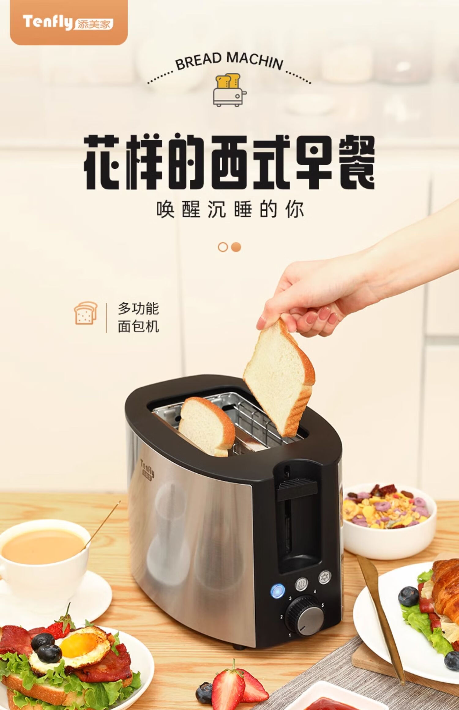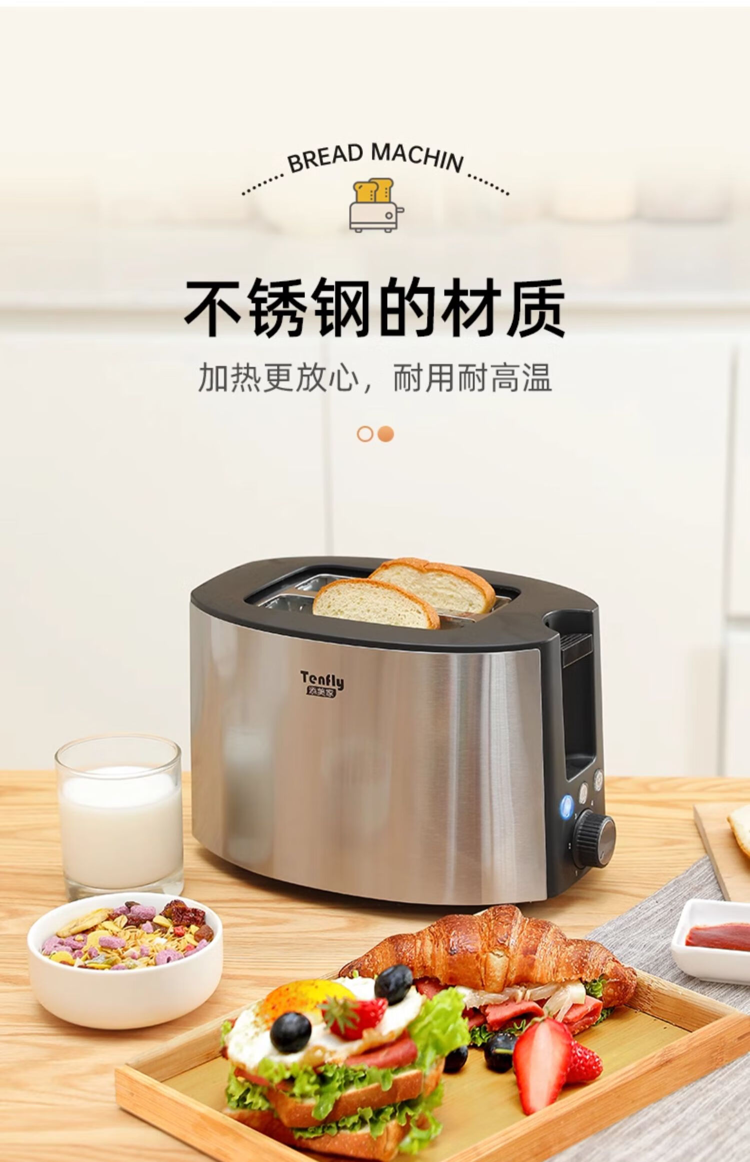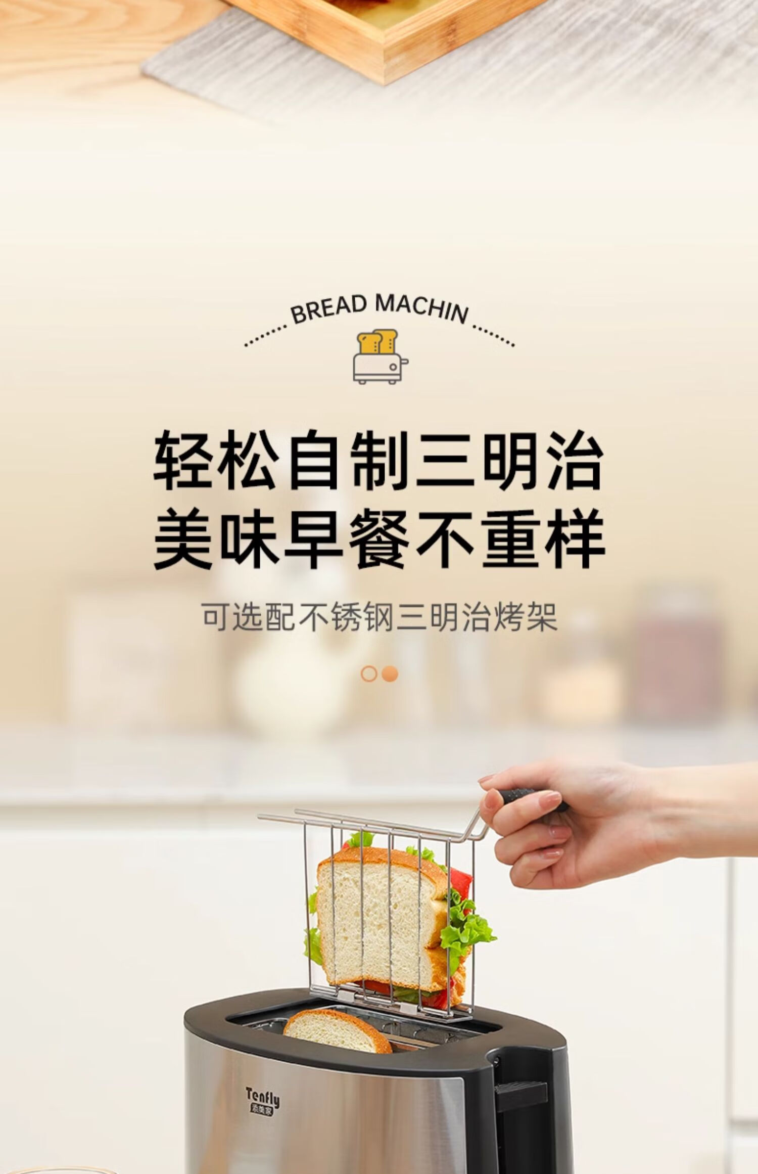 Tenfly早餐机多士炉烤面包机多档烘烤不锈钢烤面包片机烤三明治面包片 全自动家用吐司机多功能一体机 家商两用 加宽4片面包槽 含实用4件套