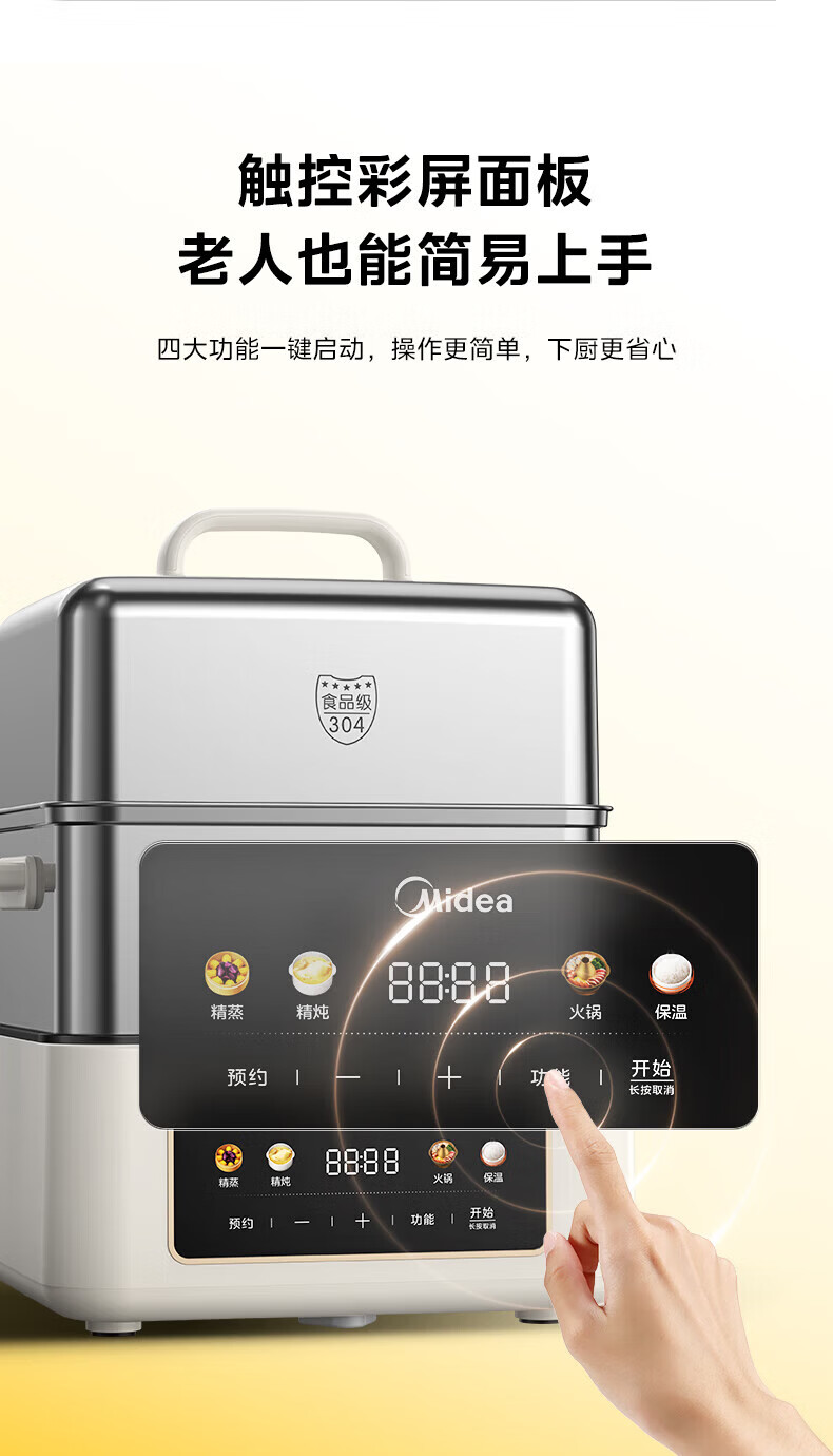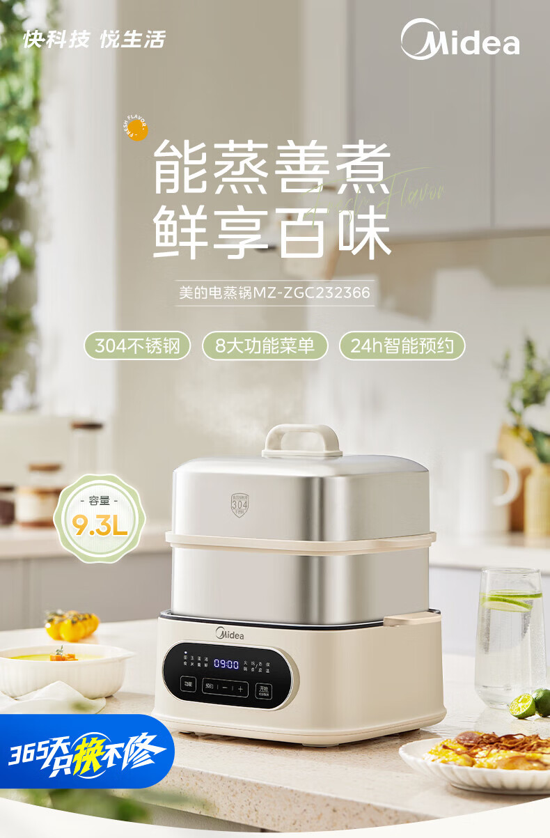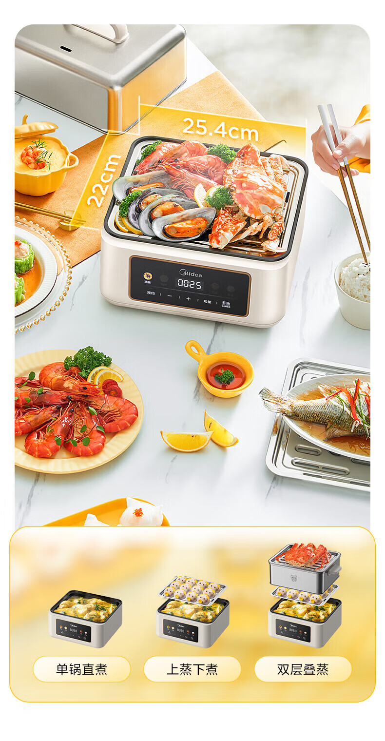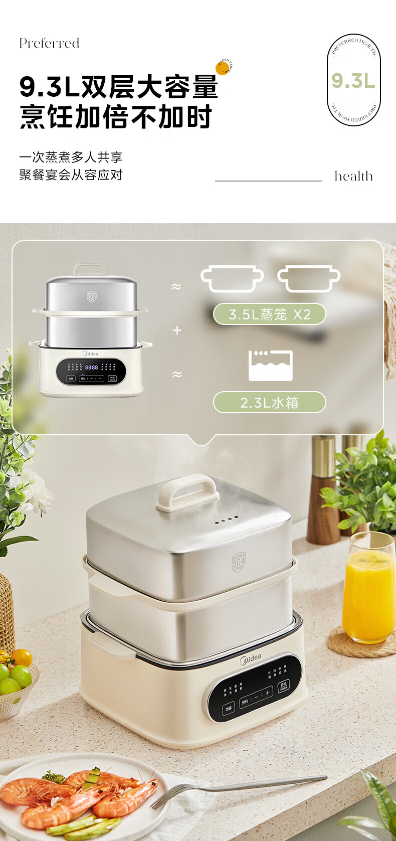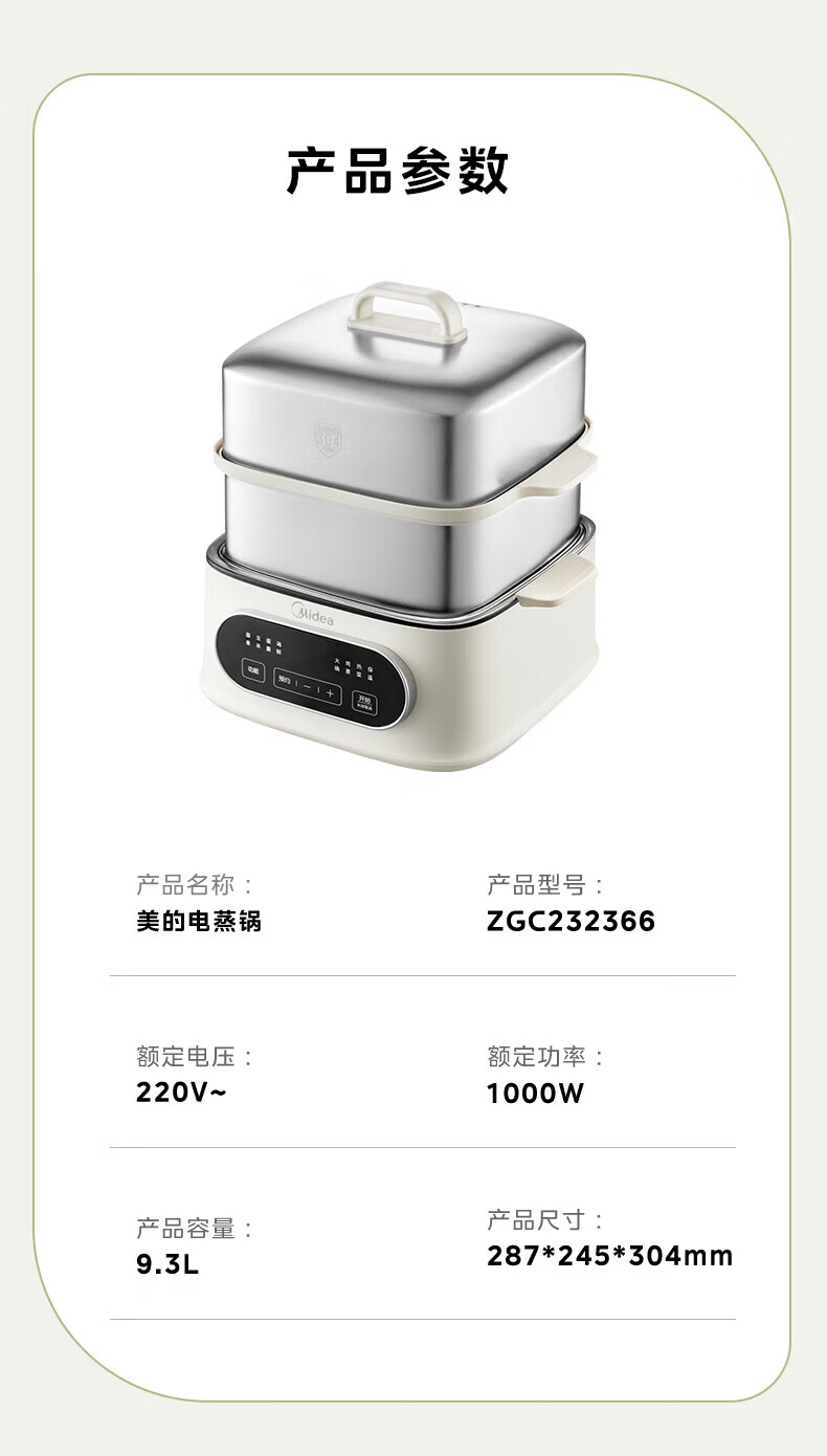 美的(Midea)电蒸锅炖蒸煮一体304不锈钢家用多功能电煮锅火锅自动保温定时早餐蒸蛋煮蛋器蒸鱼馒头包子蒸锅 9.3L 智能预约上蒸下炖ZGC232366