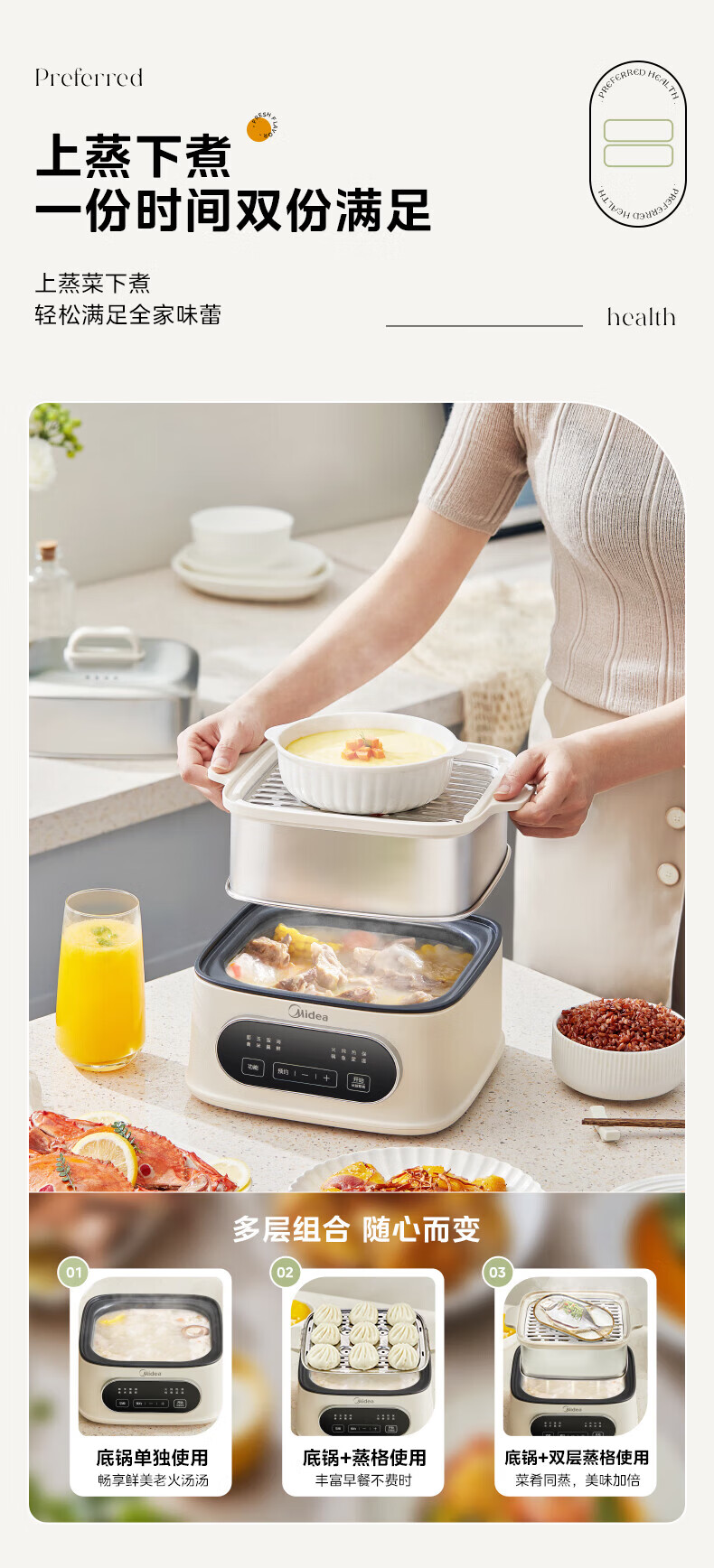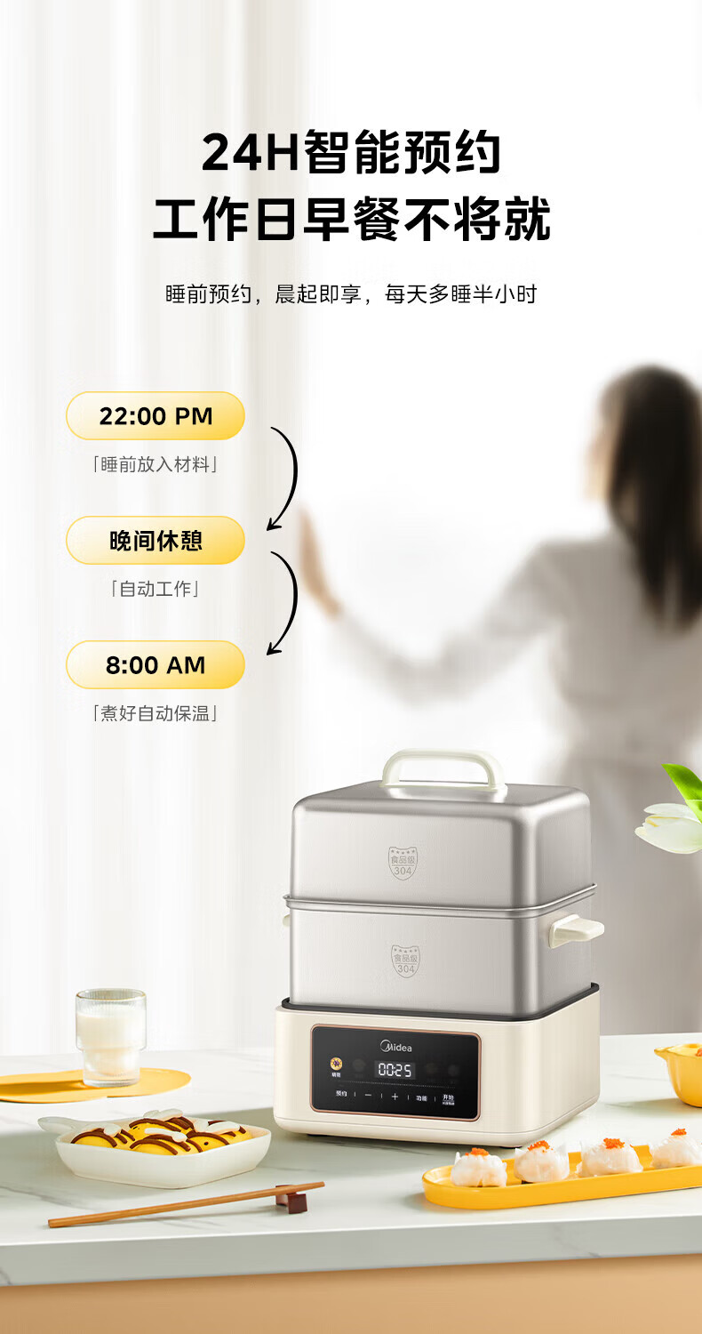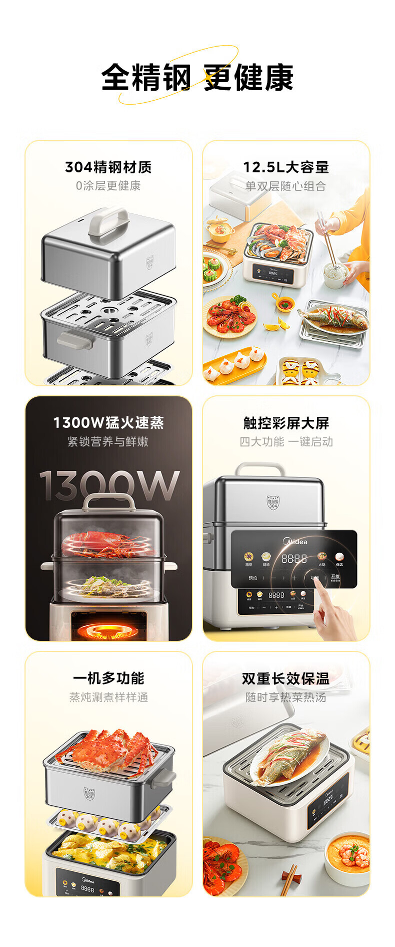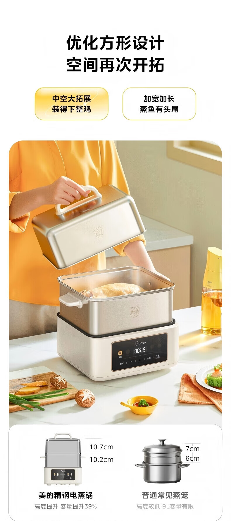 美的(Midea)电蒸锅炖蒸煮一体304不锈钢家用多功能电煮锅火锅自动保温定时早餐蒸蛋煮蛋器蒸鱼馒头包子蒸锅 9.3L 智能预约上蒸下炖ZGC232366